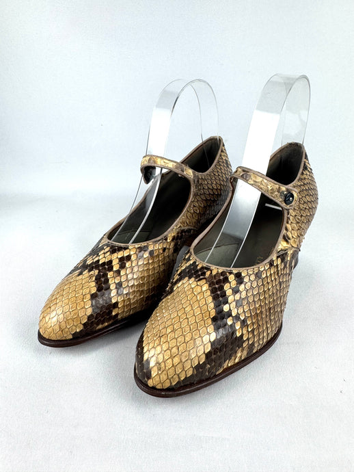 Original Deadstock 1930's Art Deco Mary Jane Style Snakeskin Shoes with Button Fastening - UK 3