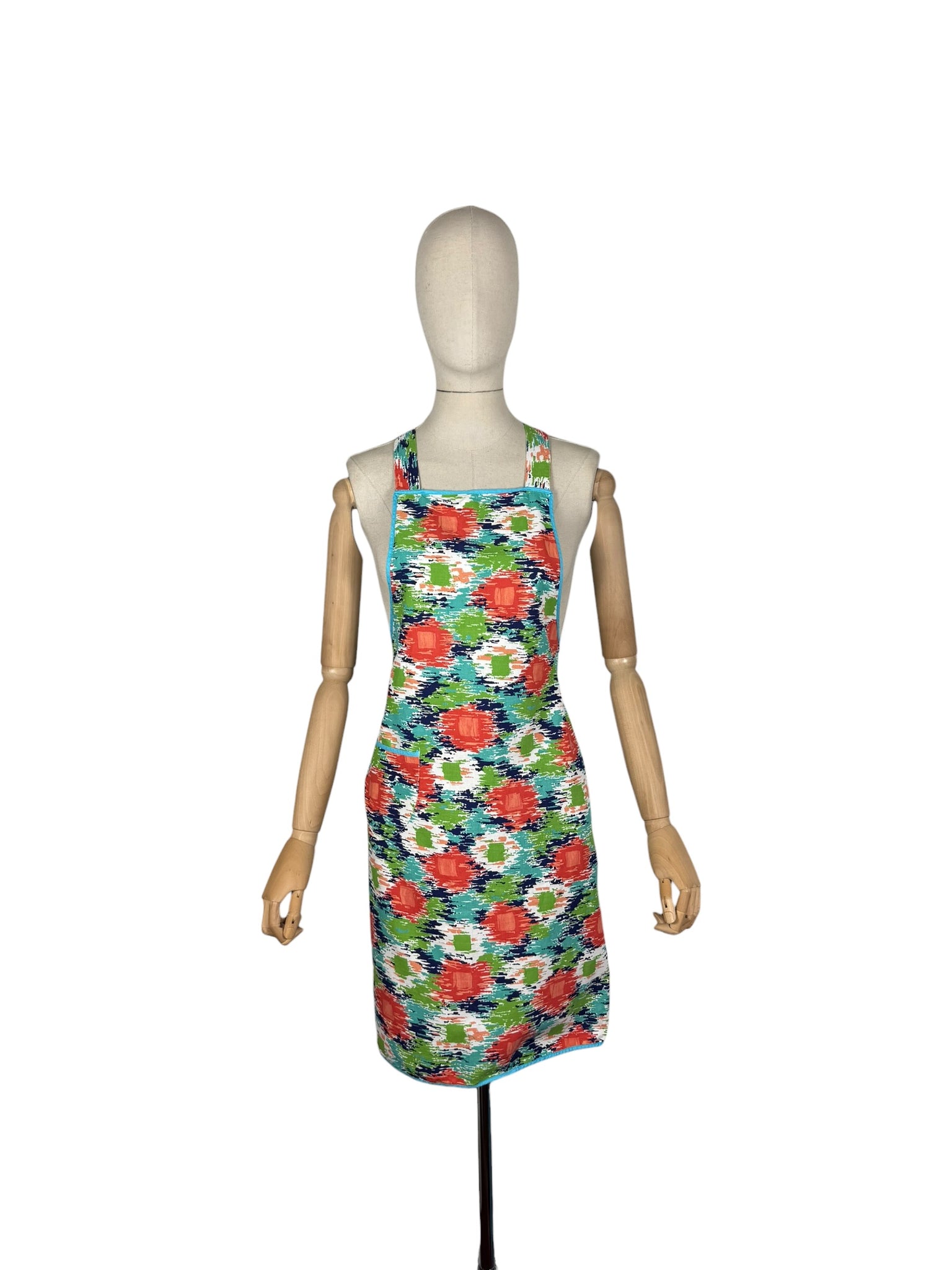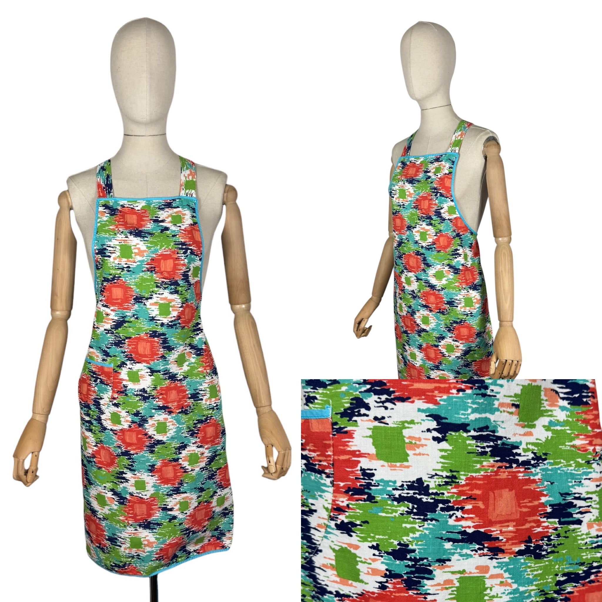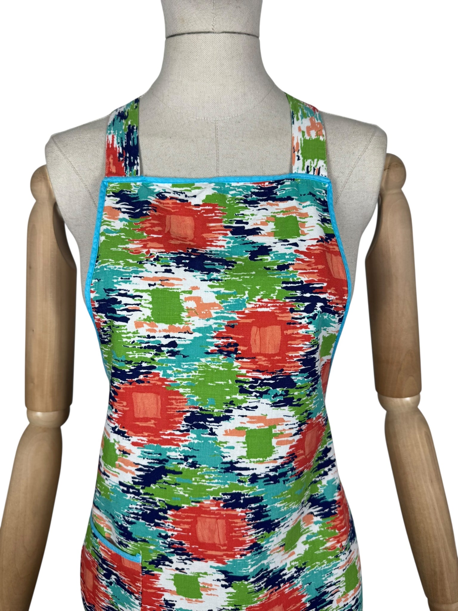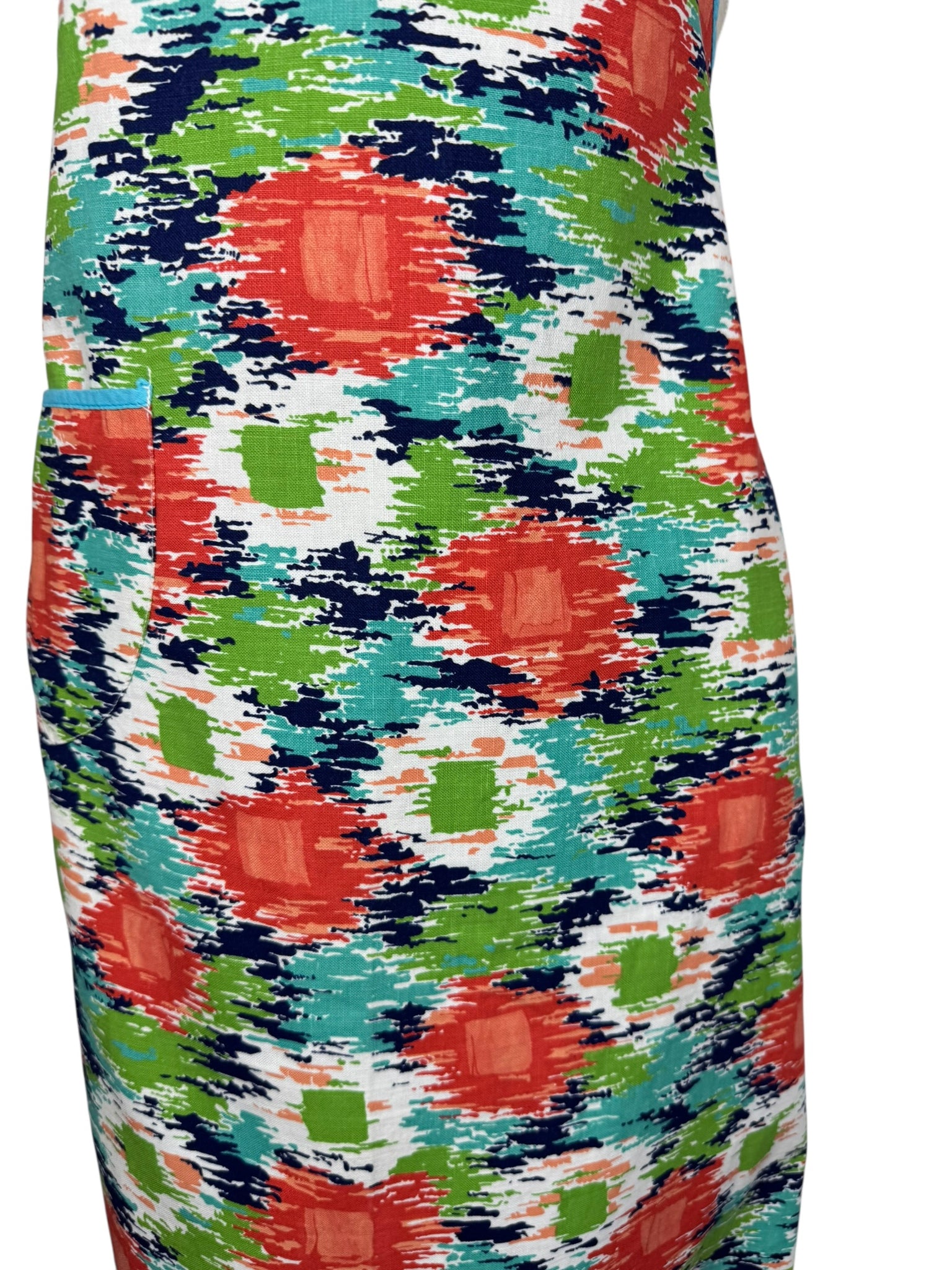 It has a fabulously vibrant abstract print in green, blue, turquoise and orange on a white base and the edges are bound with blue bias.