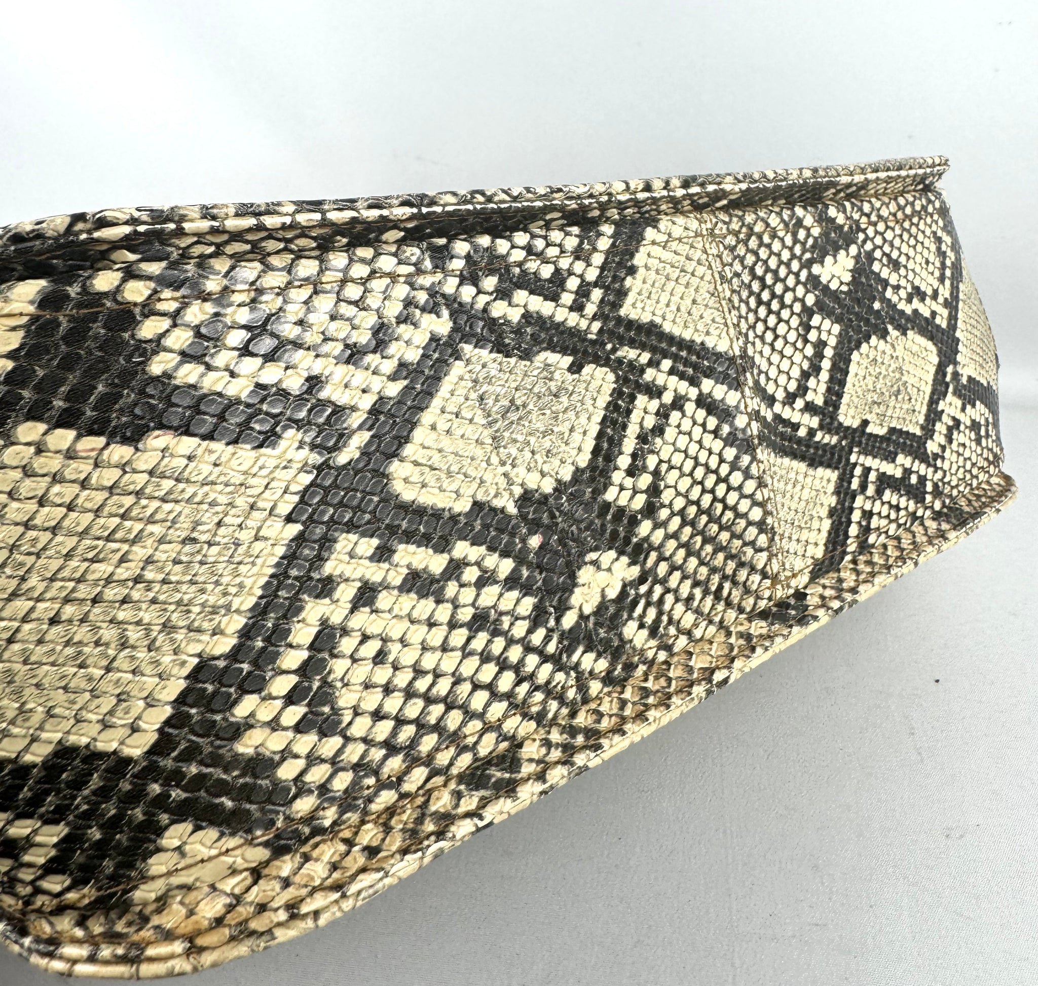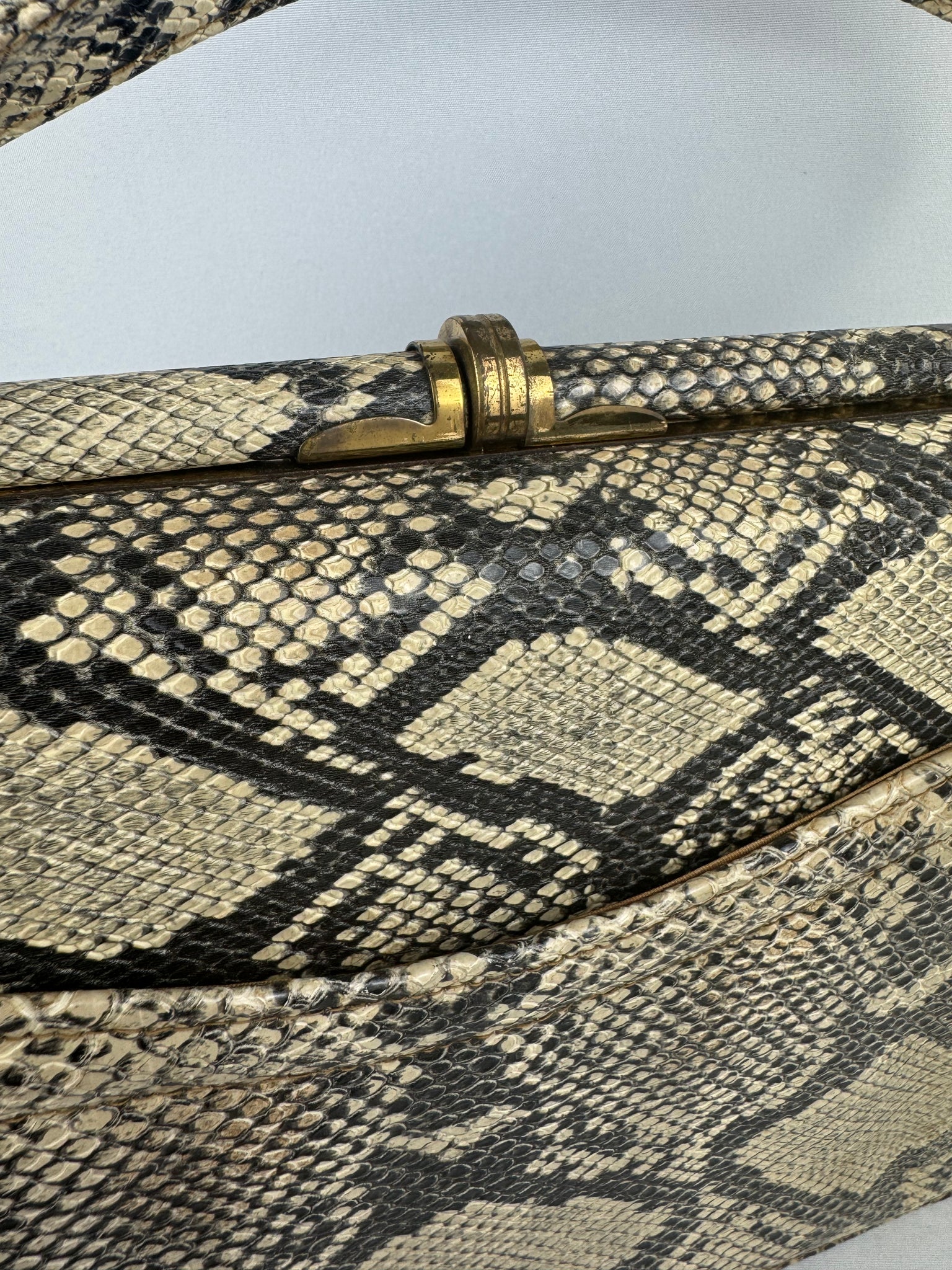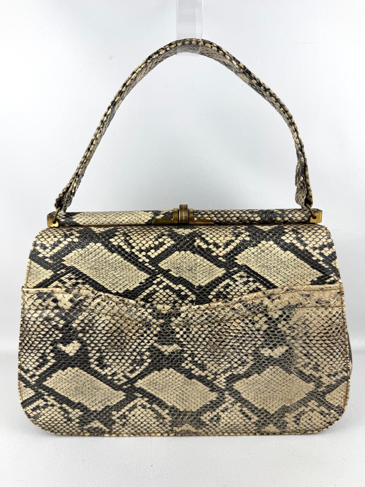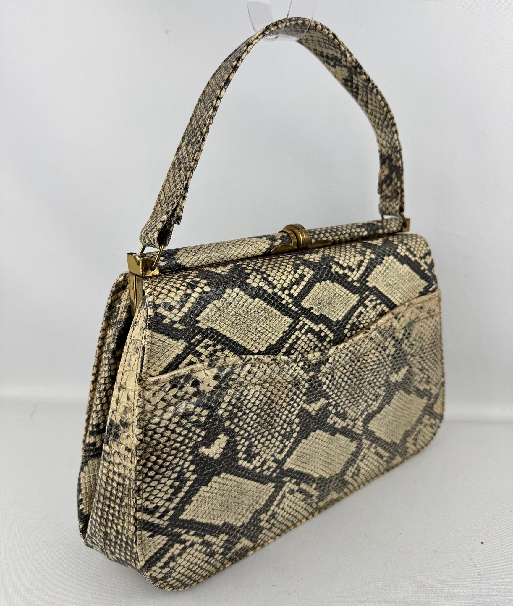 A large sized piece it is made from embossed plastic which has been coloured and patterned to look like snakeskin. It has a firm base, gold-tone fixings and clasp and a single handle.