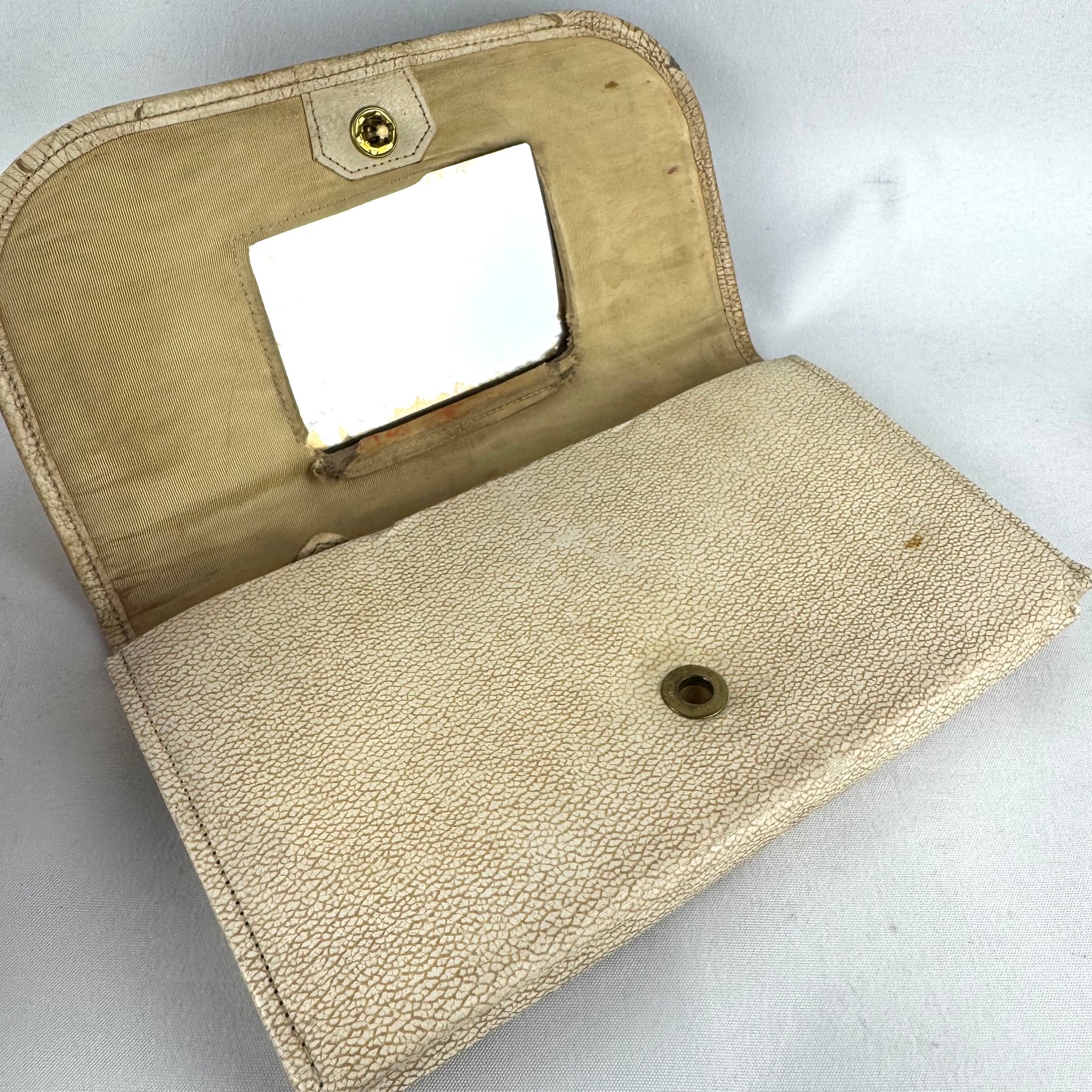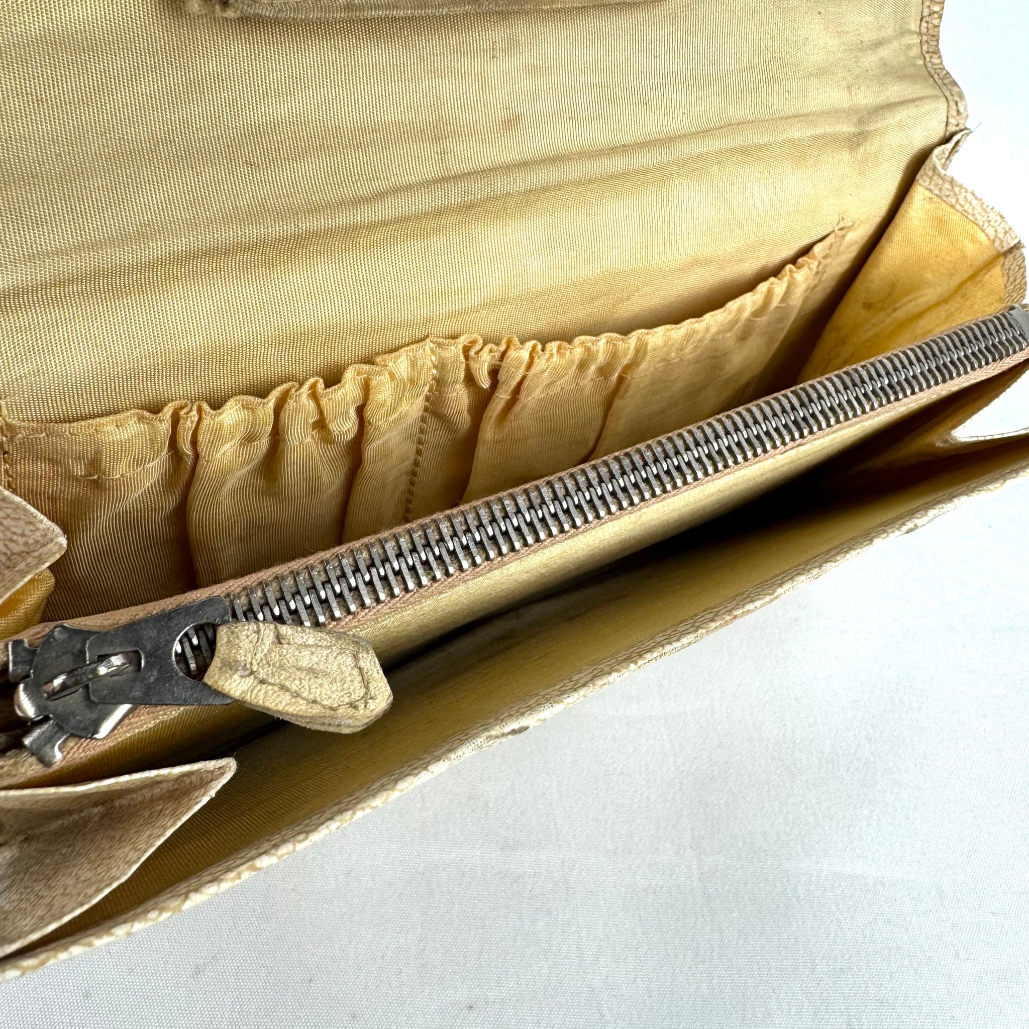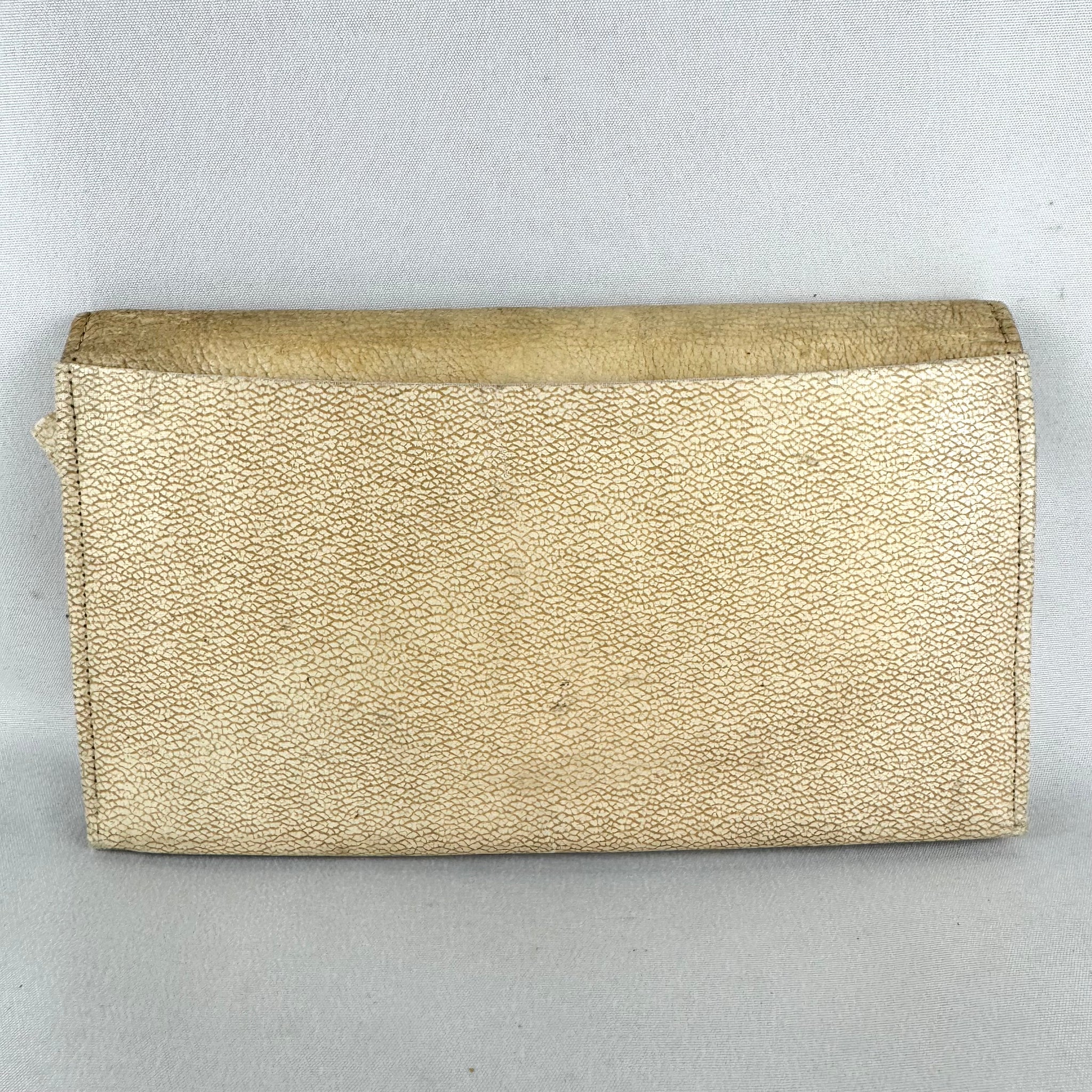 An envelope style design it fastens with a press stud and has a zip section, and two small side pockets, on the inner.