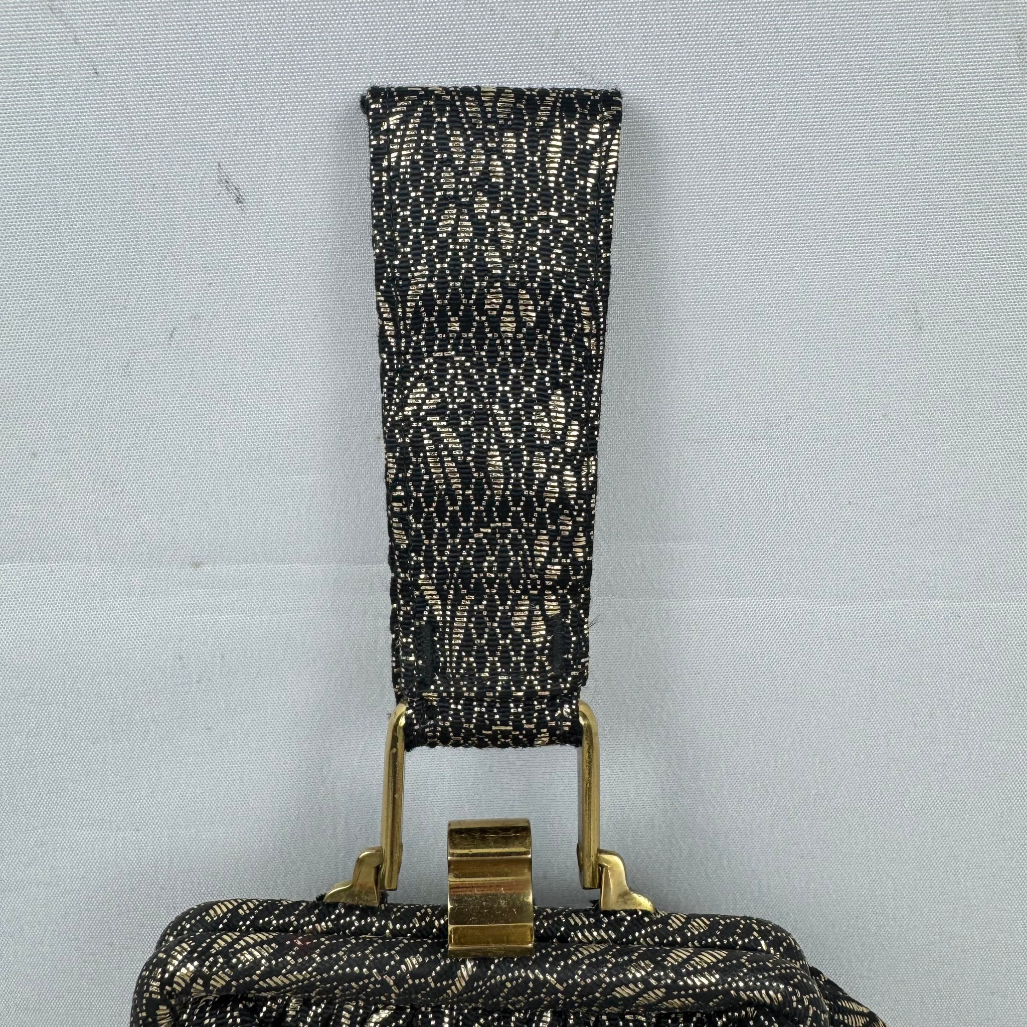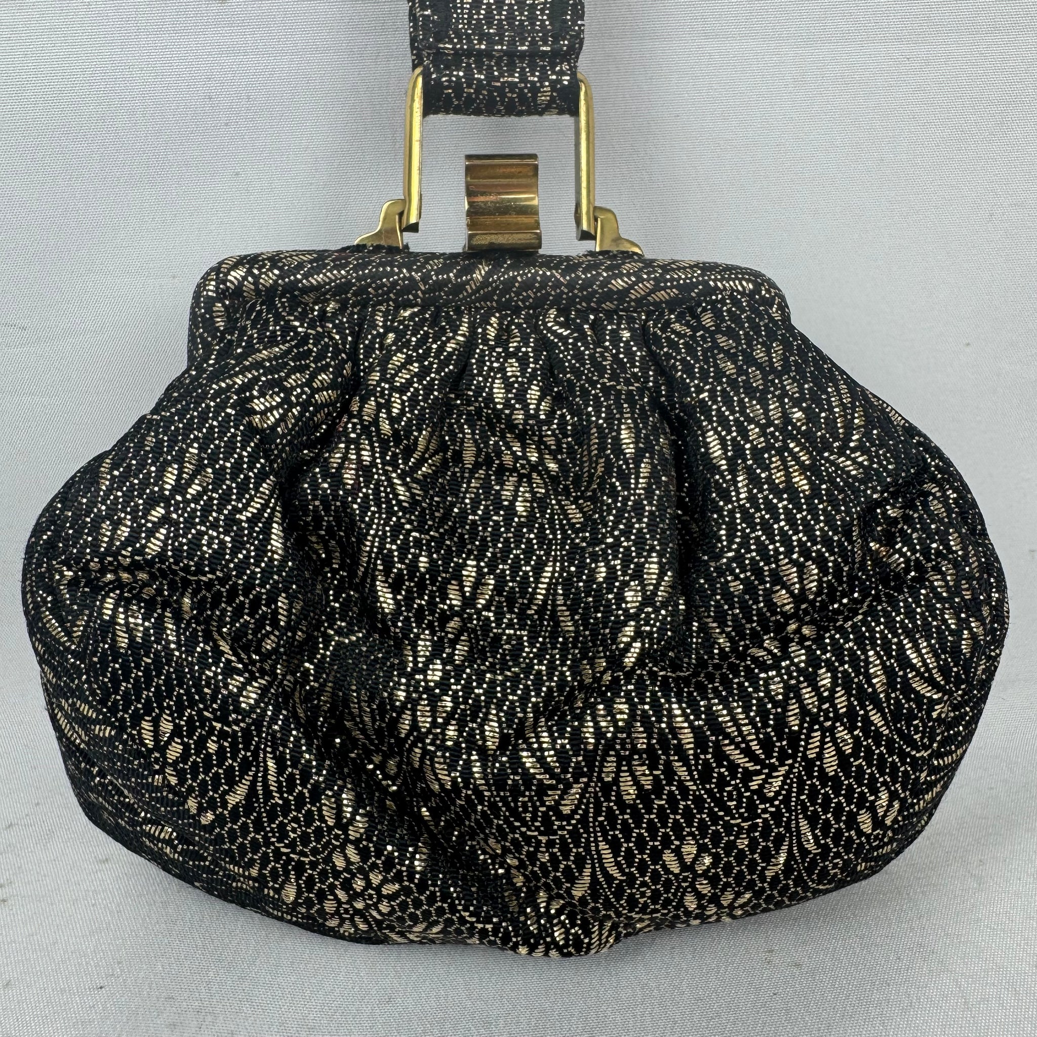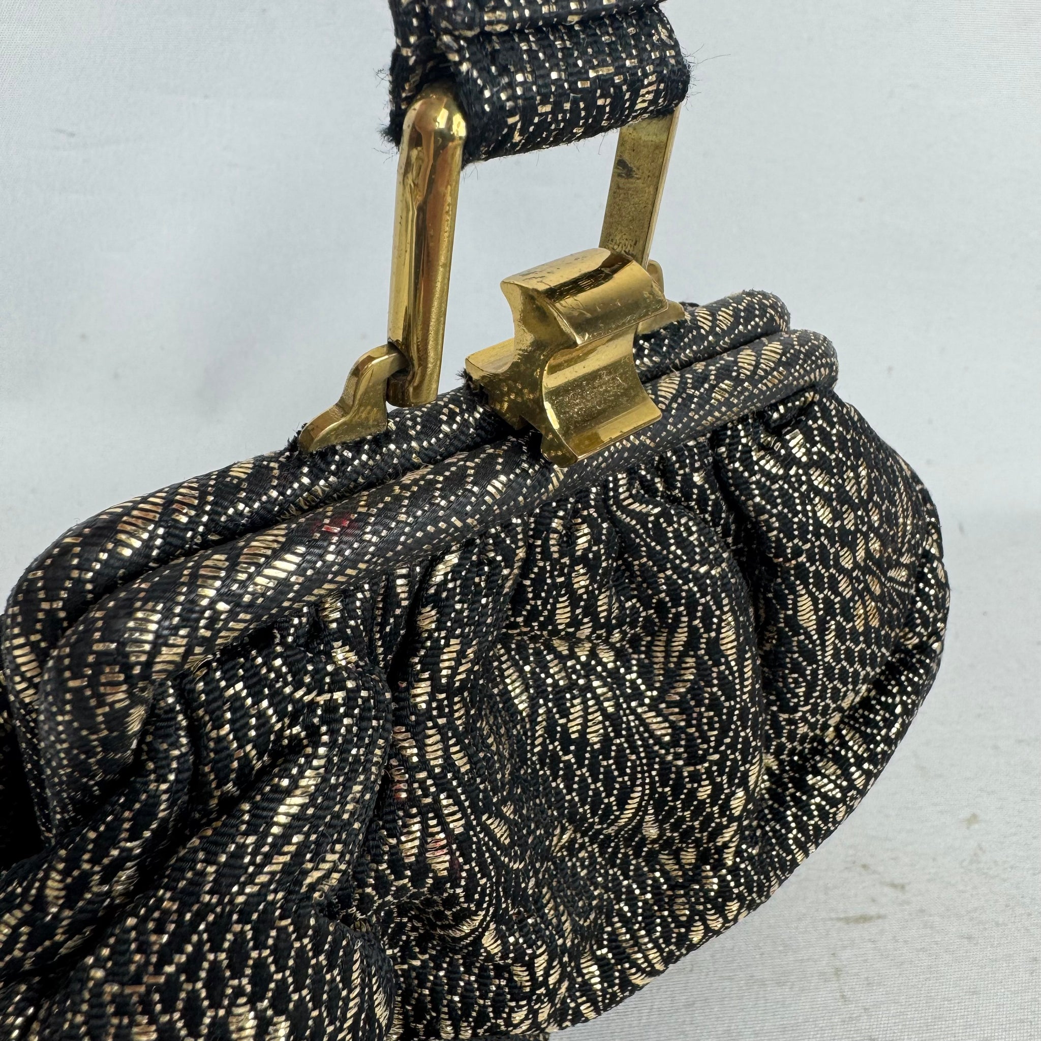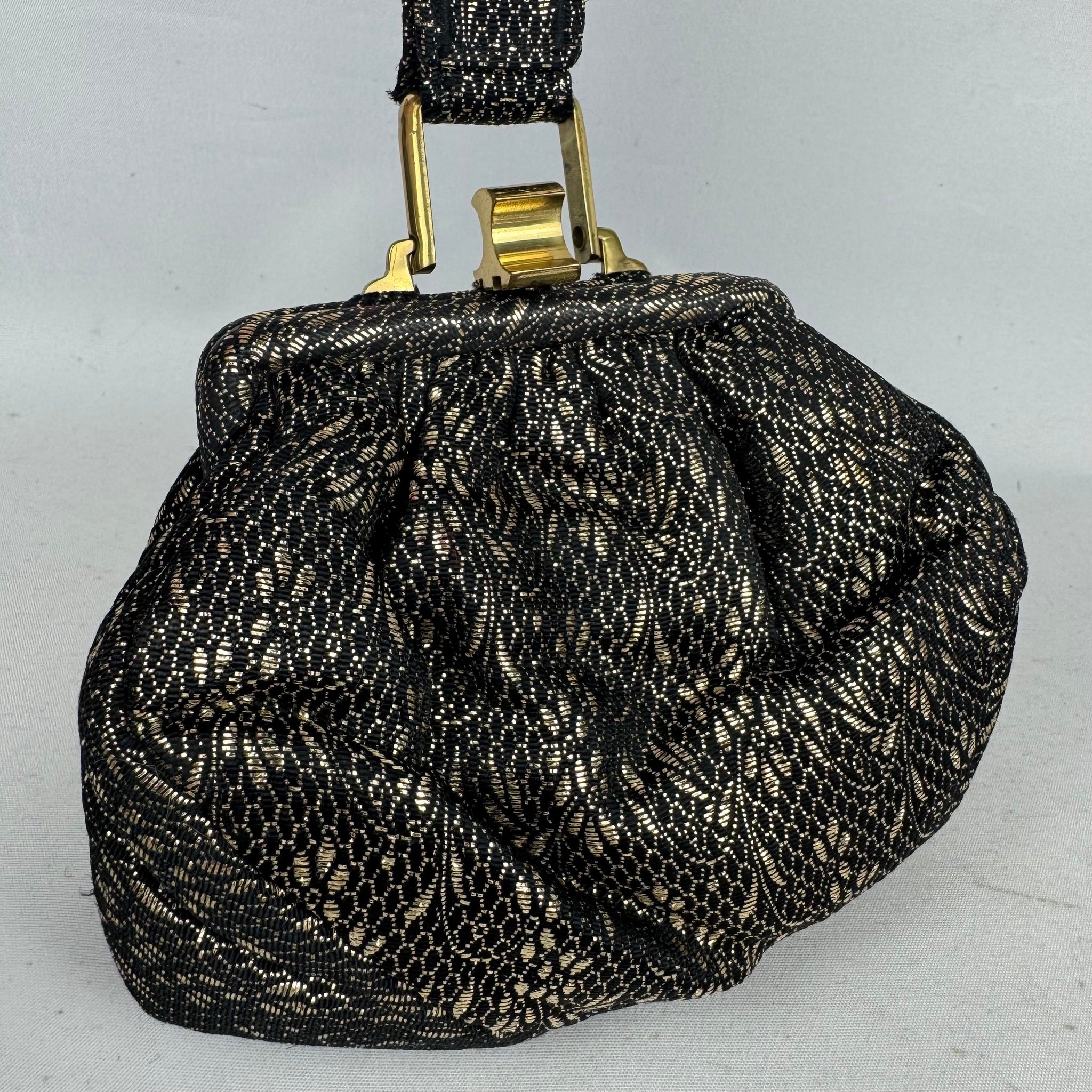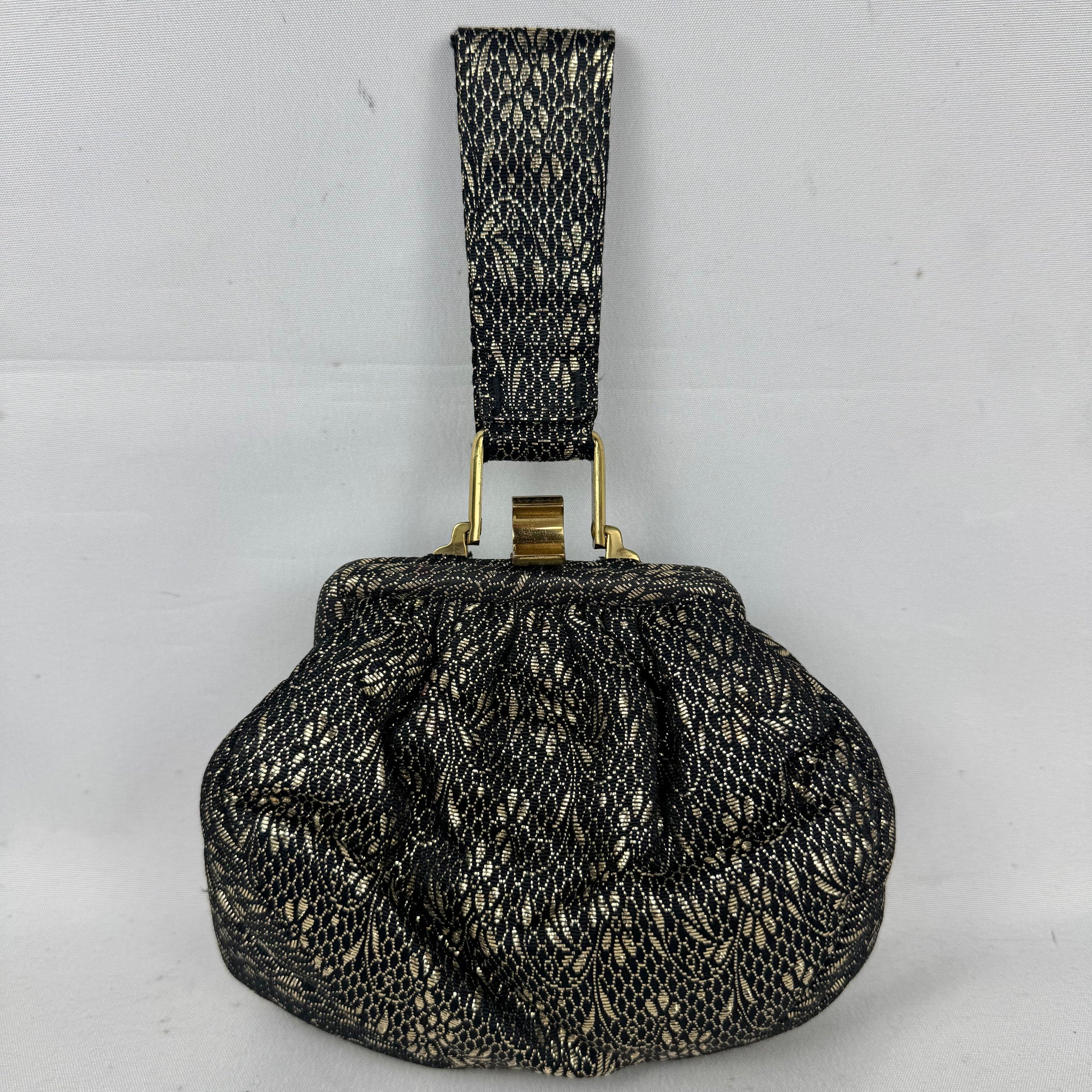 Made from black and gold fabric with a floral design it is fully lined with artificial silk, has a single top handle and gold-tone clasp.