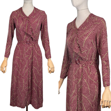 Original 1930's Art Deco Long Sleeved Belted Day Dress in Burgundy and Green - Bust 32 34