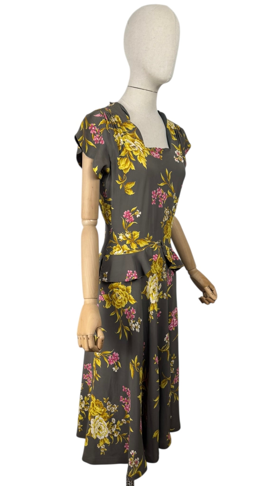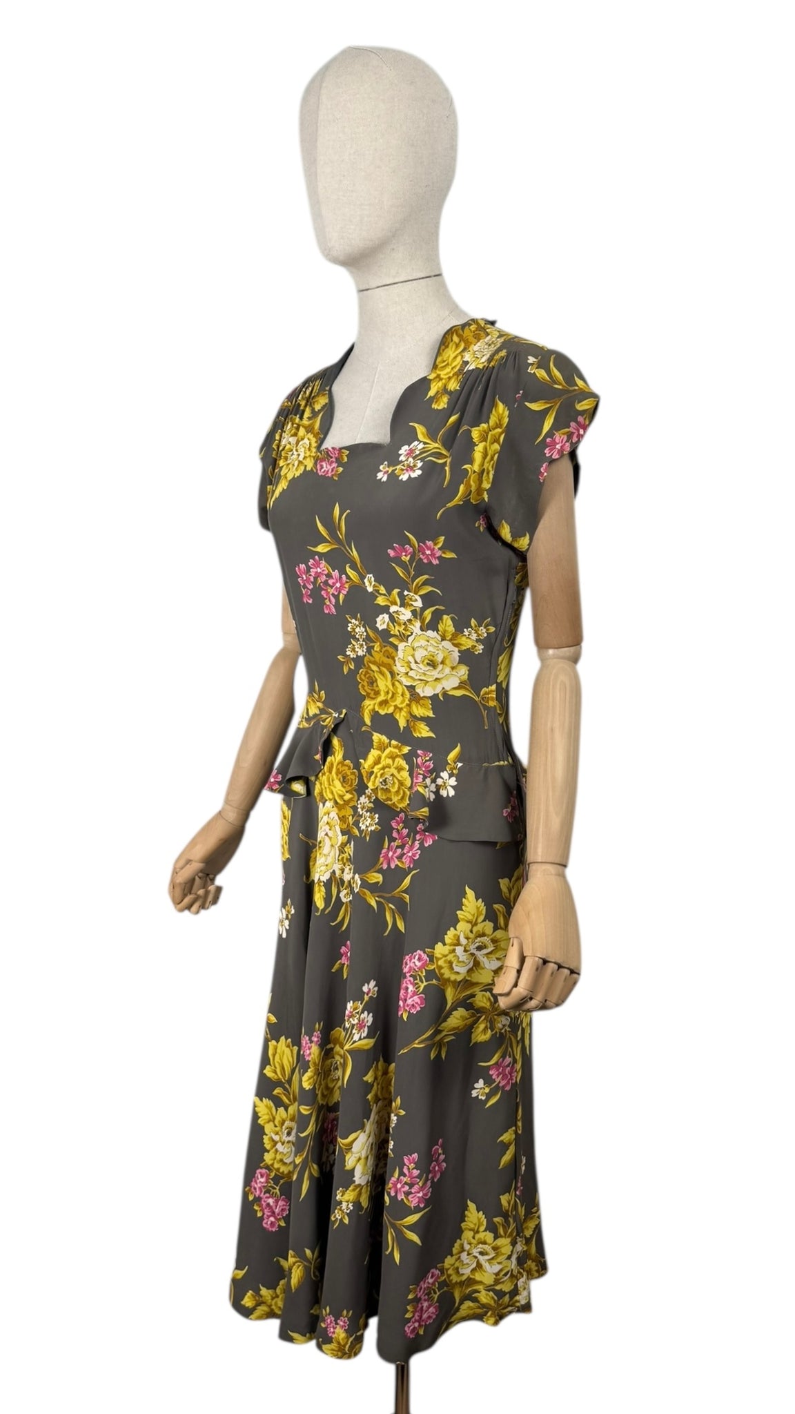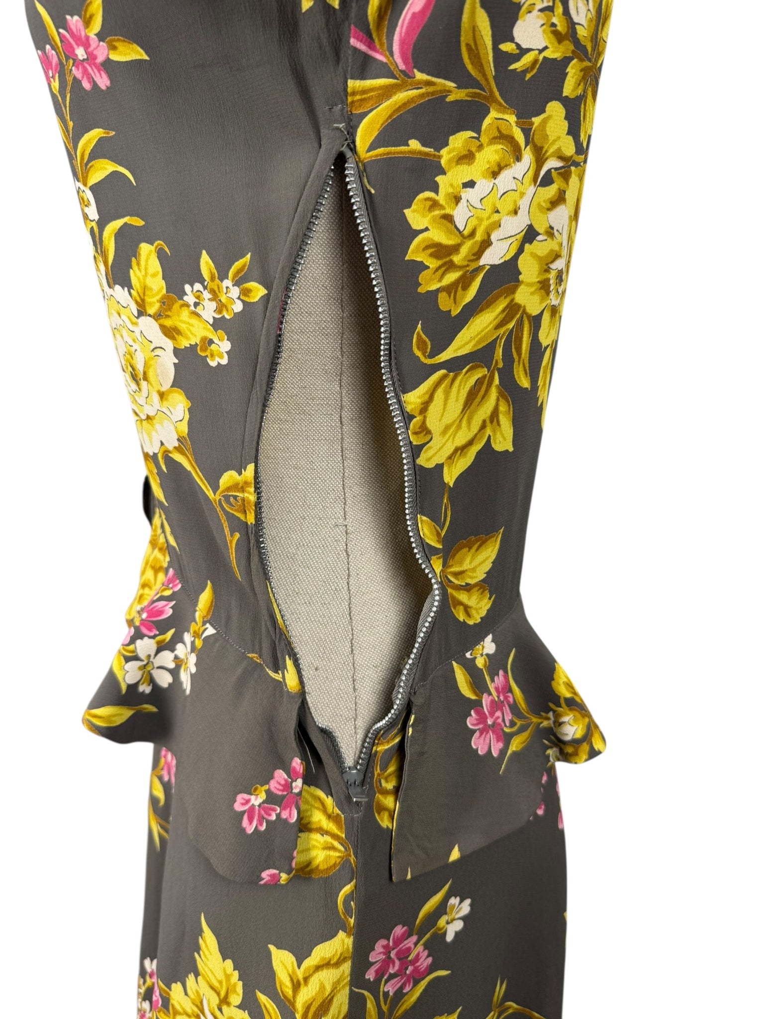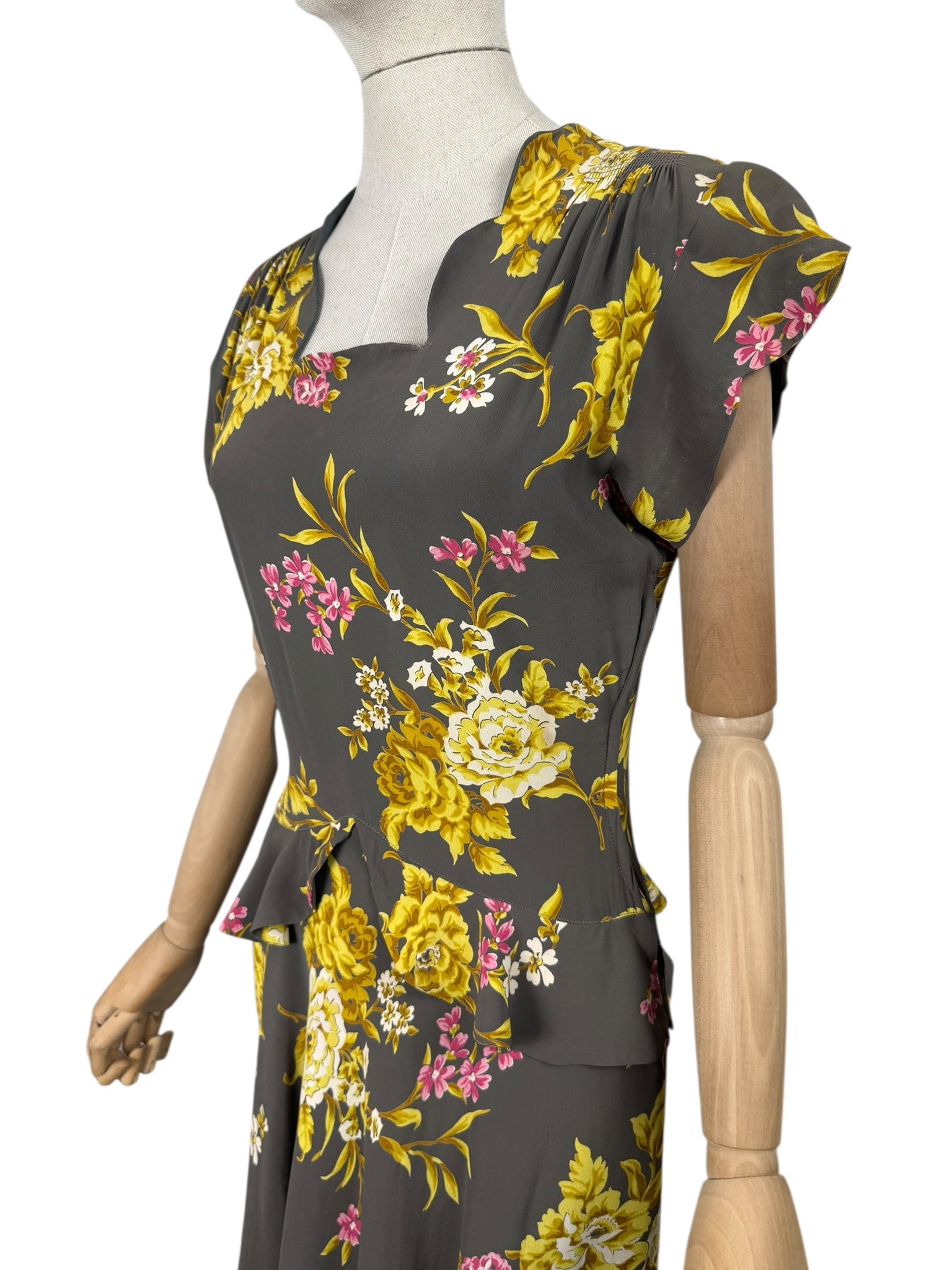 Made in the 1940's it is made from dark grey crepe and features a bold floral print in pink, white and mustard. The dress has a close fitting bodice with scalloped neckline and sleeve openings. It has fine shirring on the front yokes and fastens down the back and left side with metal zippers. It is finished off perfectly with a neat peplum.