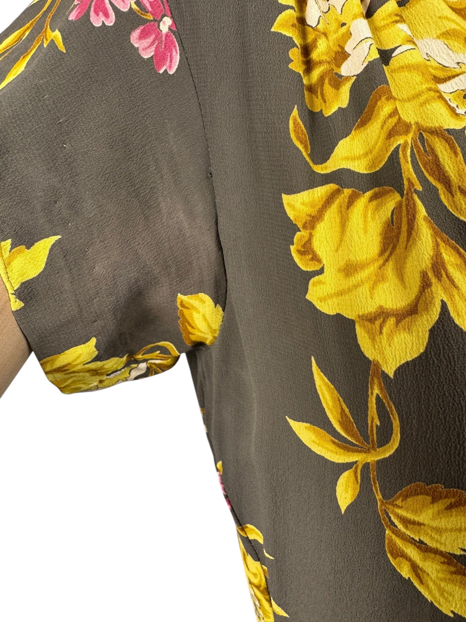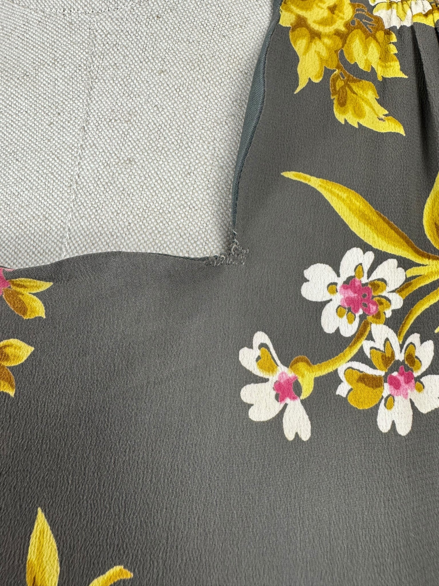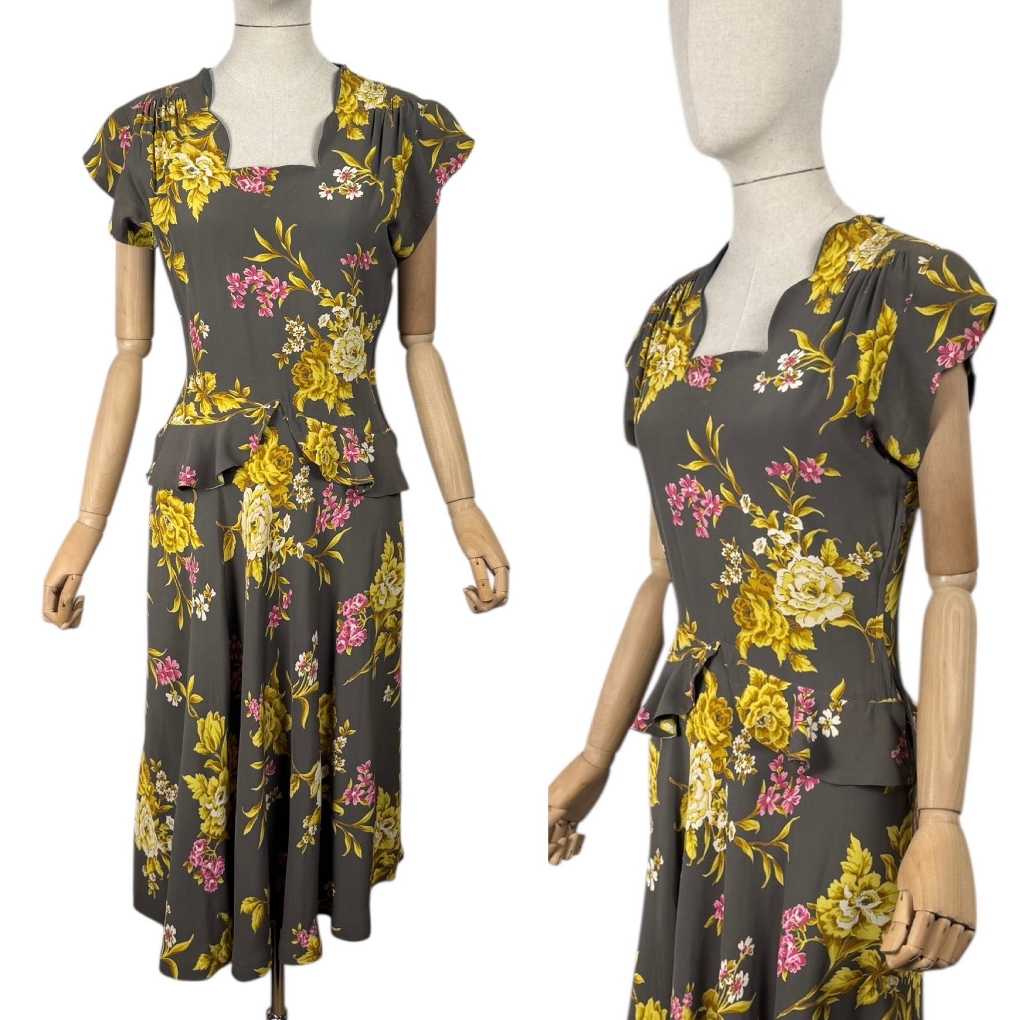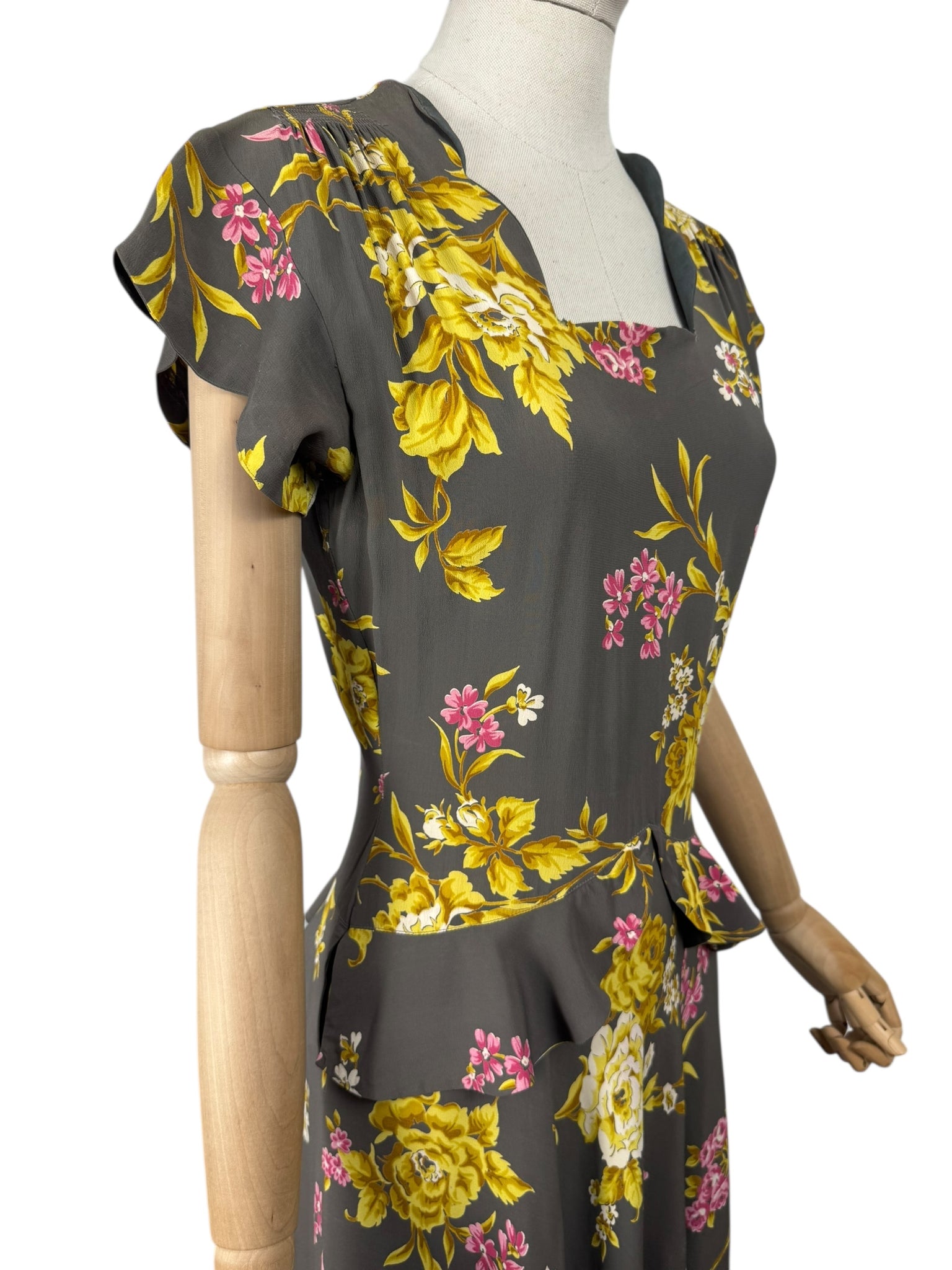 Made in the 1940's it is made from dark grey crepe and features a bold floral print in pink, white and mustard. The dress has a close fitting bodice with scalloped neckline and sleeve openings. It has fine shirring on the front yokes and fastens down the back and left side with metal zippers. It is finished off perfectly with a neat peplum.