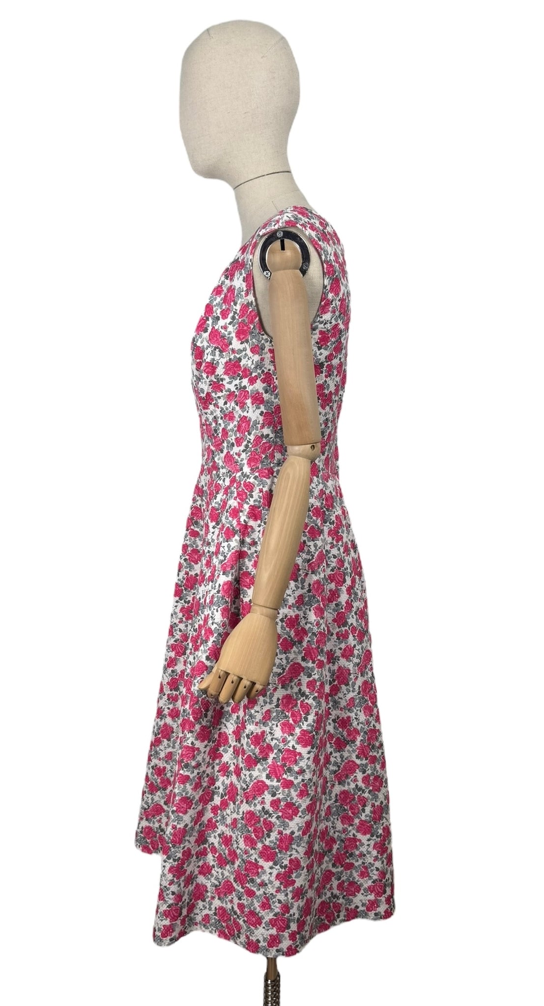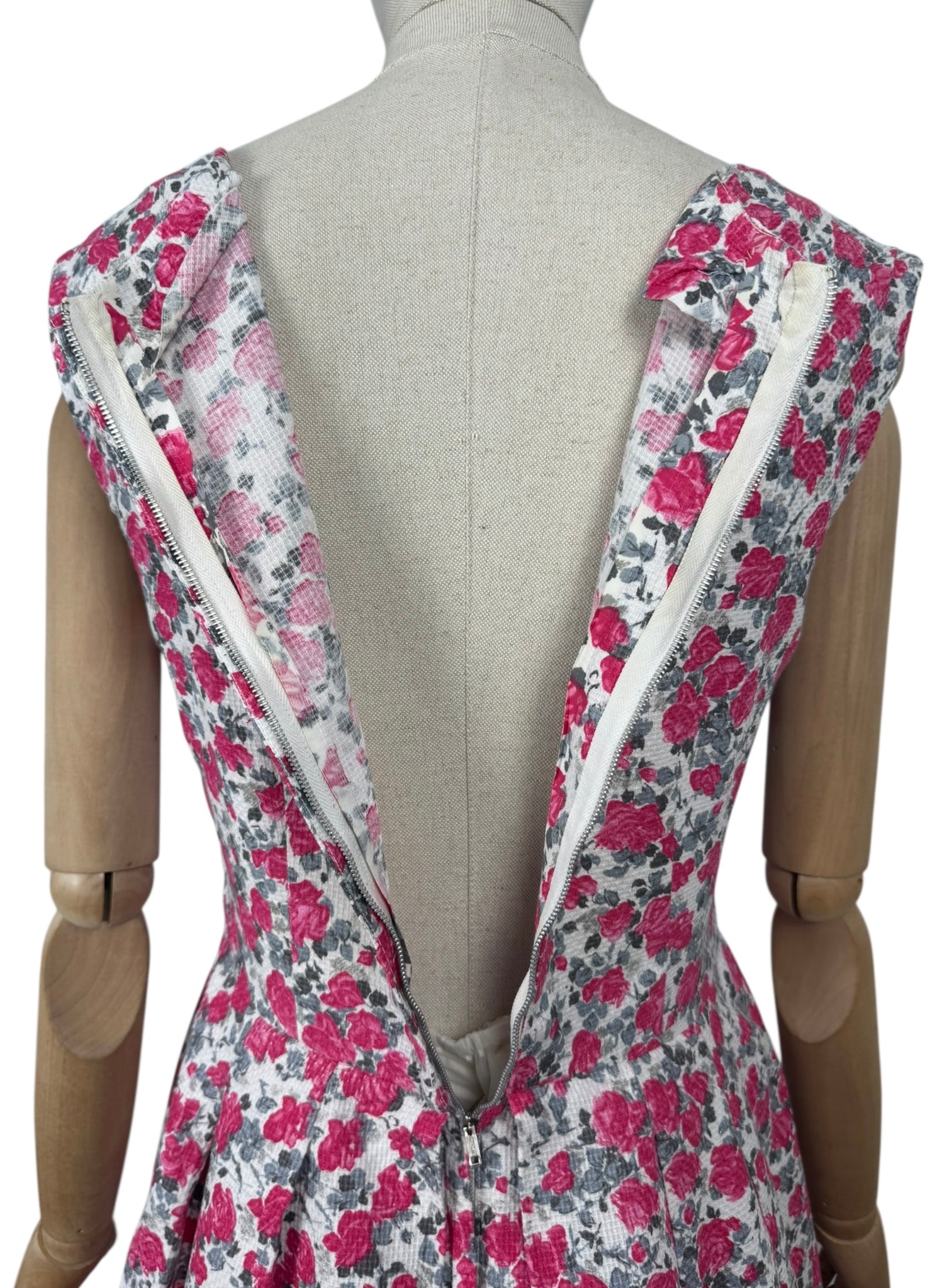 It has a close fitting bodice with side bust pleats, features a full skirt - which looks great worn with a full petticoat - and fastens down the back with a long metal zip.