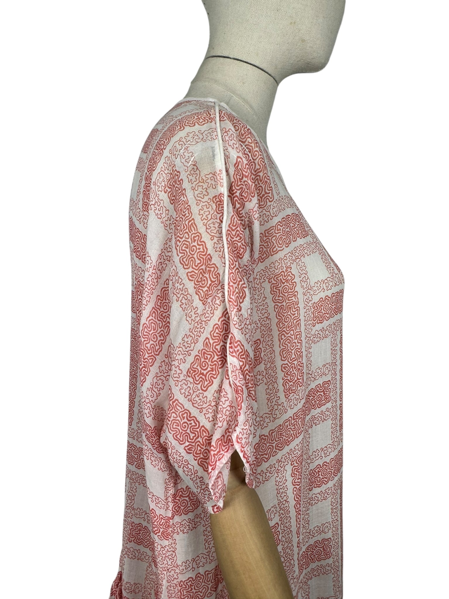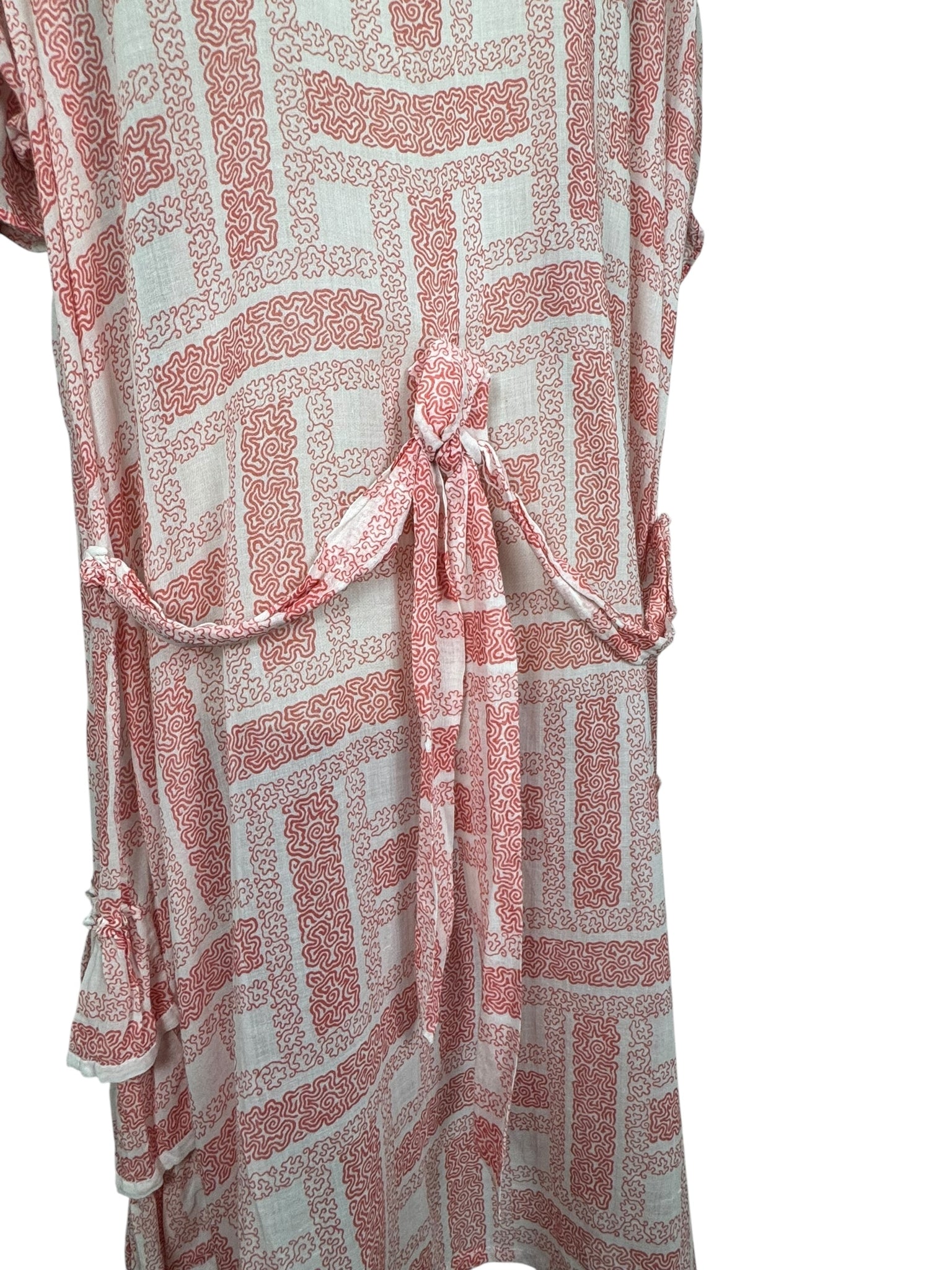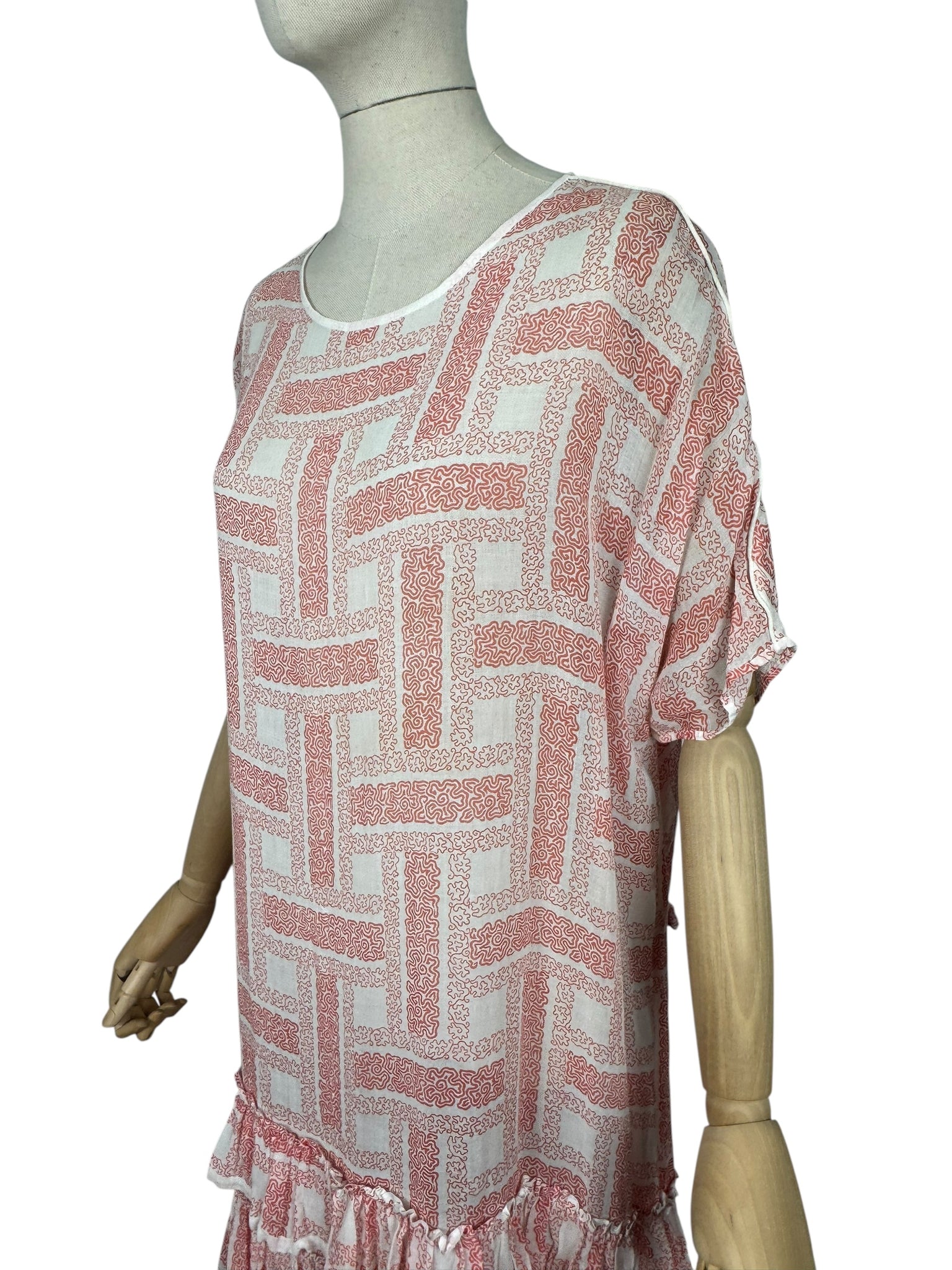 Made from semi sheer cotton lawn (so you'll near to wear a slip or under-dress), it has a white base with stylised floral print, in two tone pink, set out in a geometric pattern. It features white piped shoulder detail along the top seam and the neckline is trimmed with white binding. The front has 4 fabulously full layers of gathered ruffles and the back has a faux tie belt.