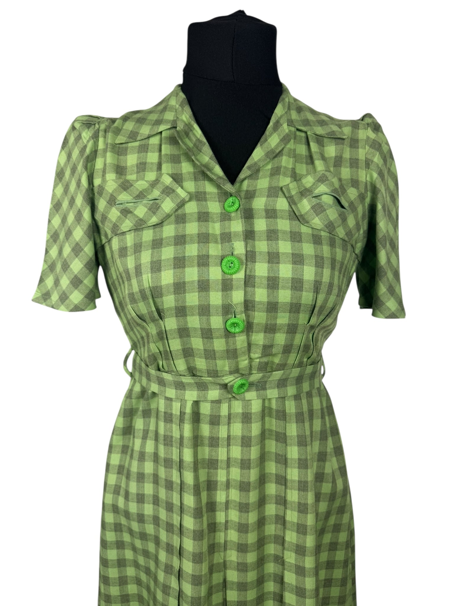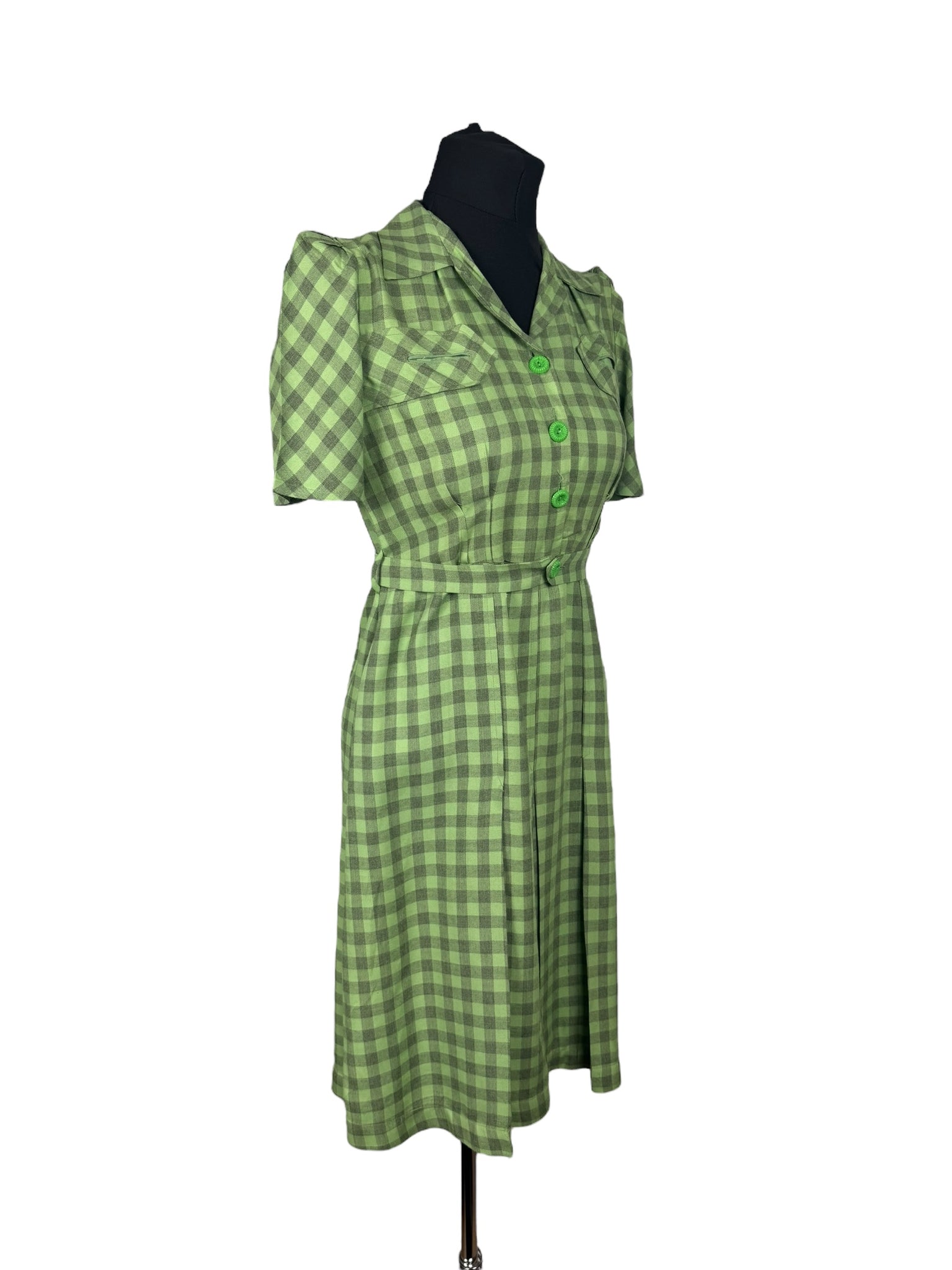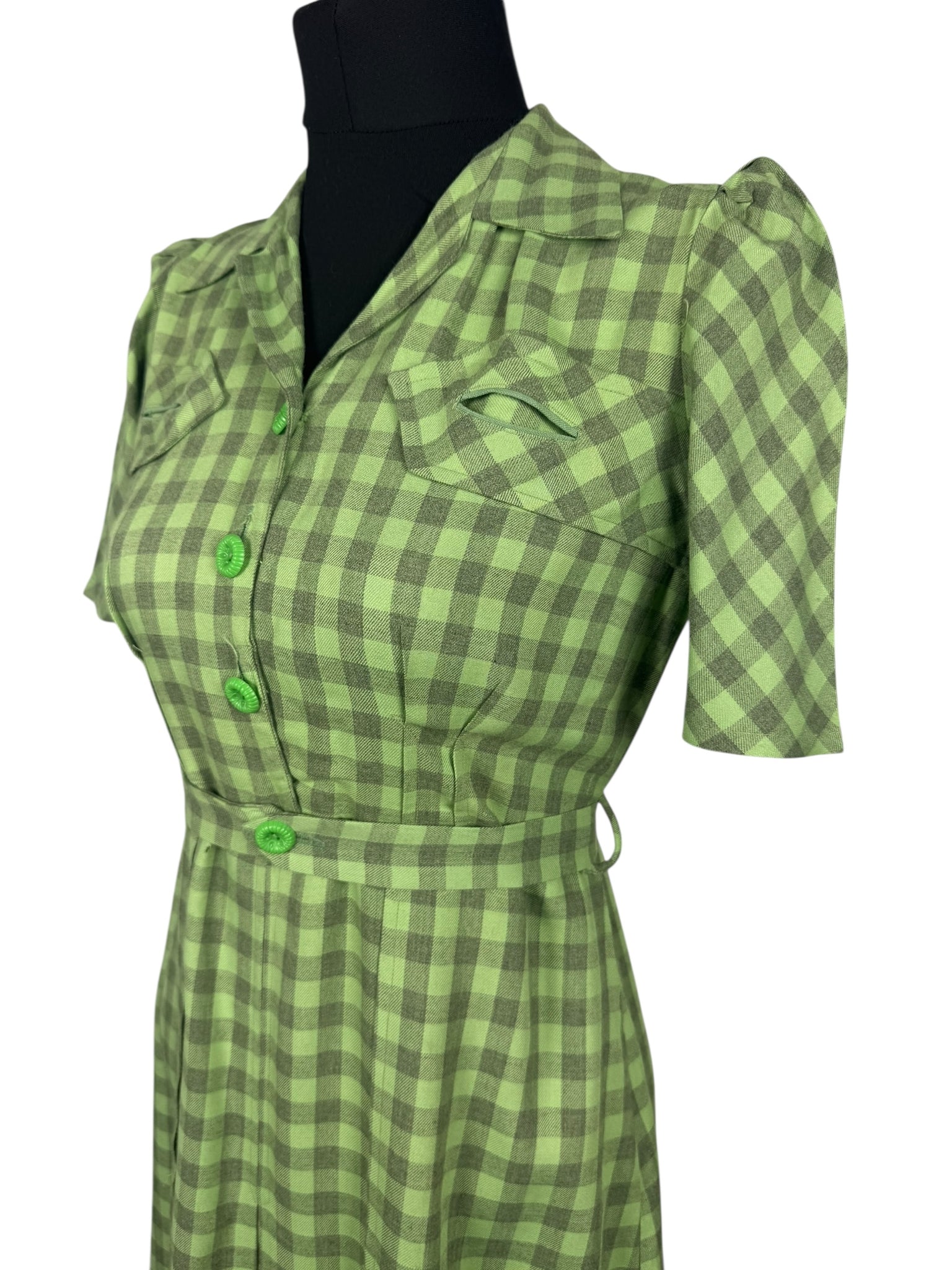 Made from green lightweight wool with a pale grey check, it features a button front bodice, puff sleeves with stiff shoulder pads, has pretty tab detail on the bodice and still has the original belt.