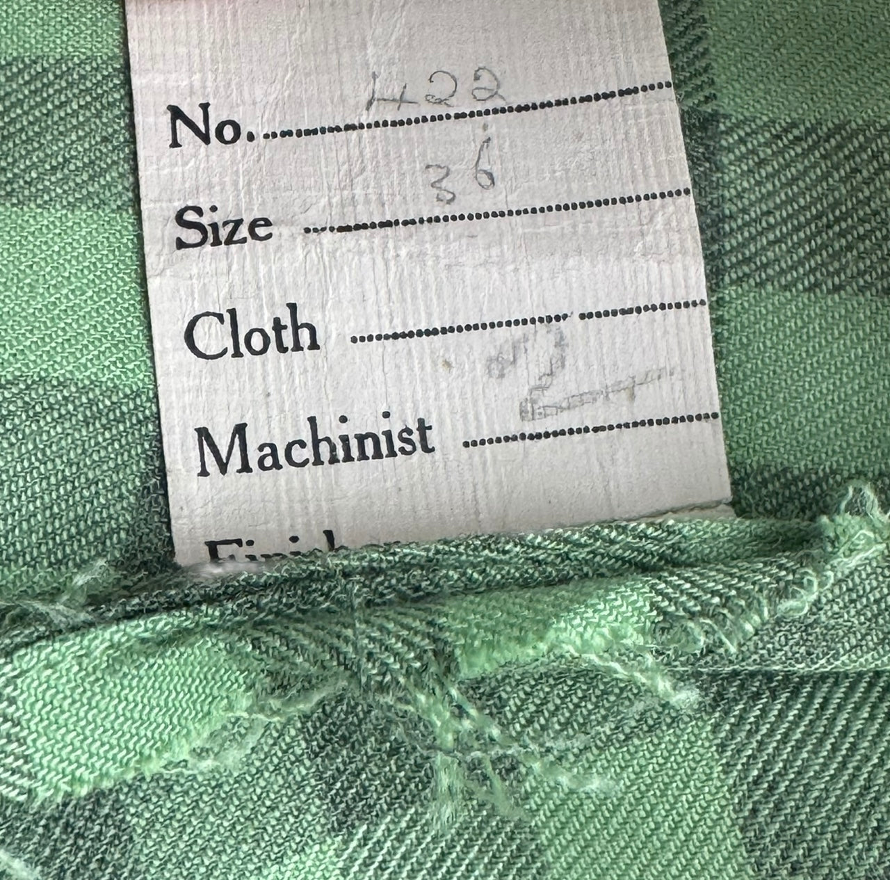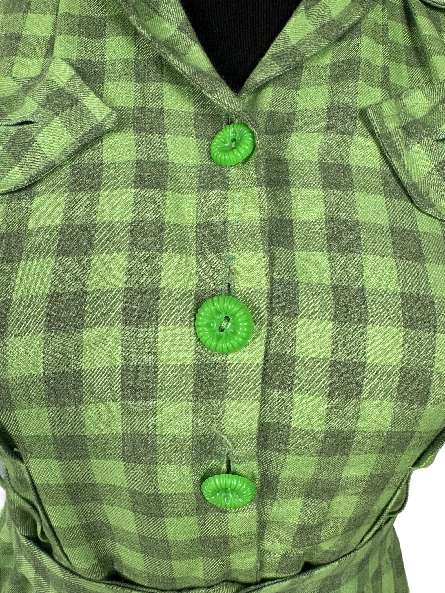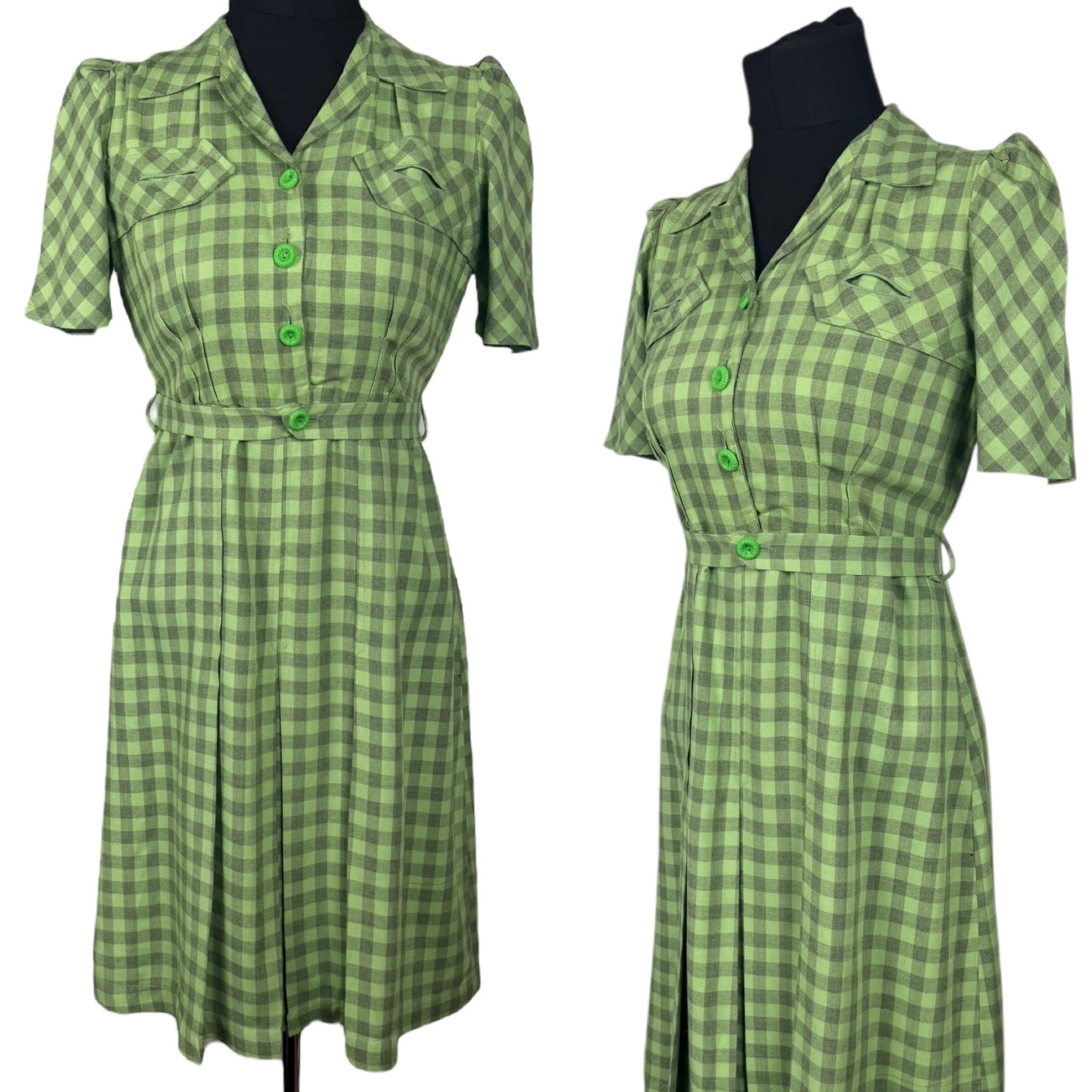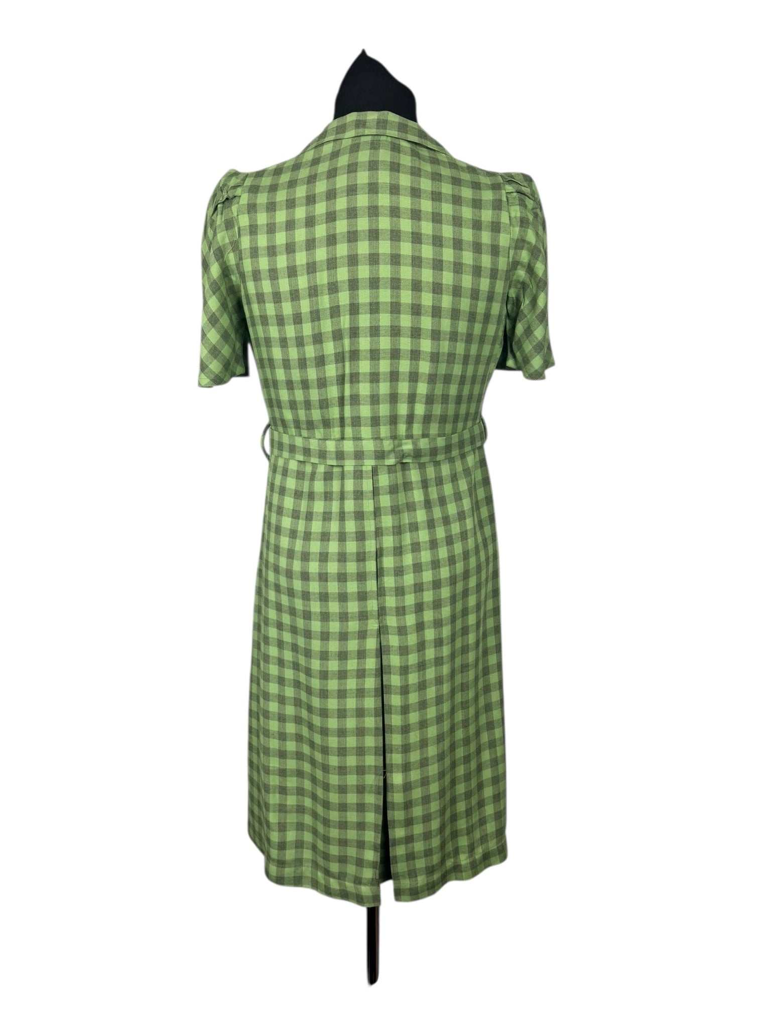 Made from green lightweight wool with a pale grey check, it features a button front bodice, puff sleeves with stiff shoulder pads, has pretty tab detail on the bodice and still has the original belt.