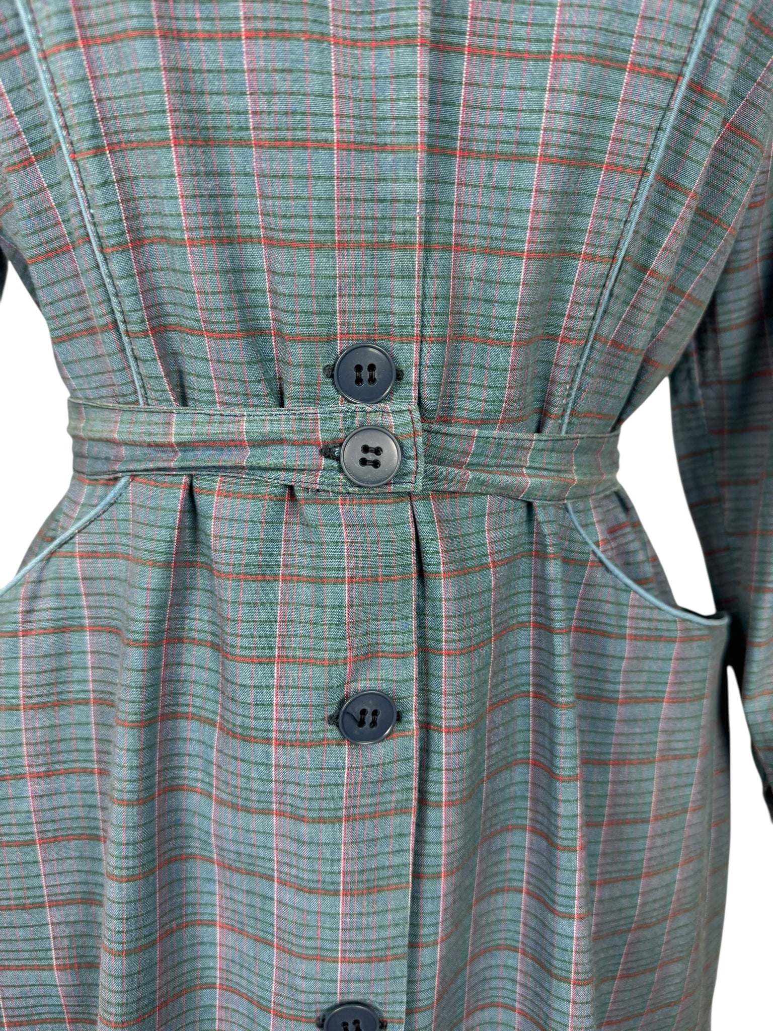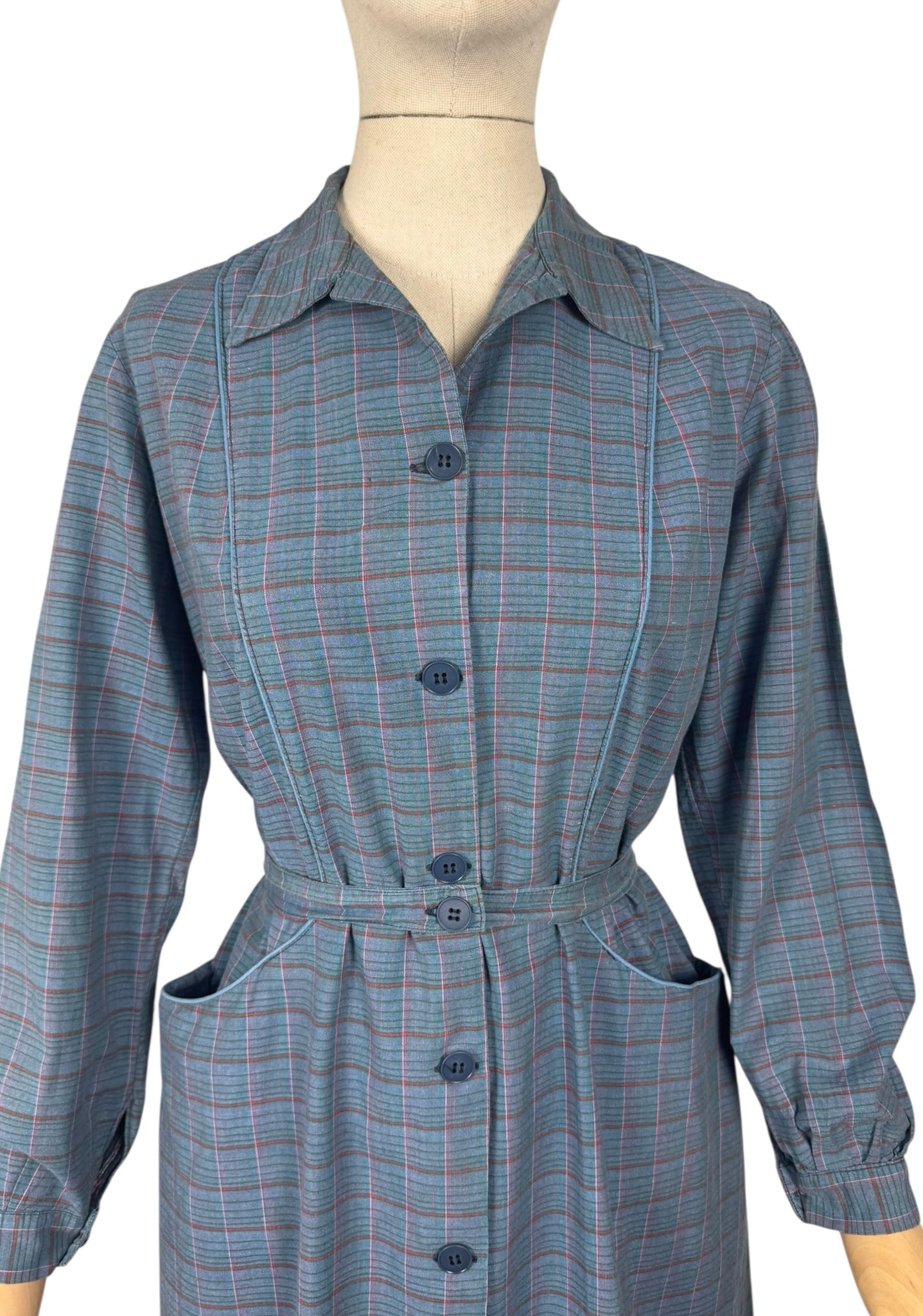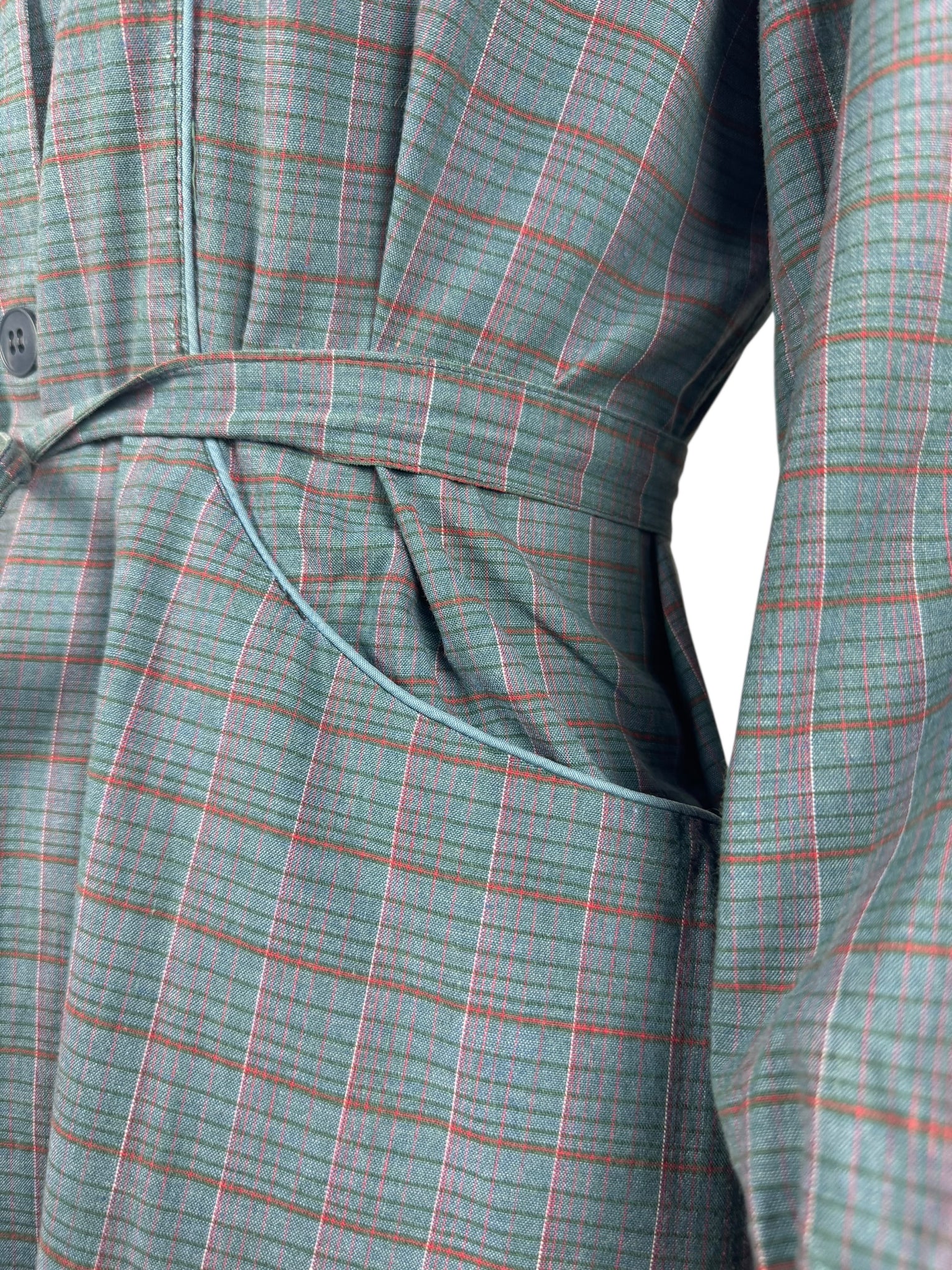 Made from medium weight cotton in a plaid print in green, red and pink on a blue base it was originally designed to be worn over your clothes to protect them from getting dirty while you were doing chores. However, it works perfectly as a day dress.