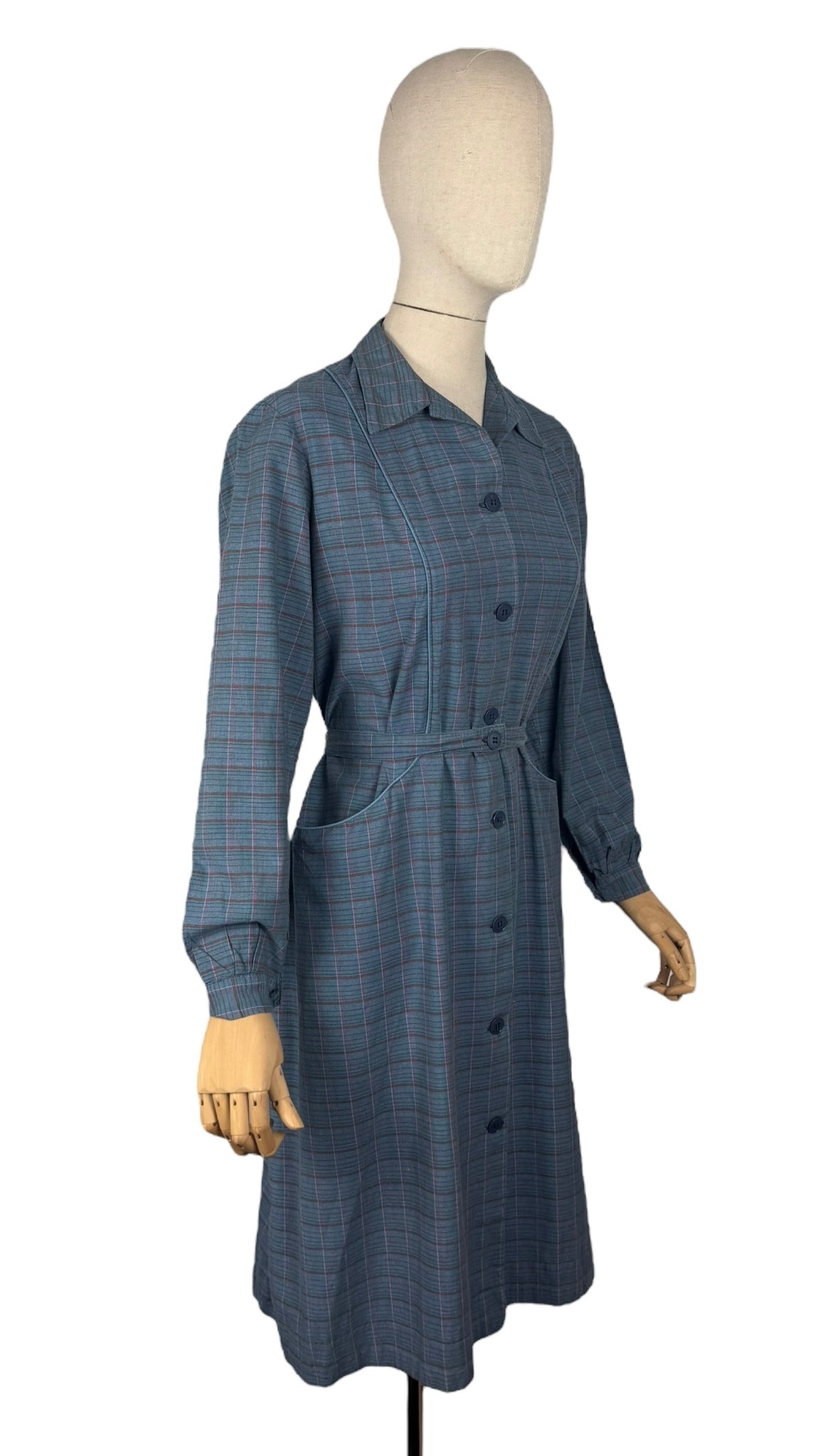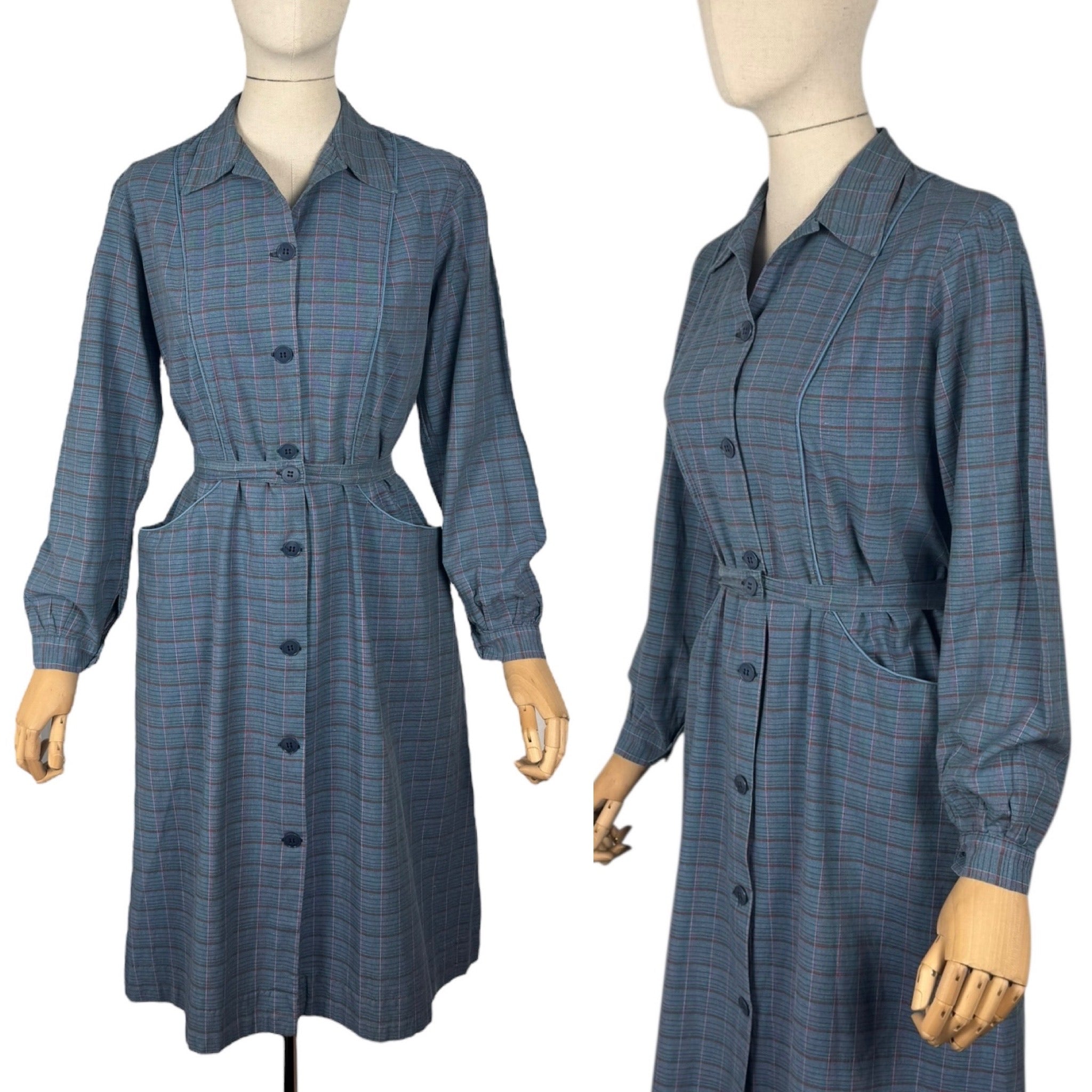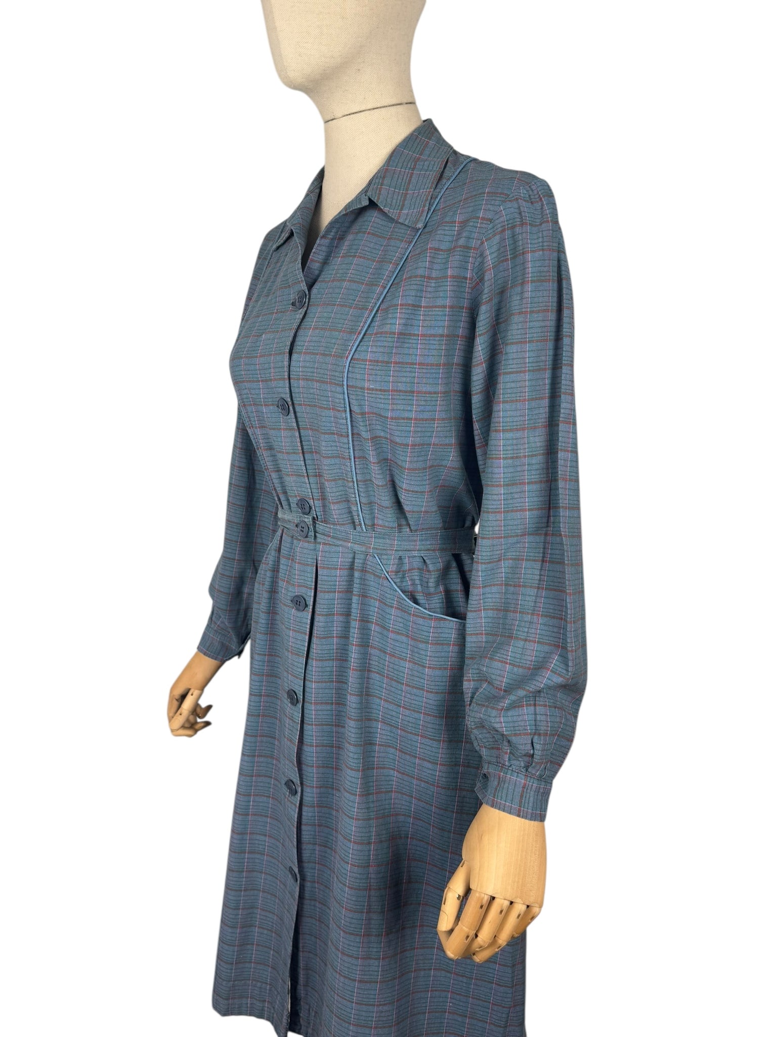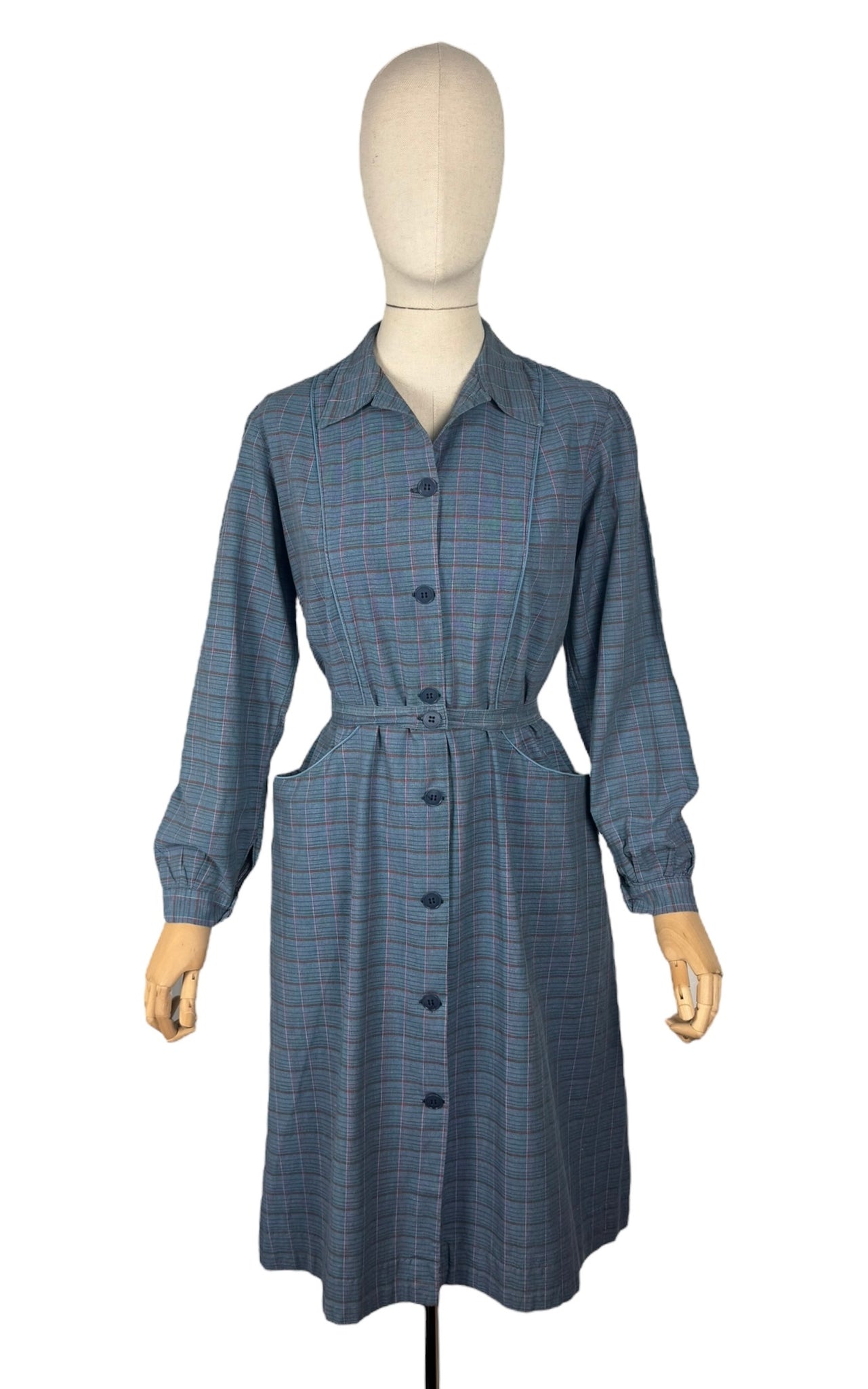 Made from medium weight cotton in a plaid print in green, red and pink on a blue base it was originally designed to be worn over your clothes to protect them from getting dirty while you were doing chores. However, it works perfectly as a day dress.