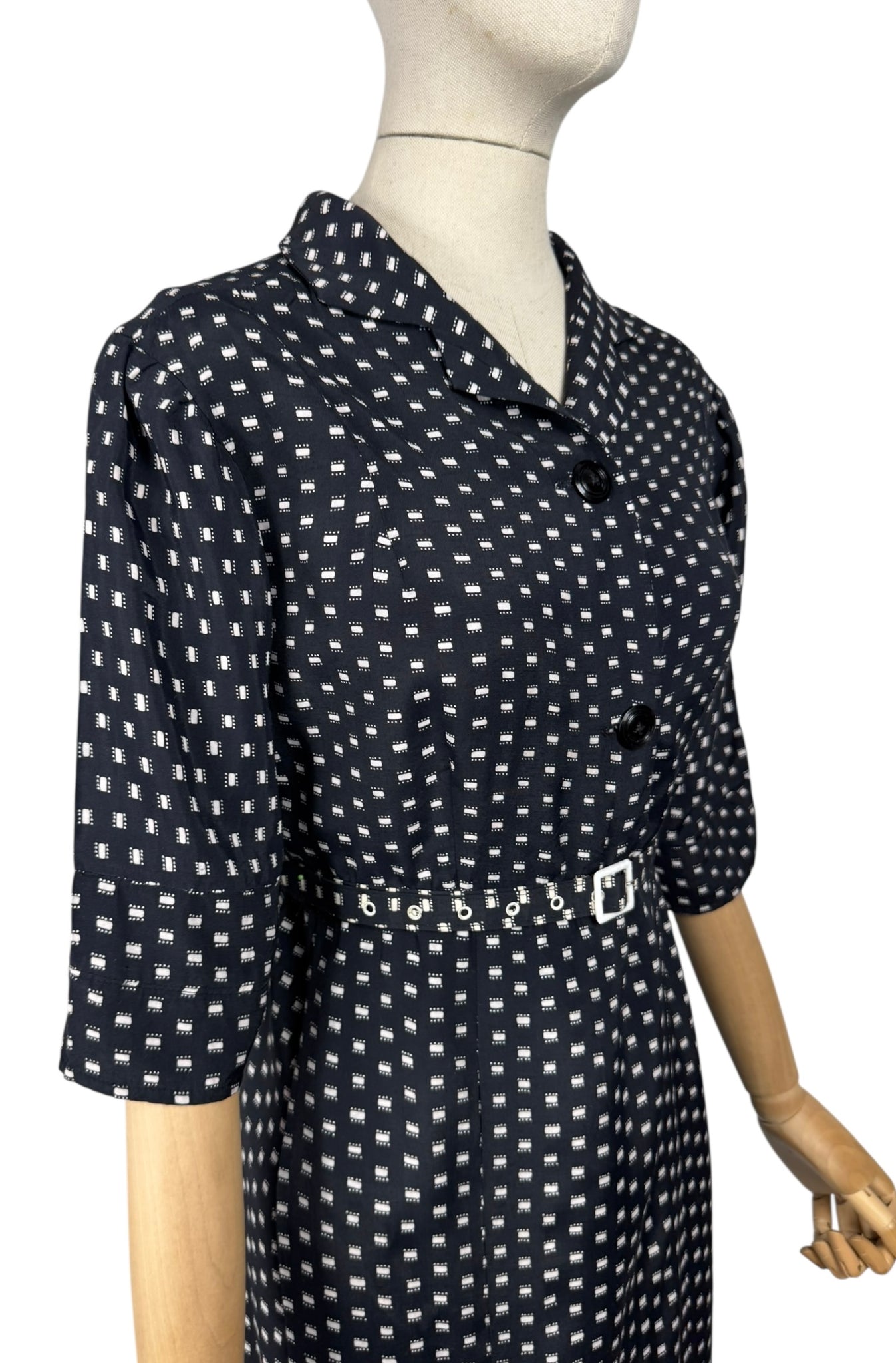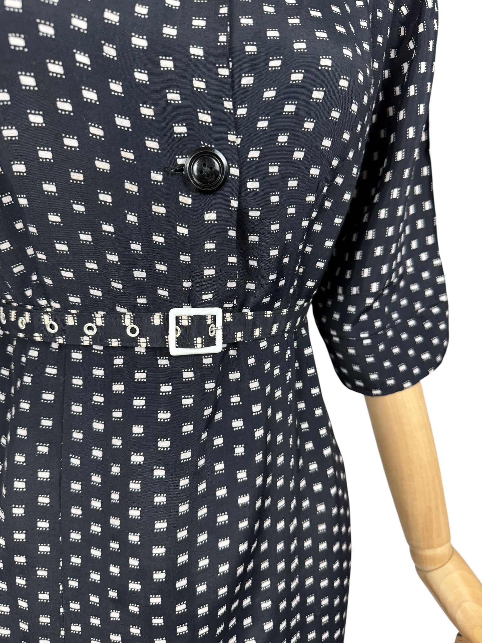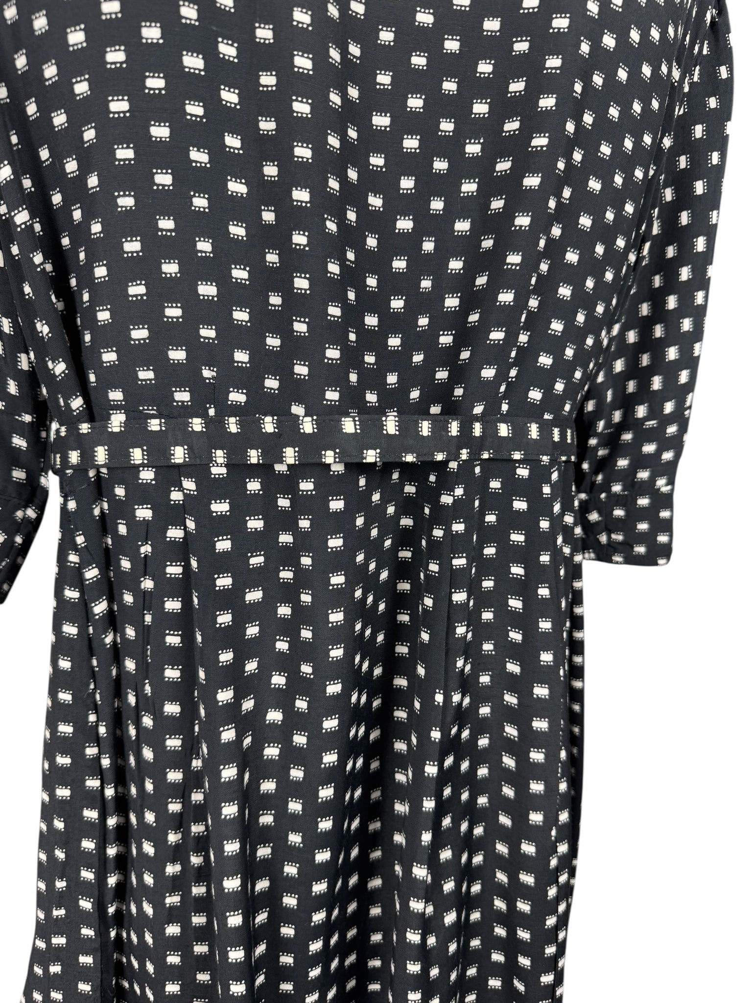 Made from floppy cotton it has an inky black base with a geometric print worked in white. The bodice fastens with large black plastic buttons and there is no side opening on this piece. It has slim fitting sleeves, underarm gussets and still has the original belt.