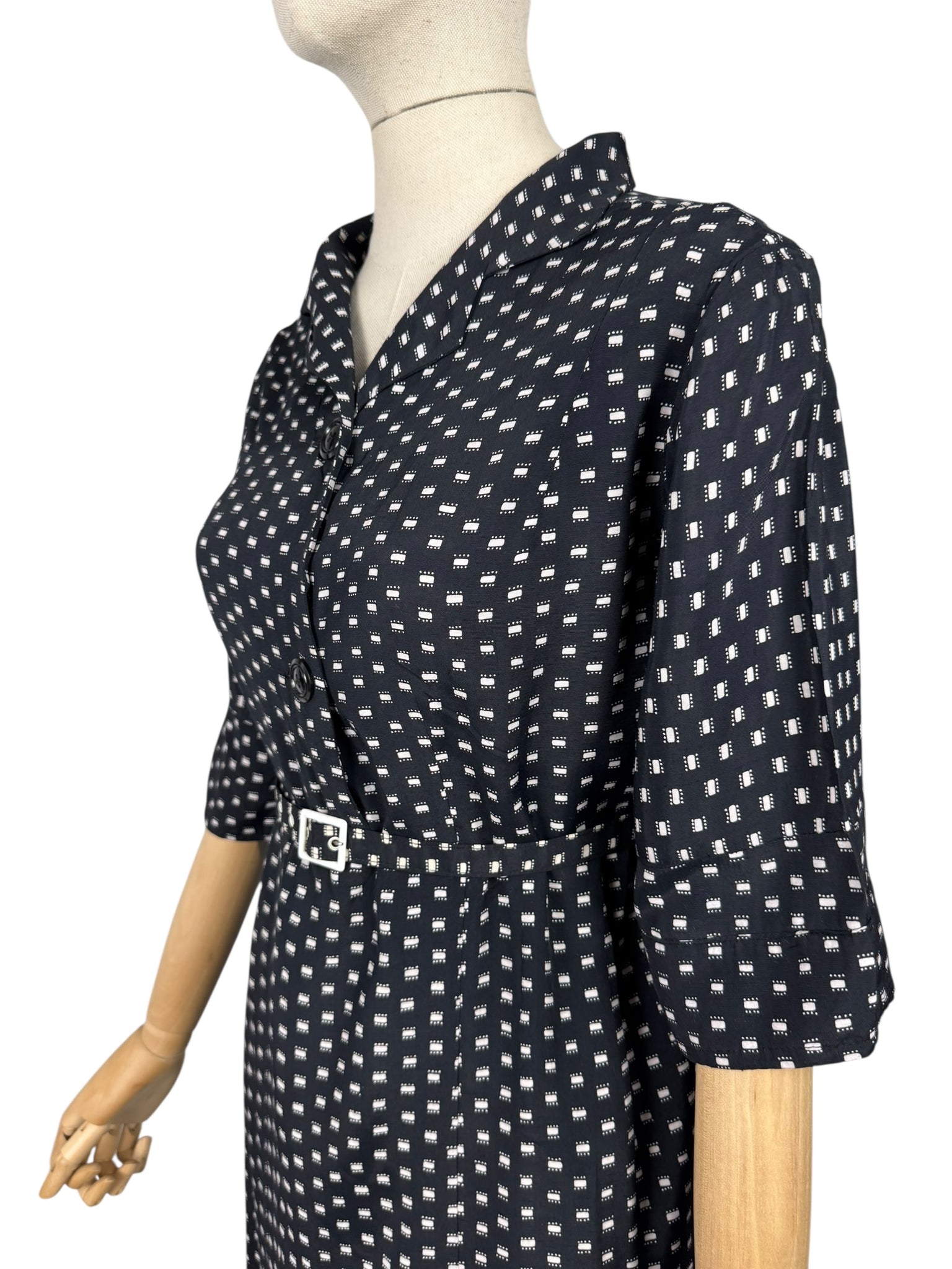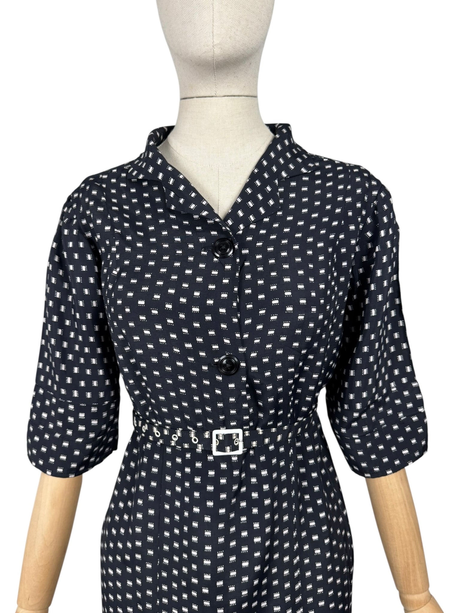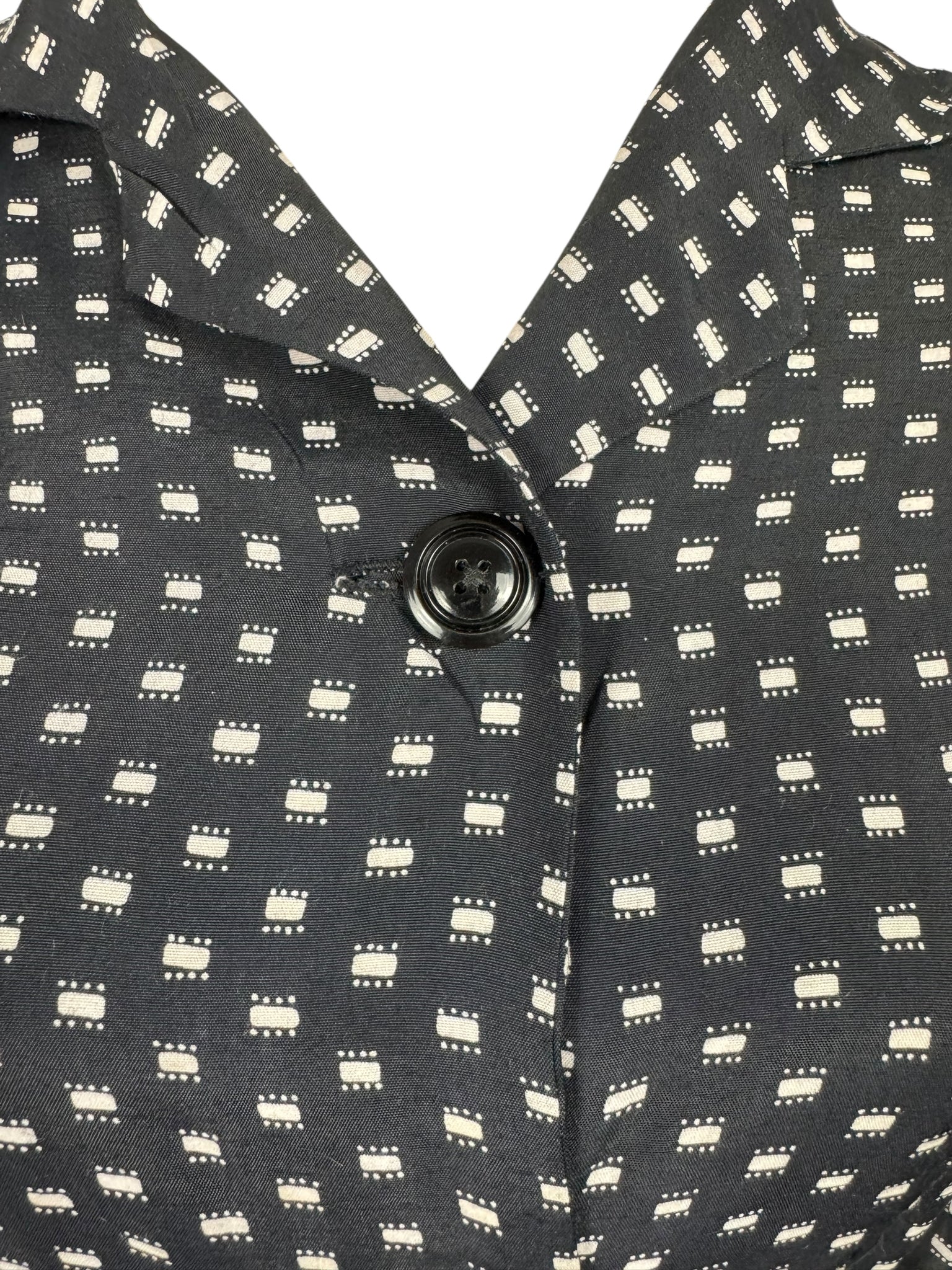 Made from floppy cotton it has an inky black base with a geometric print worked in white. The bodice fastens with large black plastic buttons and there is no side opening on this piece. It has slim fitting sleeves, underarm gussets and still has the original belt.