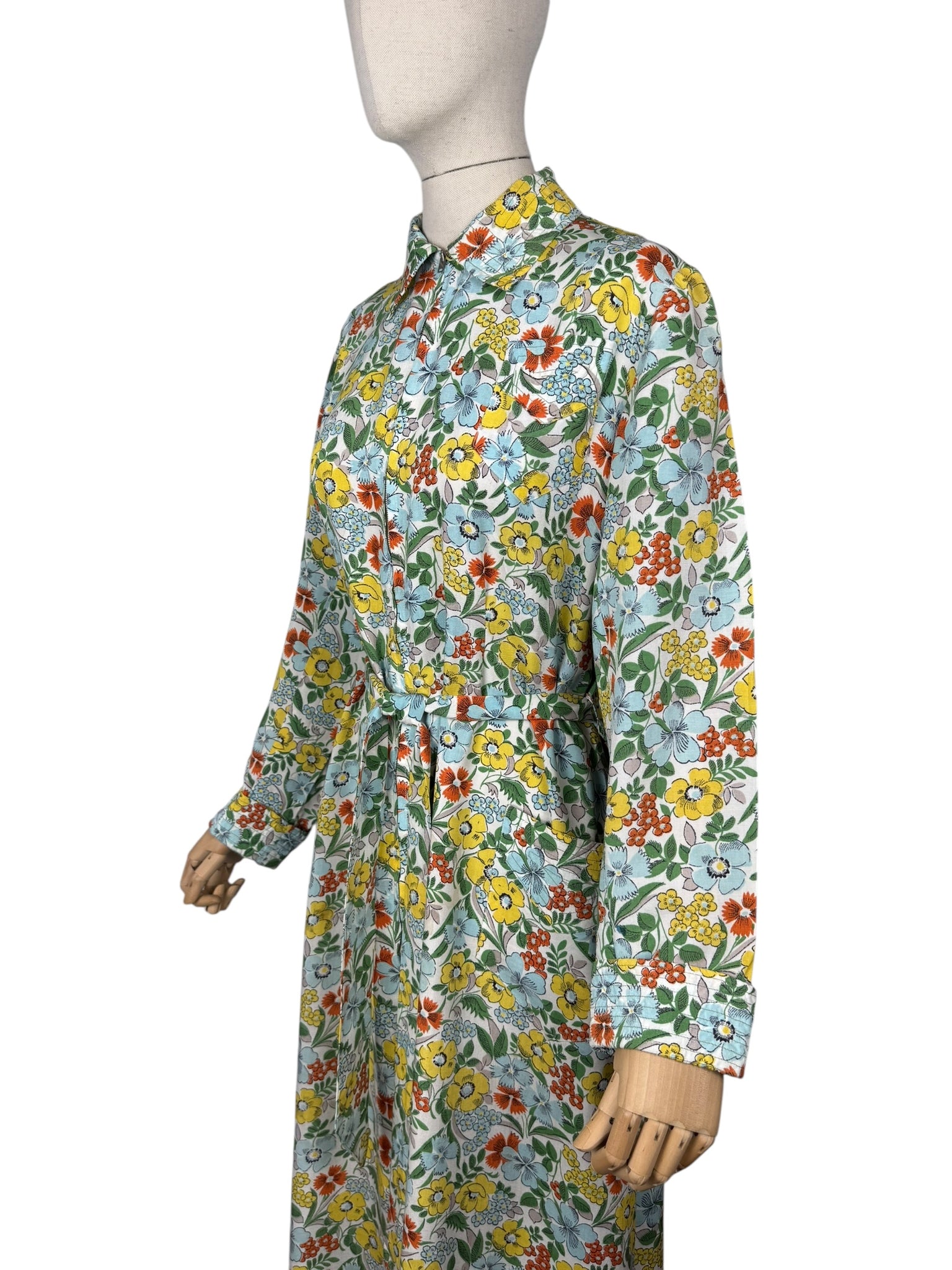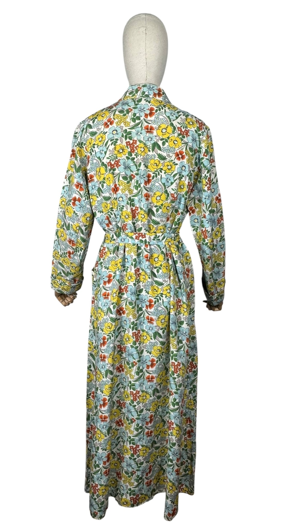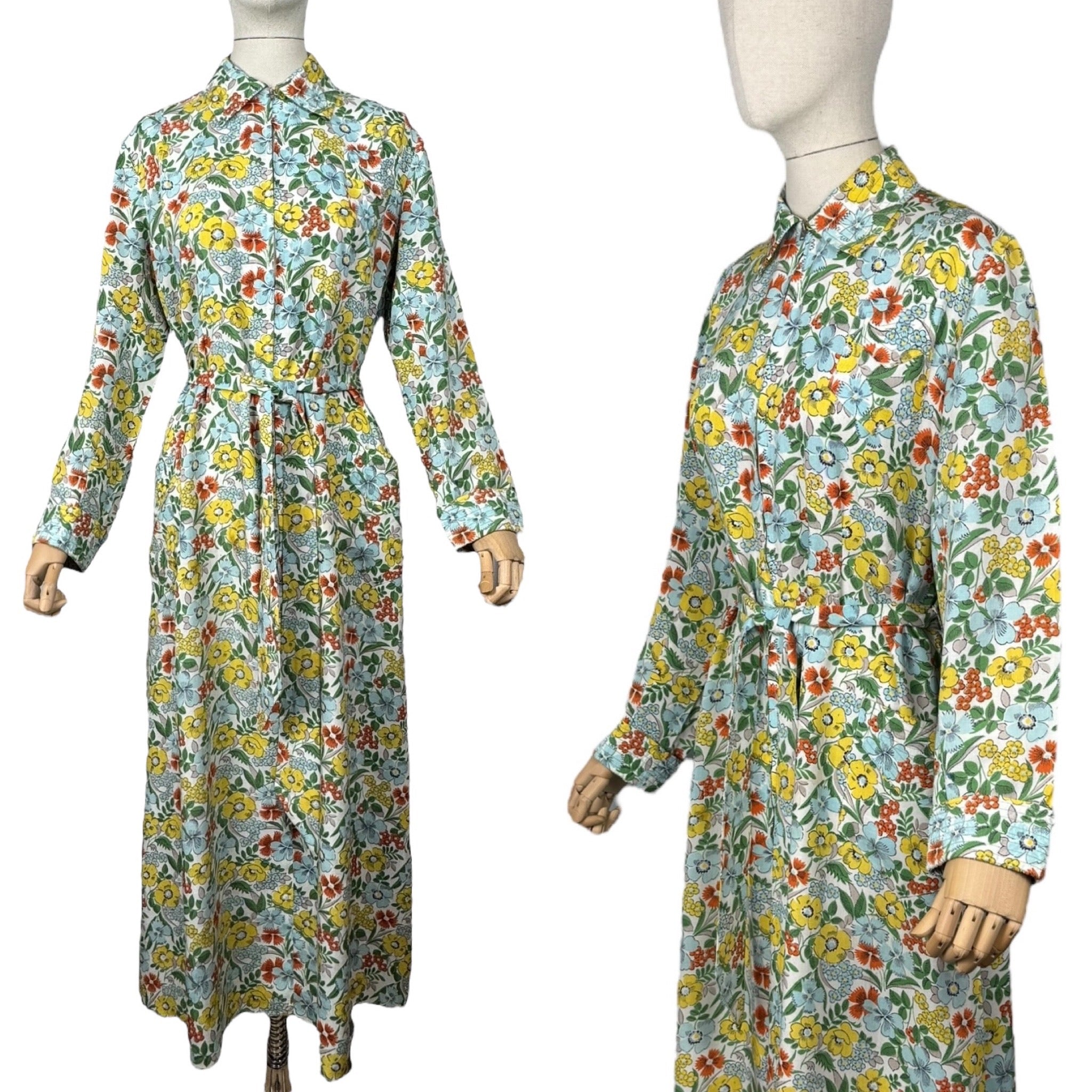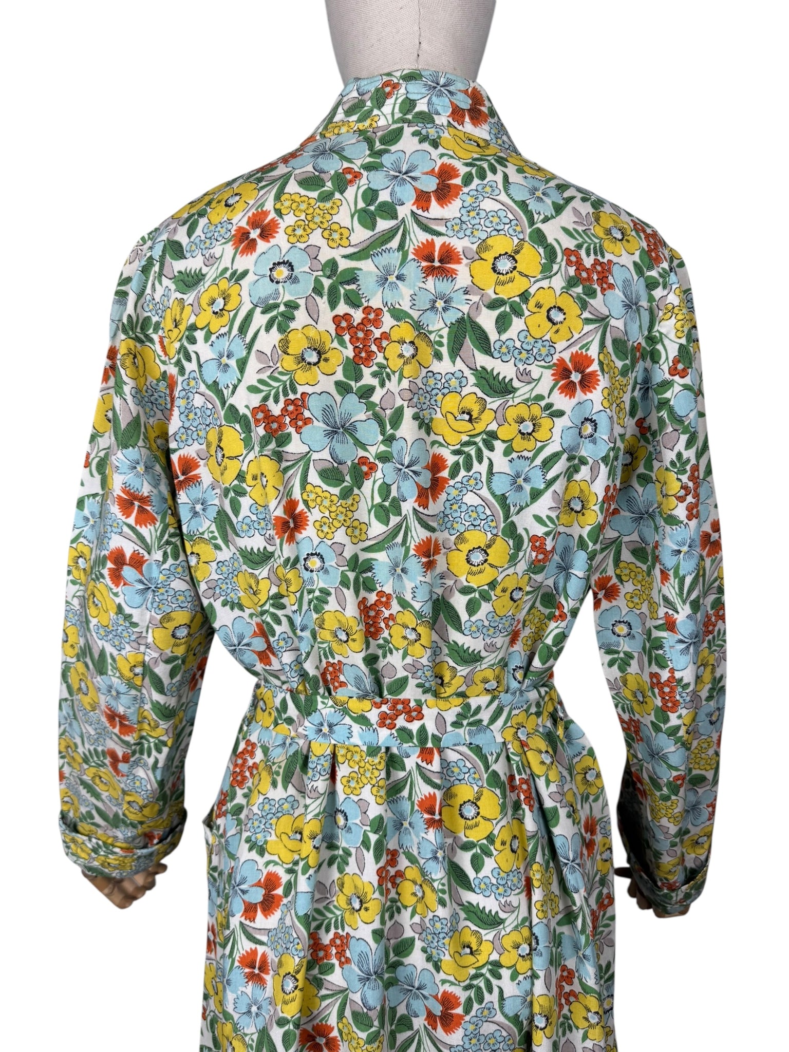 Made in the 1940's from a beautiful quality floppy cotton in a bold floral print of yellow, blue, green and rust on a white base, it is a classic design of the era.