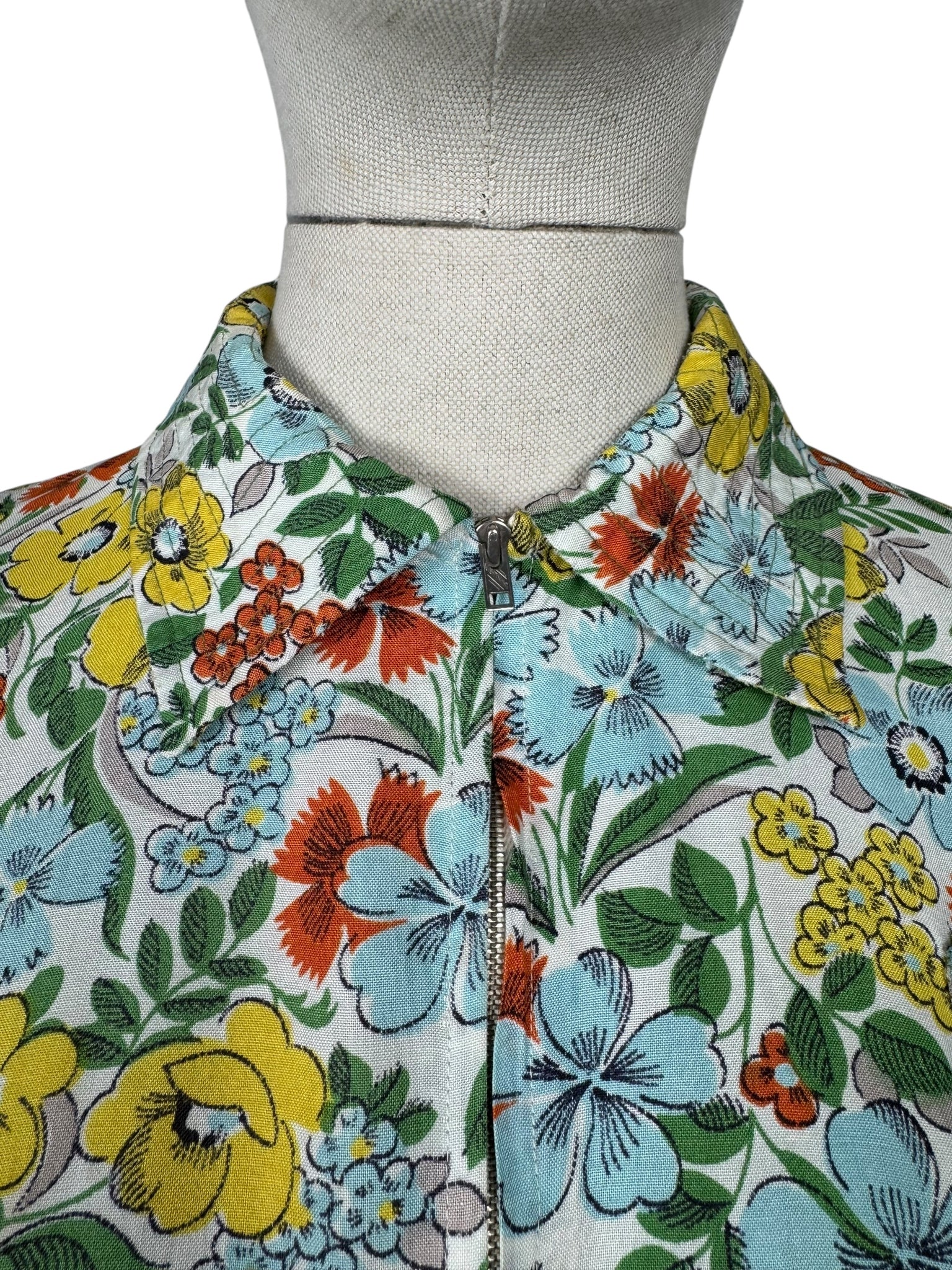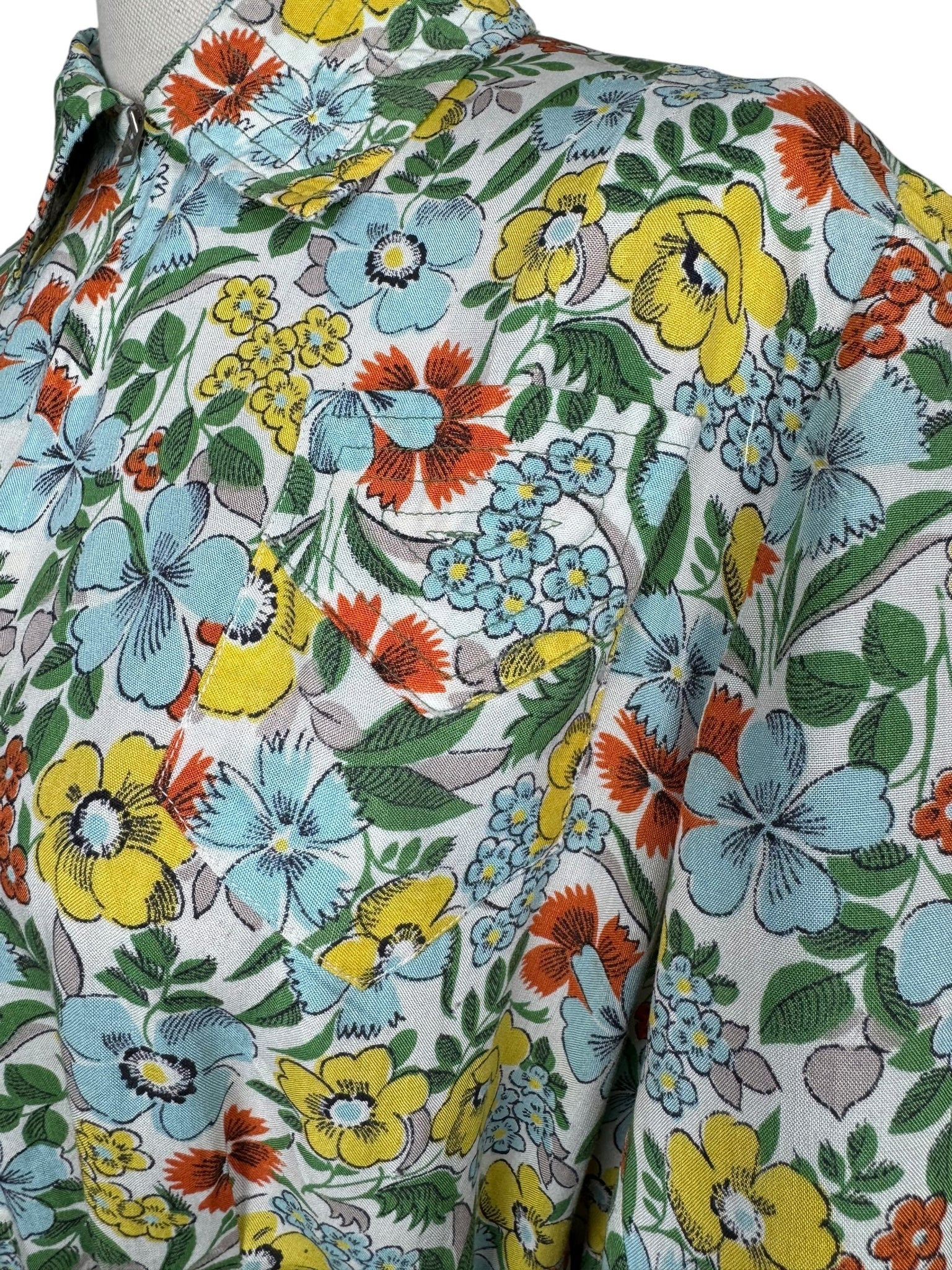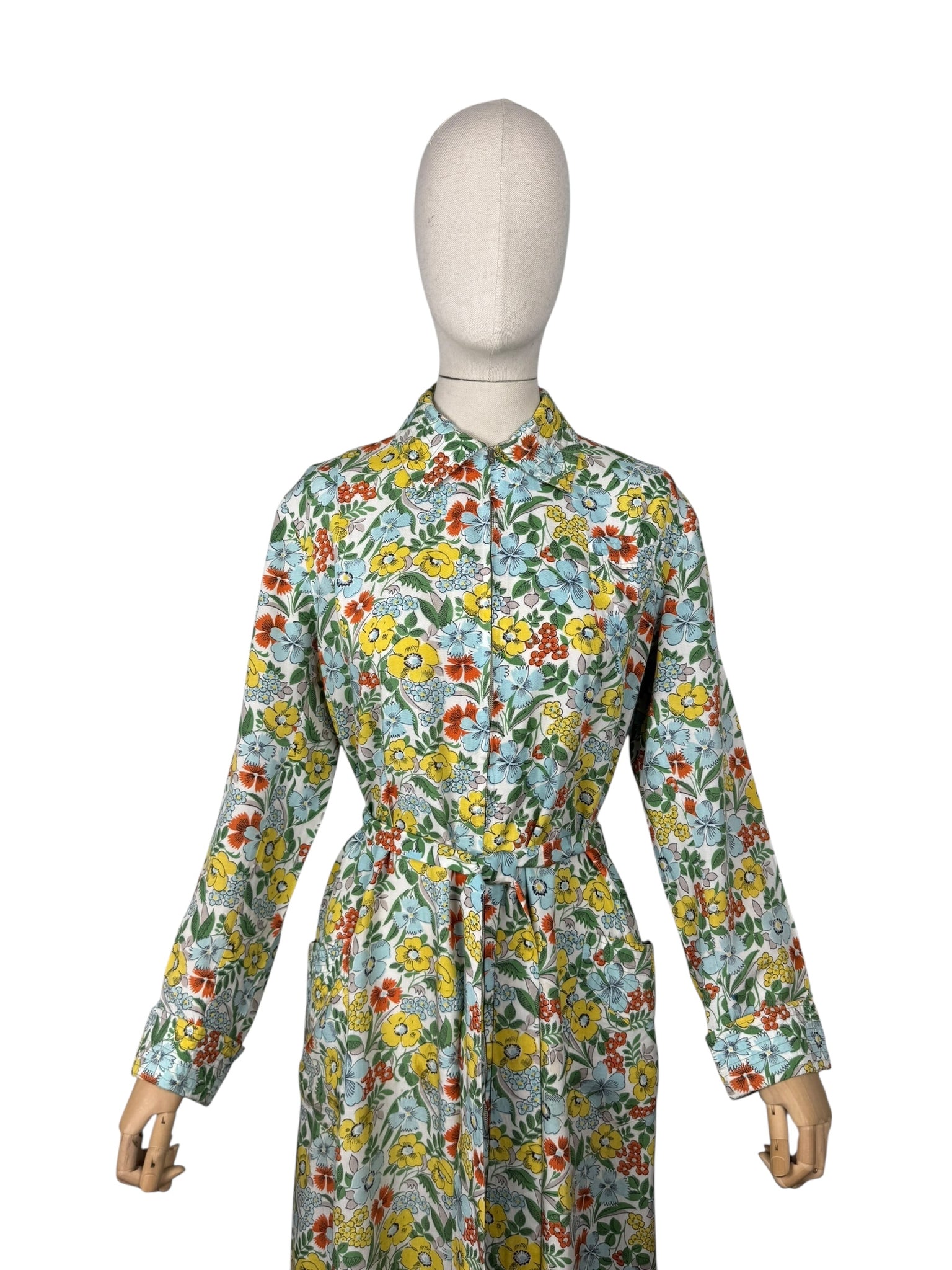 Made in the 1940's from a beautiful quality floppy cotton in a bold floral print of yellow, blue, green and rust on a white base, it is a classic design of the era.