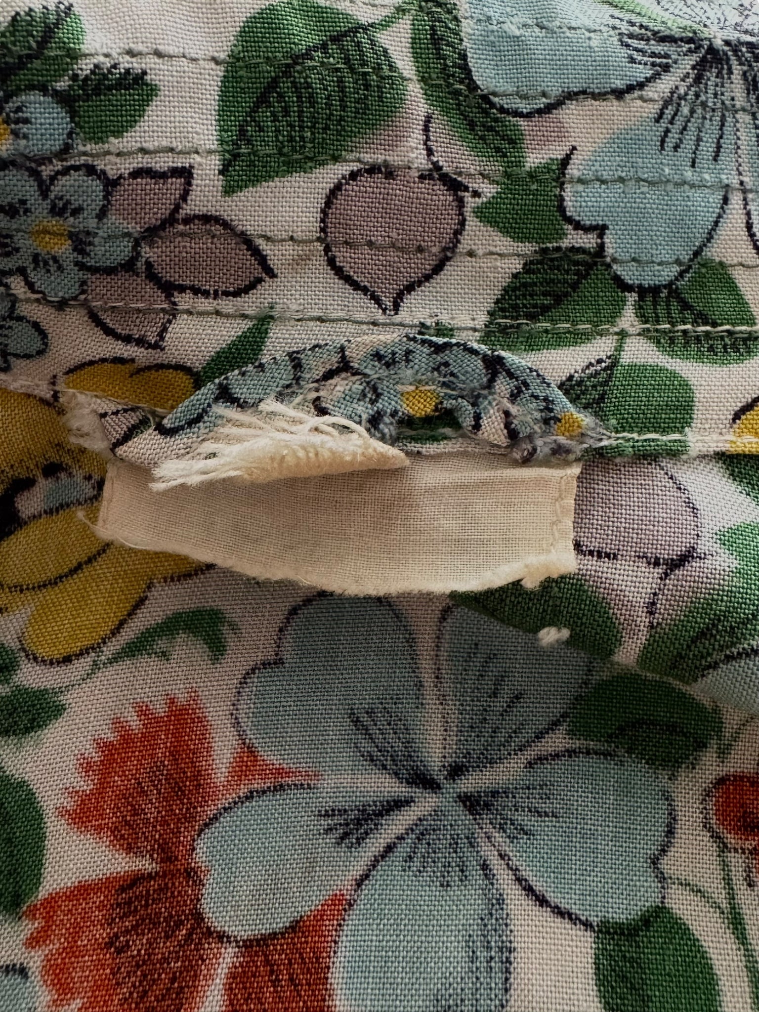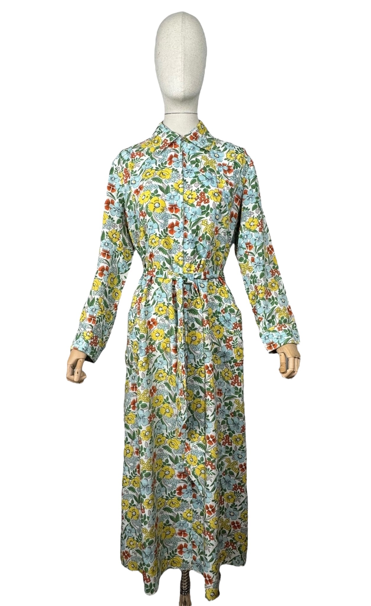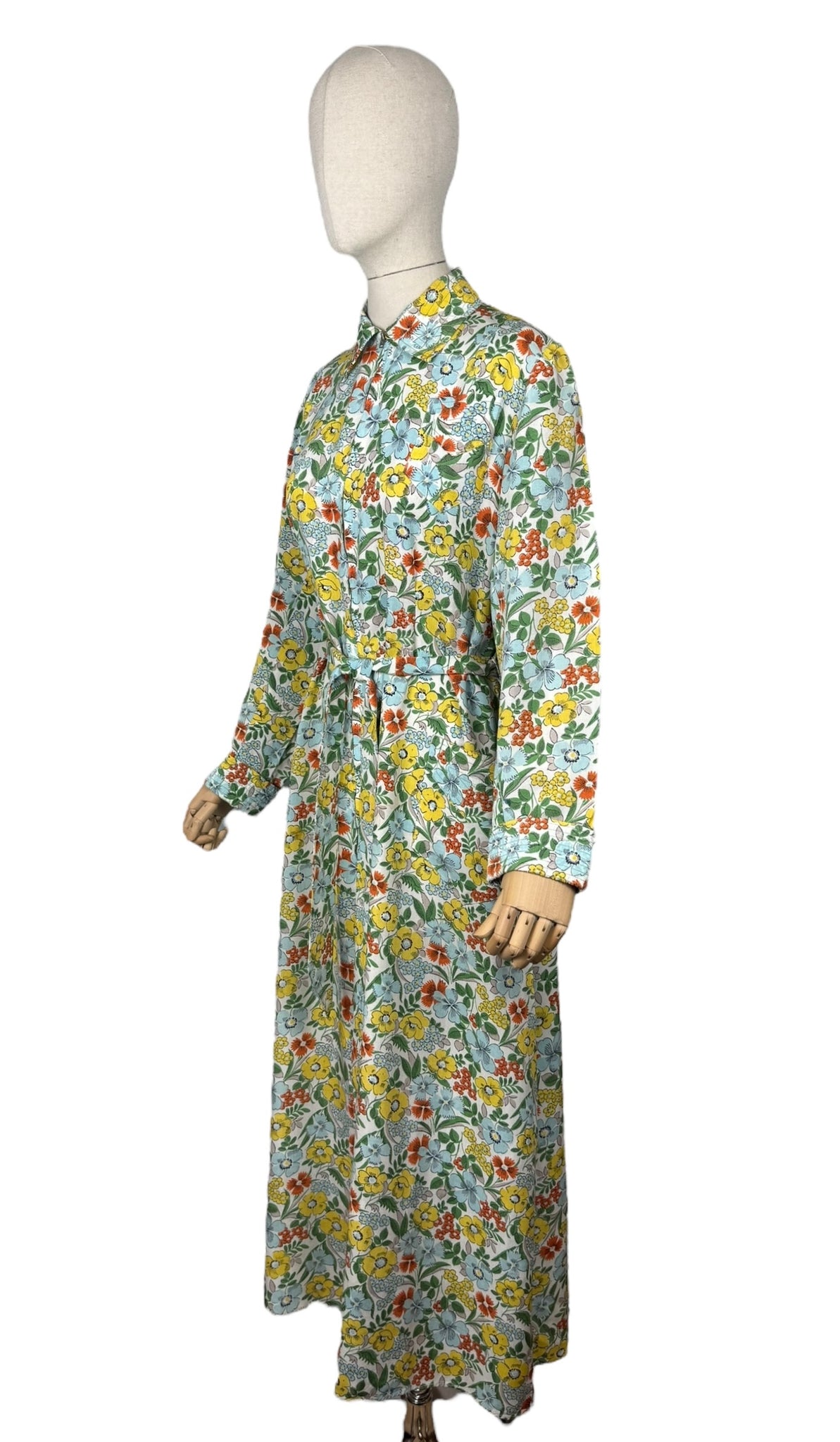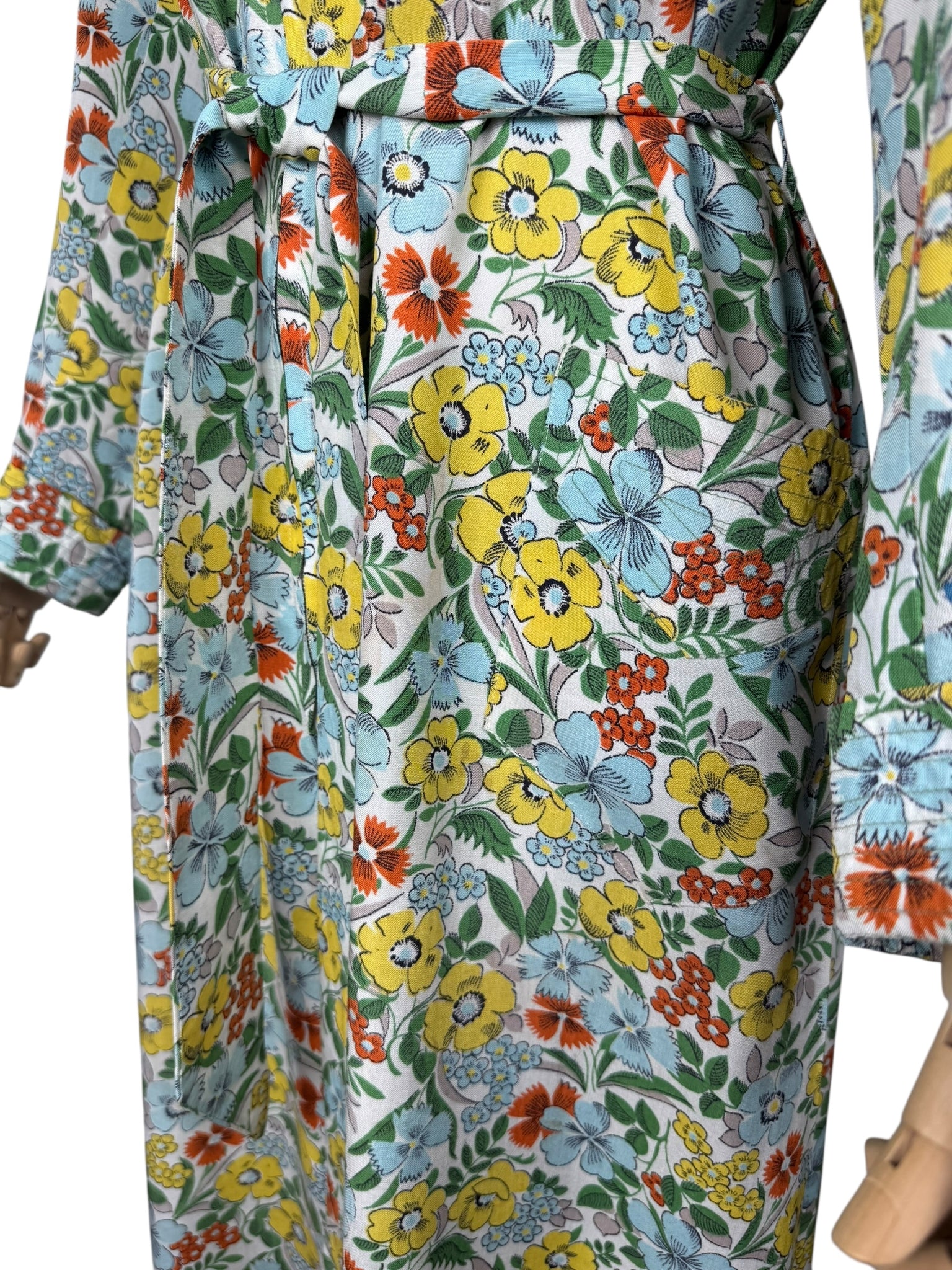 Made in the 1940's from a beautiful quality floppy cotton in a bold floral print of yellow, blue, green and rust on a white base, it is a classic design of the era.