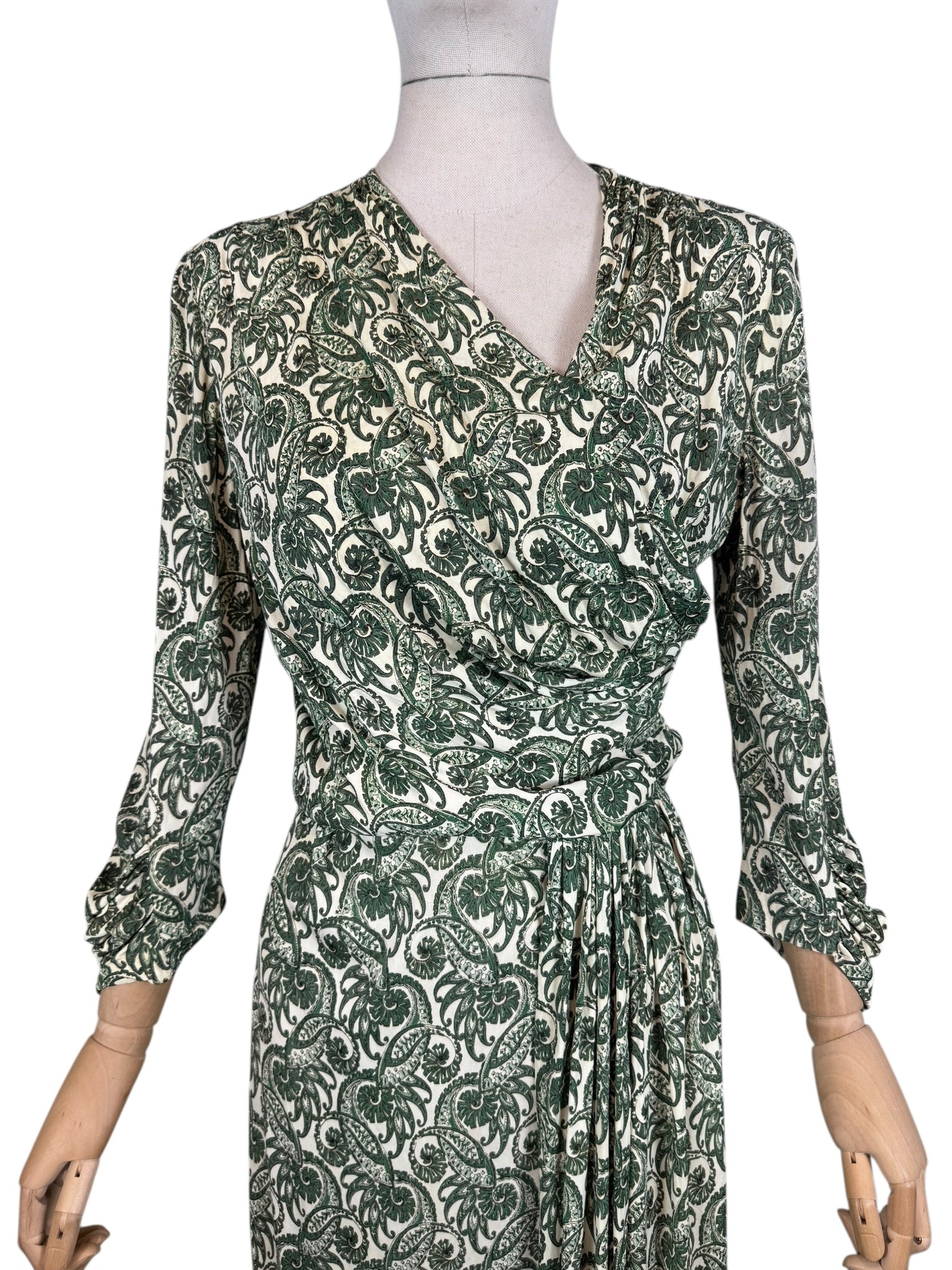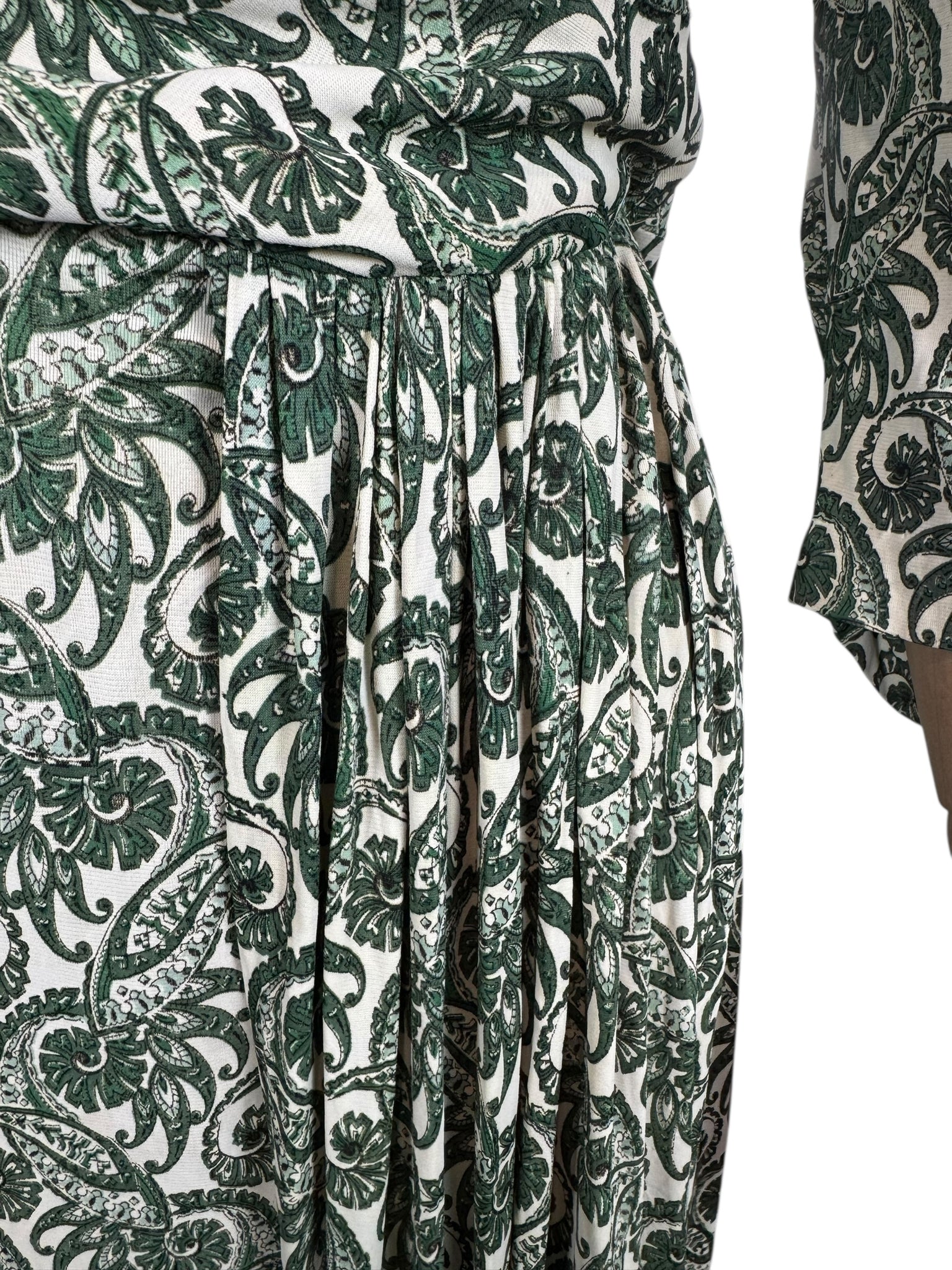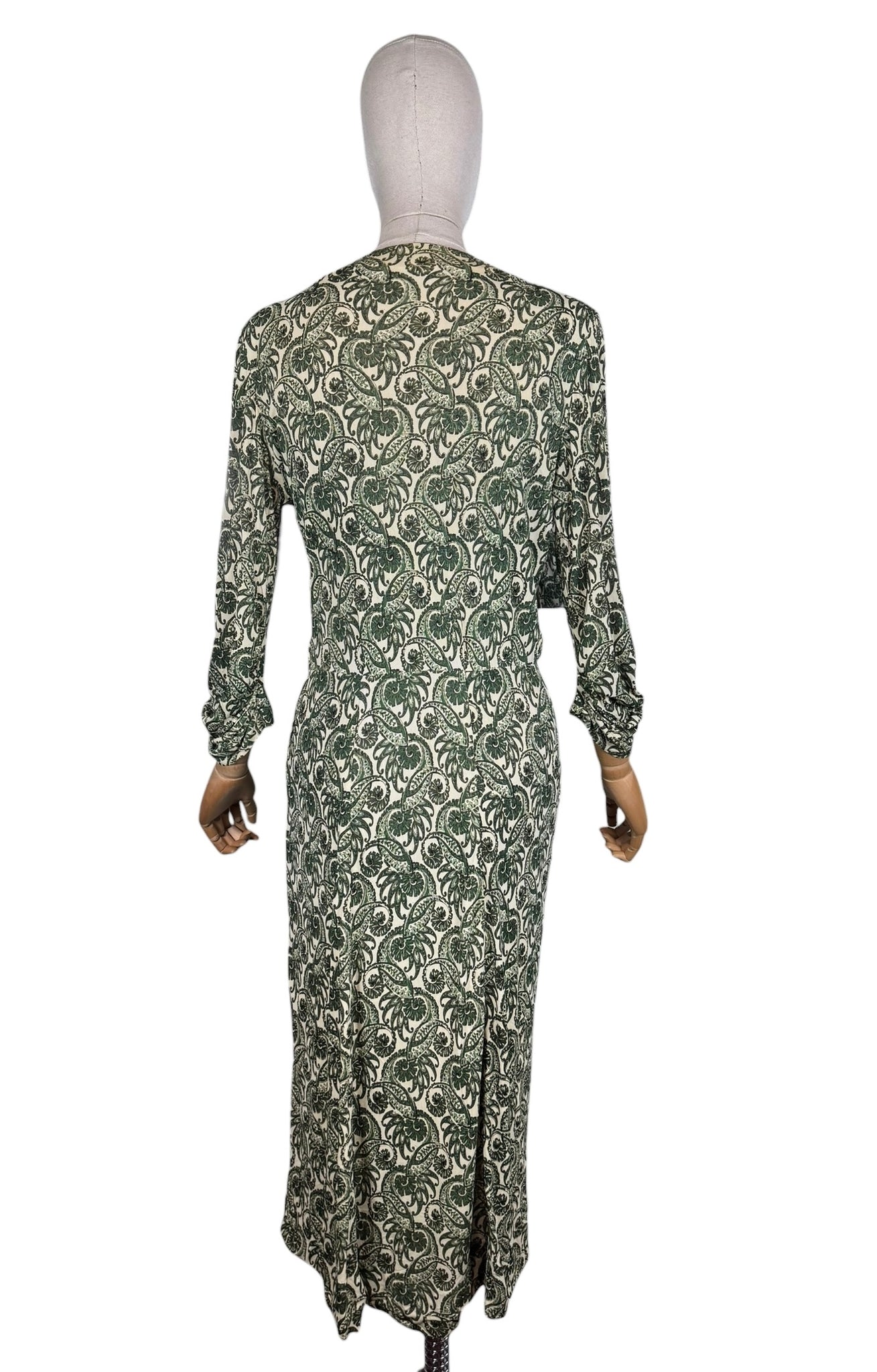Made from a wonderfully slinky rayon jersey, which has a slight stretch, it is a close fitting piece. With an off-white base it has a foliate design in green.