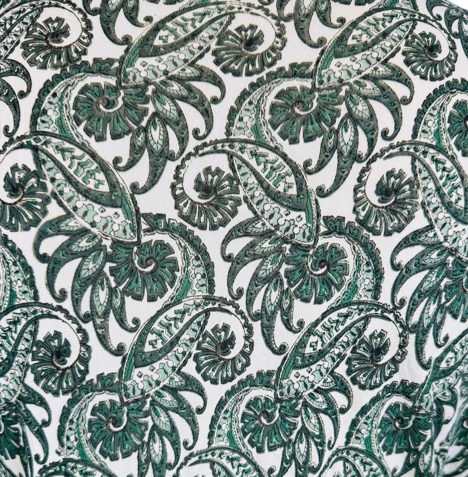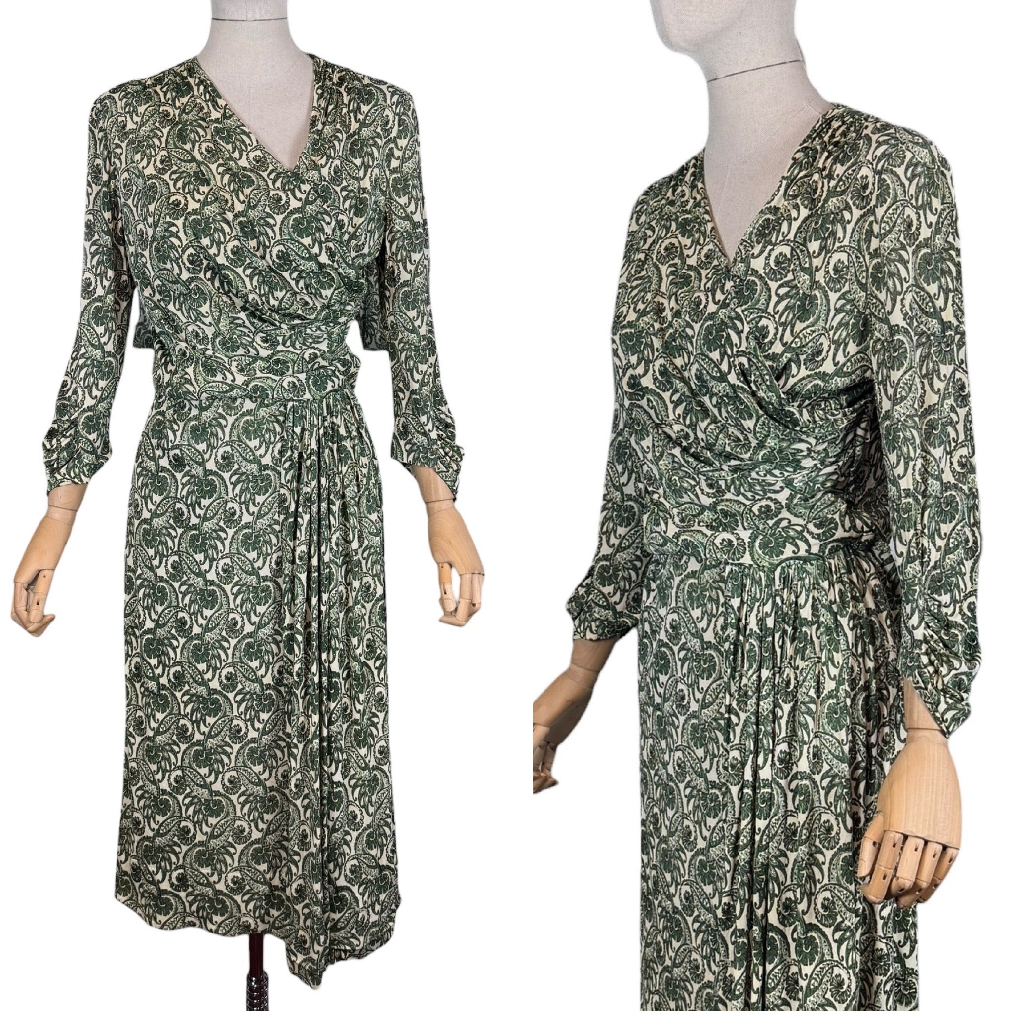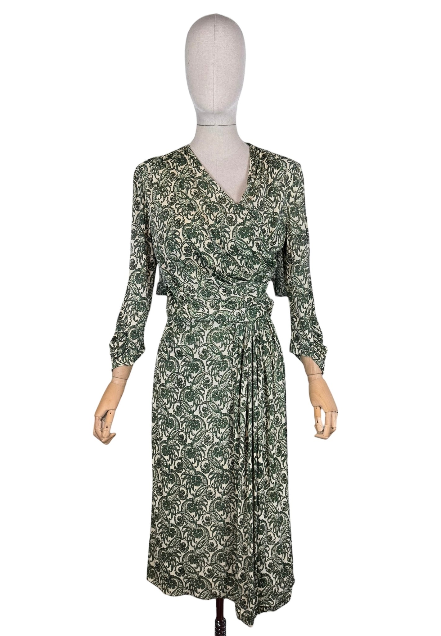Made from a wonderfully slinky rayon jersey, which has a slight stretch, it is a close fitting piece. With an off-white base it has a foliate design in green.