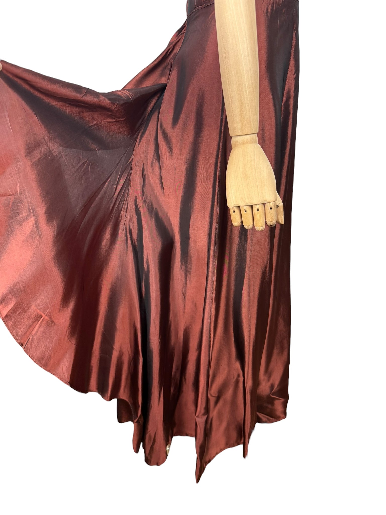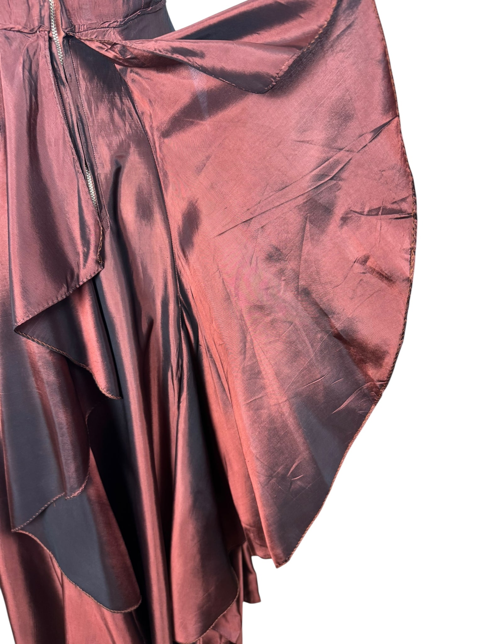 Made from artificial silk in bronzed maroon, it has a close fitting, fully lined, boned bodice which features crossover detail in the bust and fastens down the back with a metal zip. The skirt is hip skimming and features fabulously full drapes in the back!