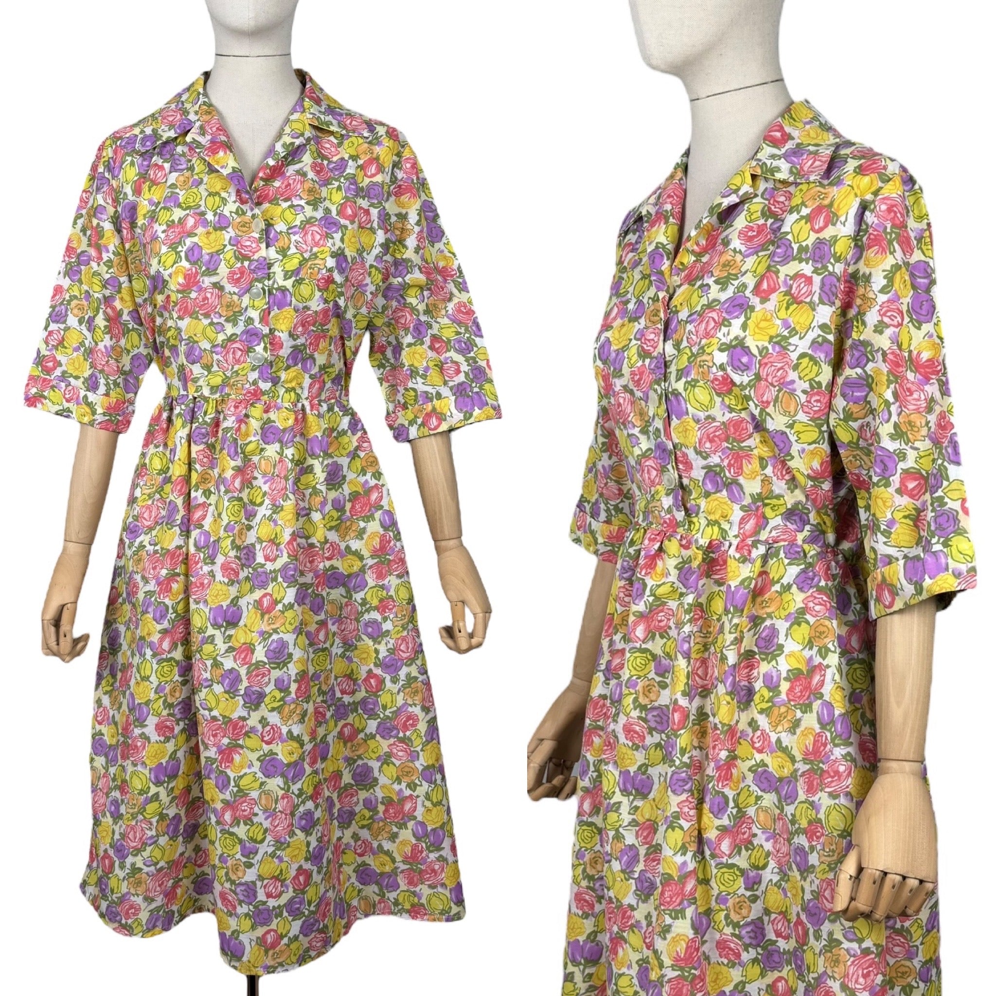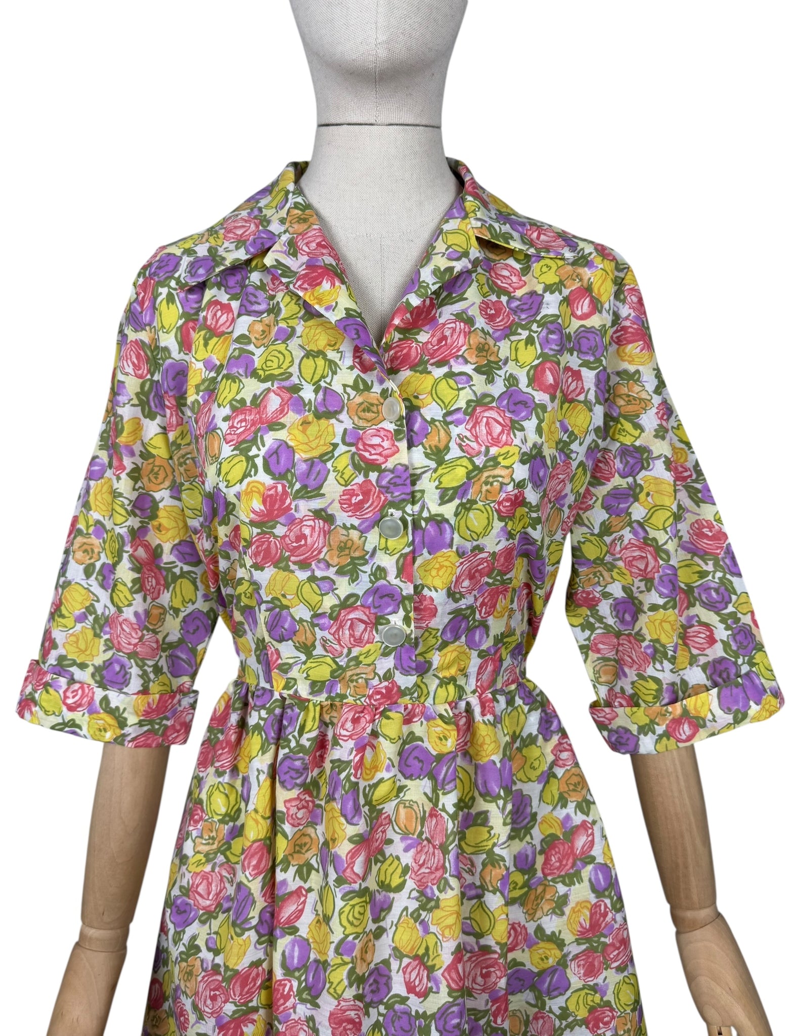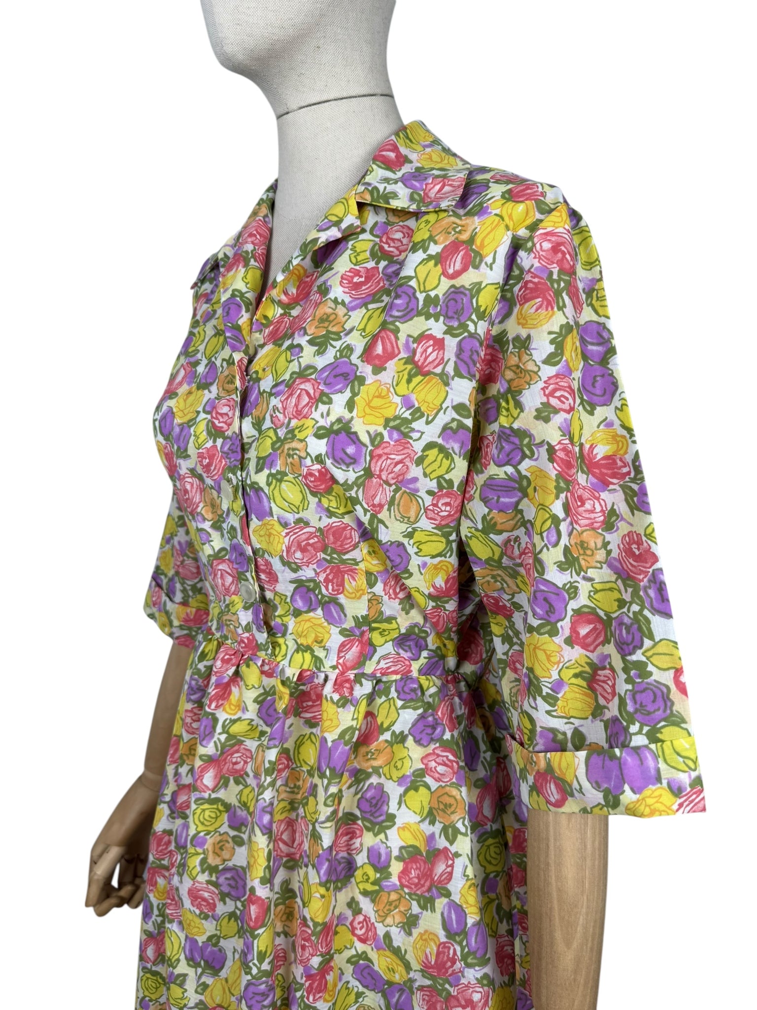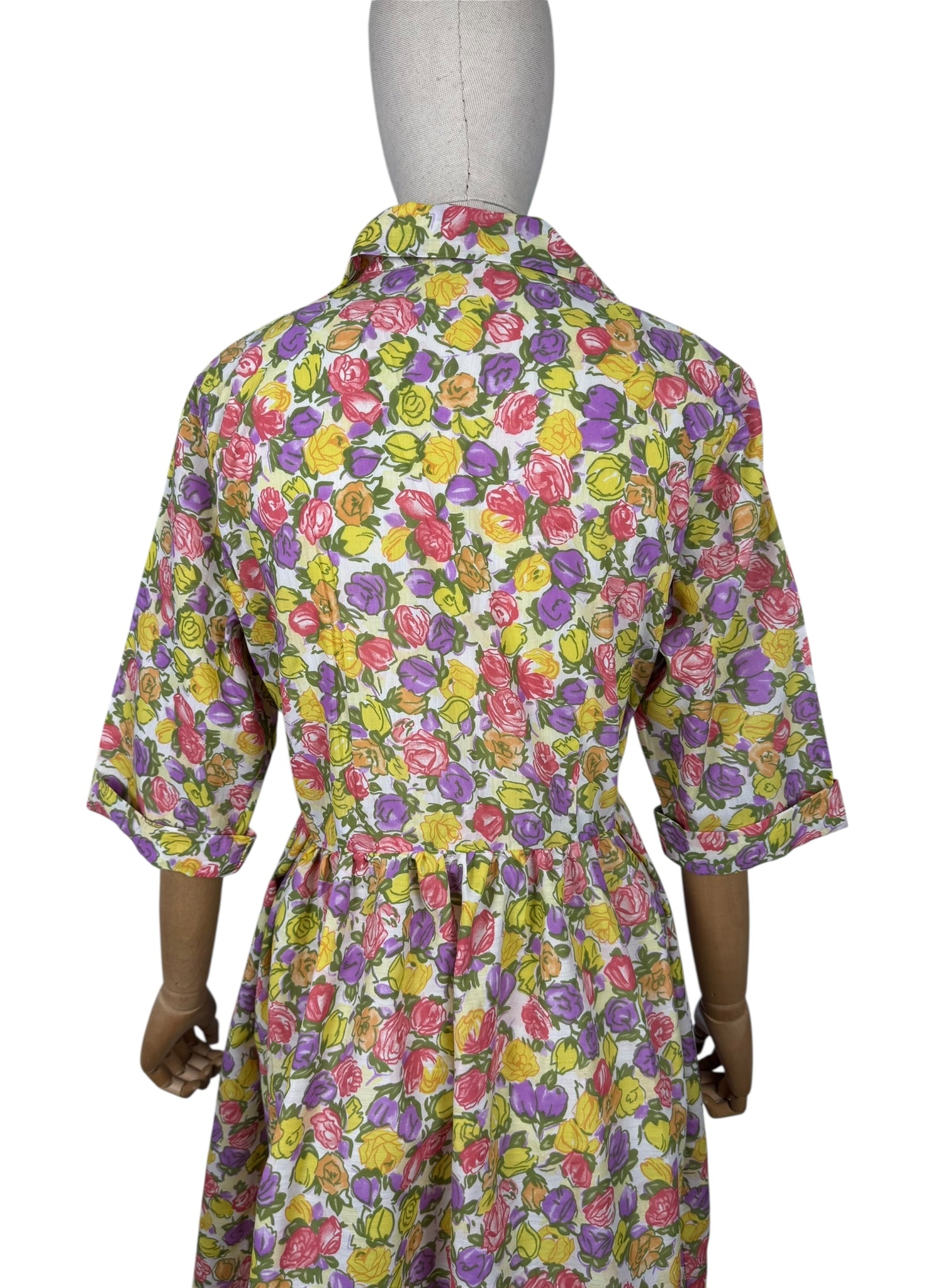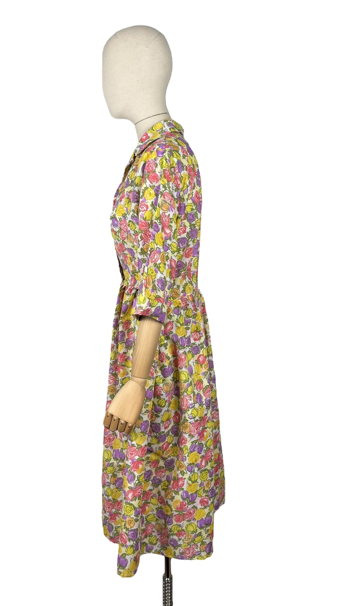 Featuring a button front bodice, which fastens with pearlised buttons, it has elbow length sleeves with neat cuffs, has a gathered skirt, fastens down the left side with a metal zip and has a neat collar.