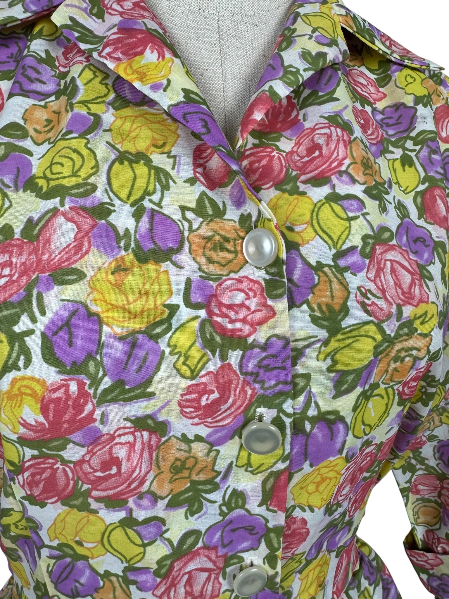 Made from a semi-sheer man made fabric it has a white base and a bold floral print in purple, yellow, green and orange.