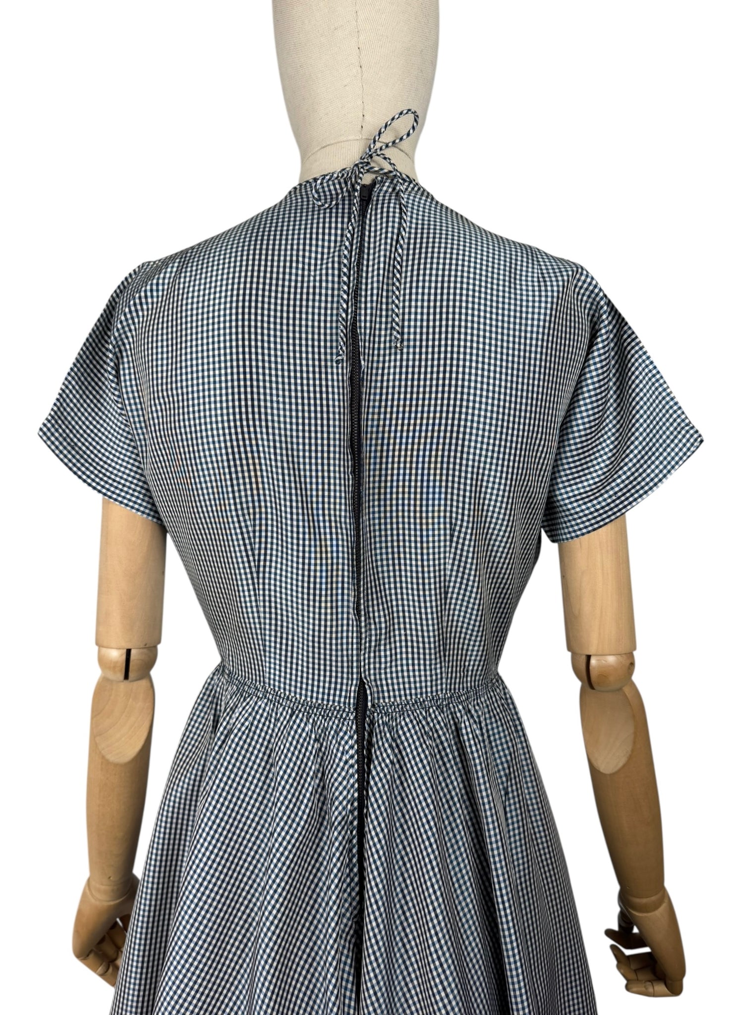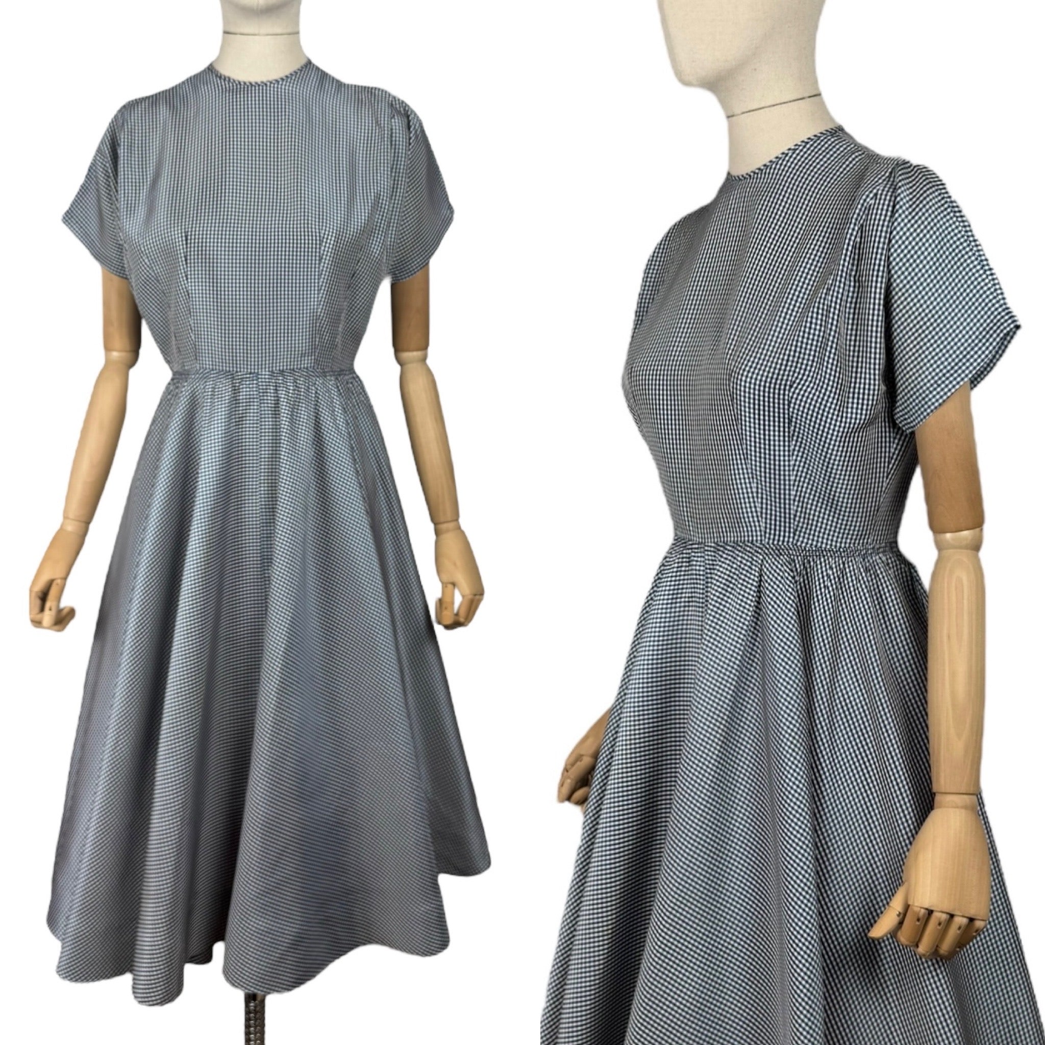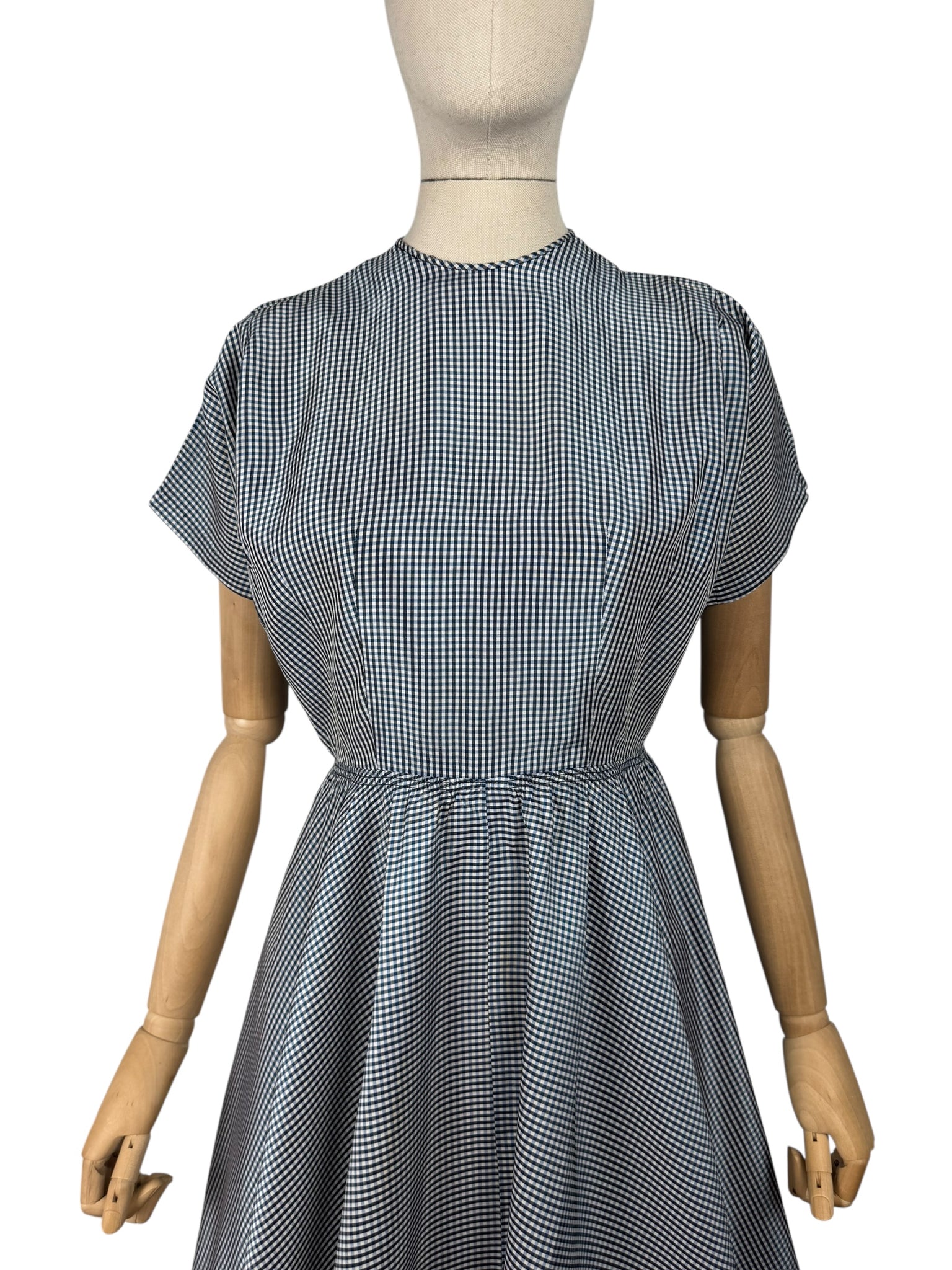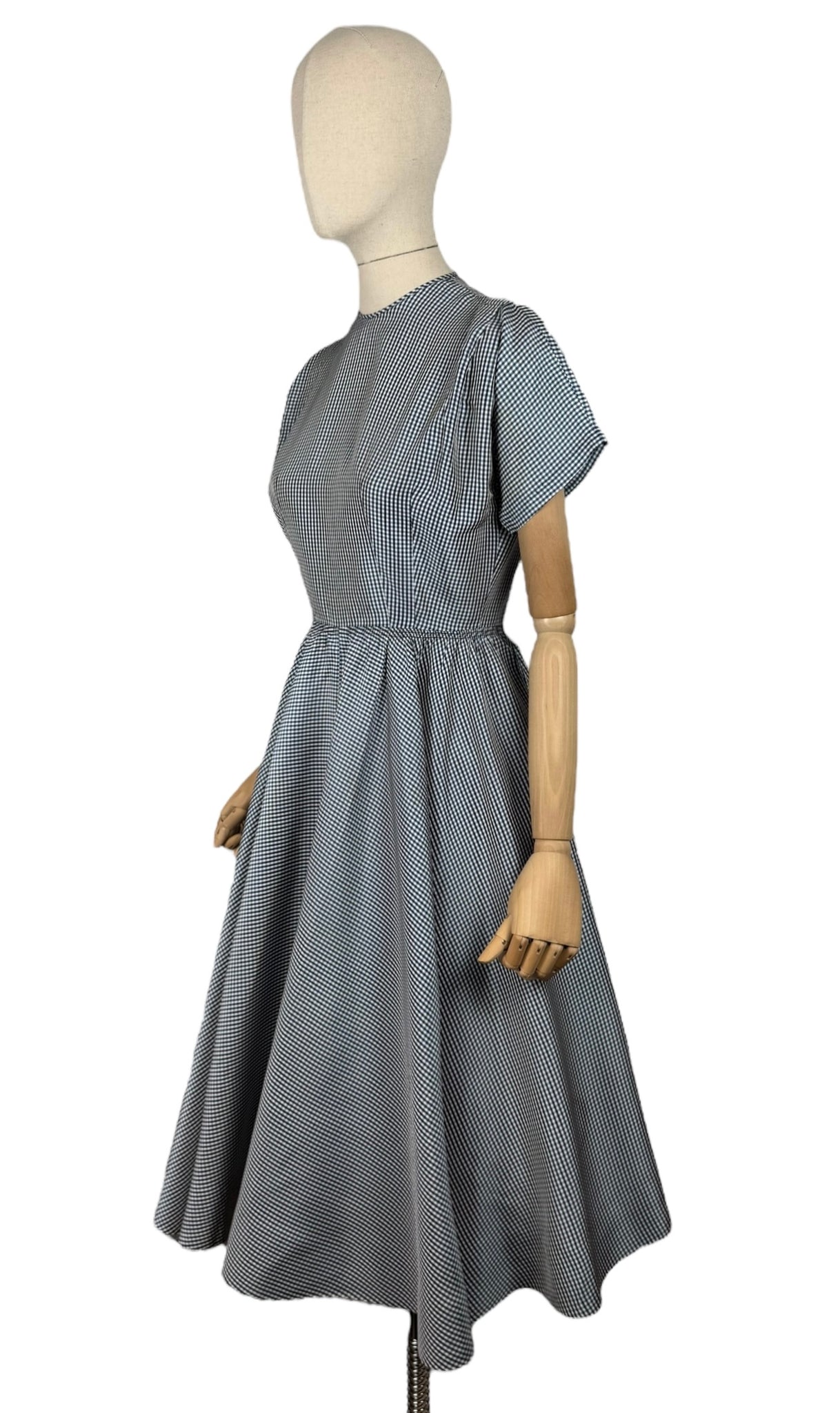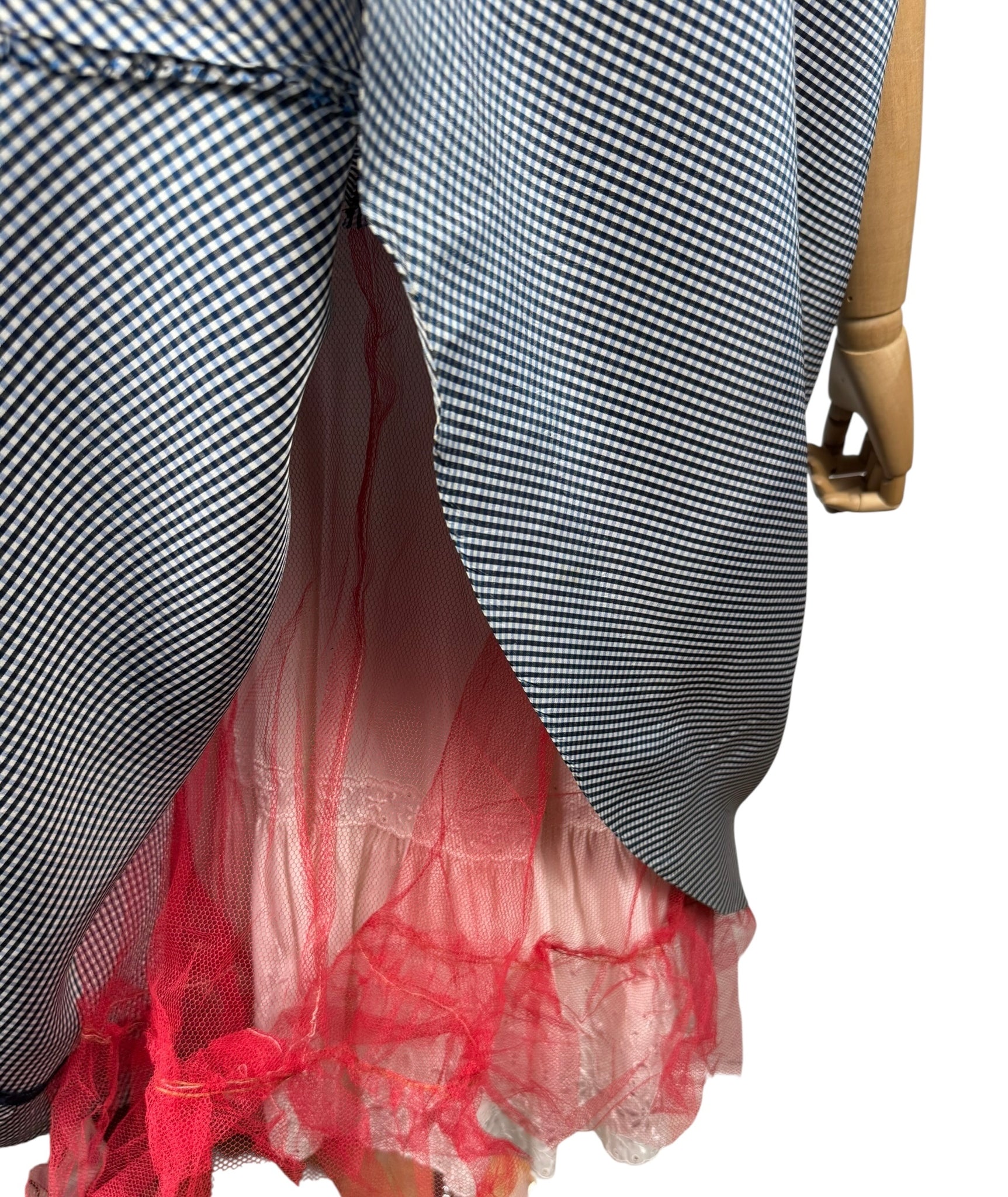 With a smooth fitting bodice and a very high neckline it has a neat tie in the back neck. The skirt is fabulously full and it has a vibrant red net petticoat underneath. It fastens down the back with a 21" metal zip.