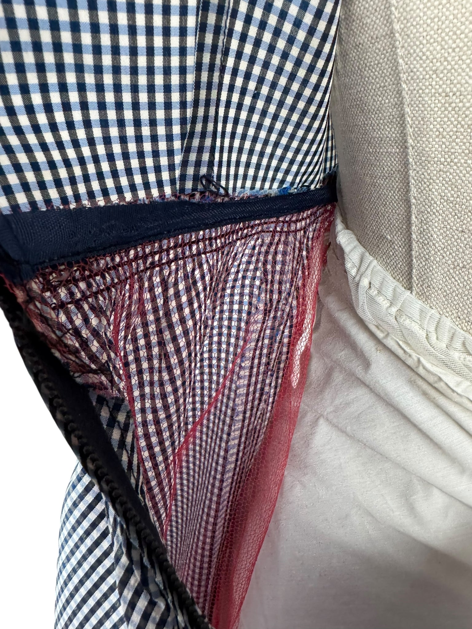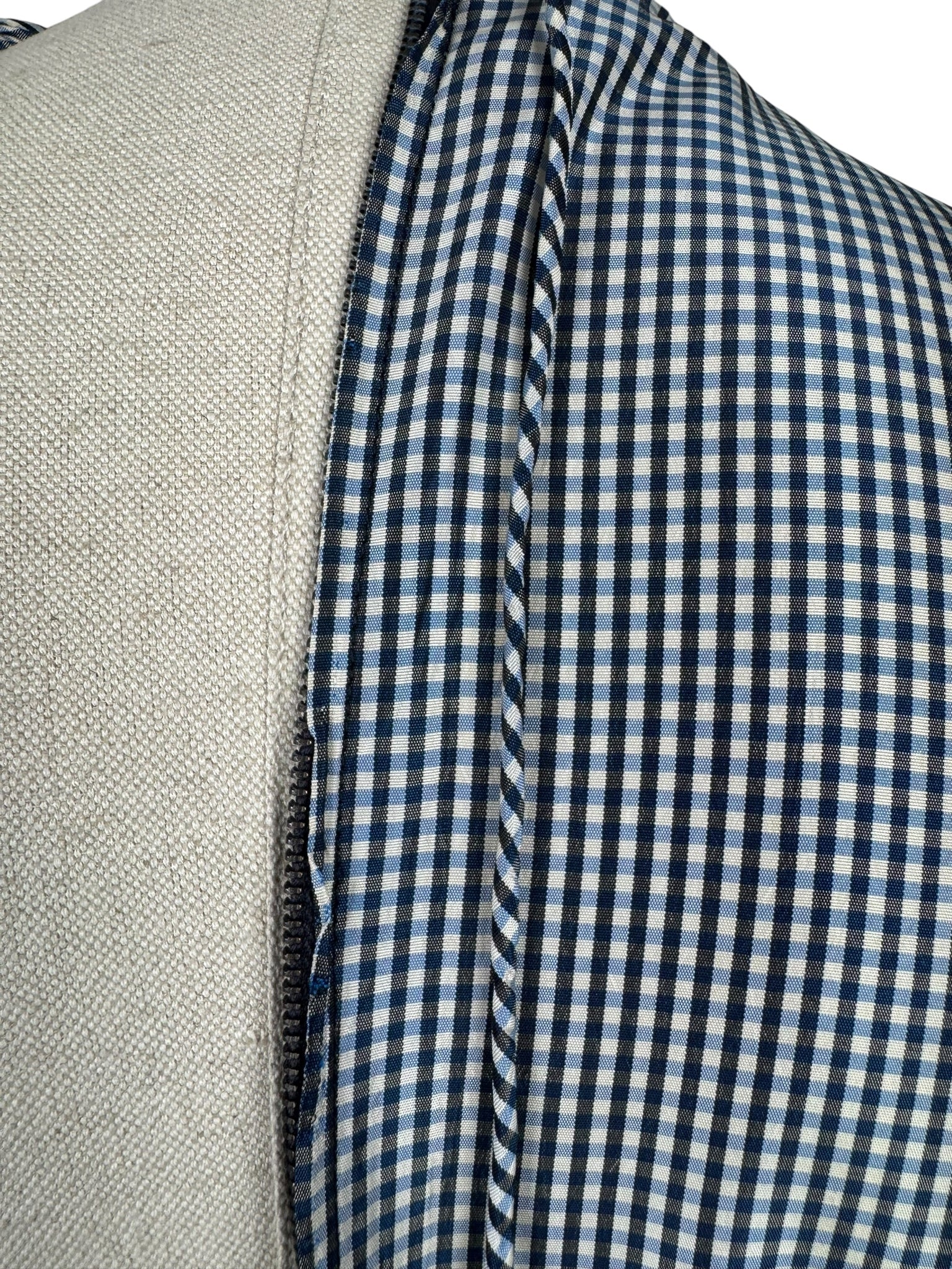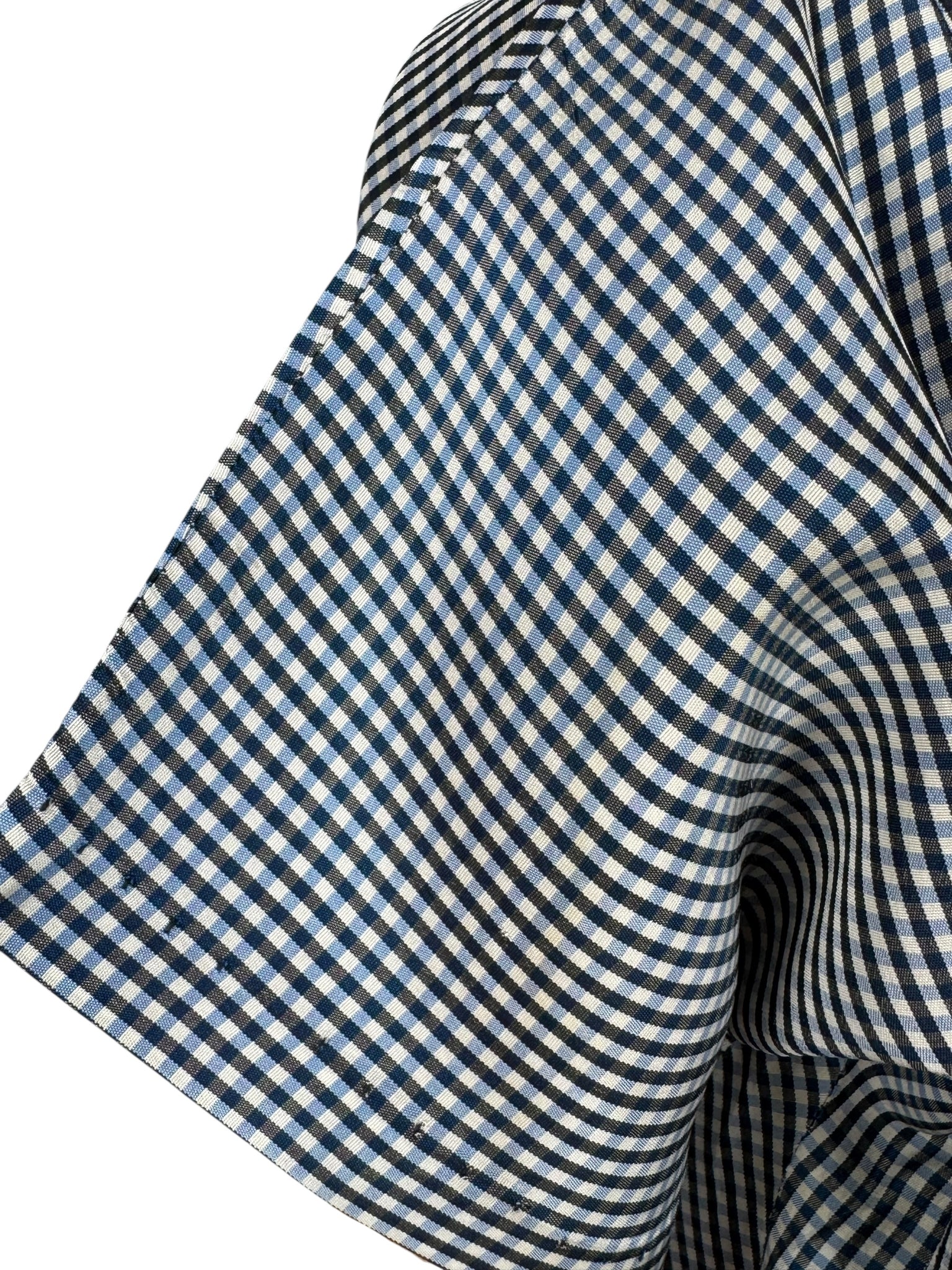 Made from taffeta it has a teeny check print in blue, black and white and in some lights the blue is more vibrant than in others and the fabric has a delightful sheen.