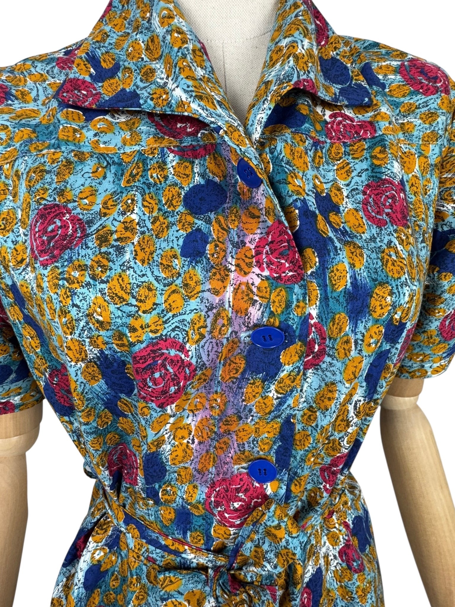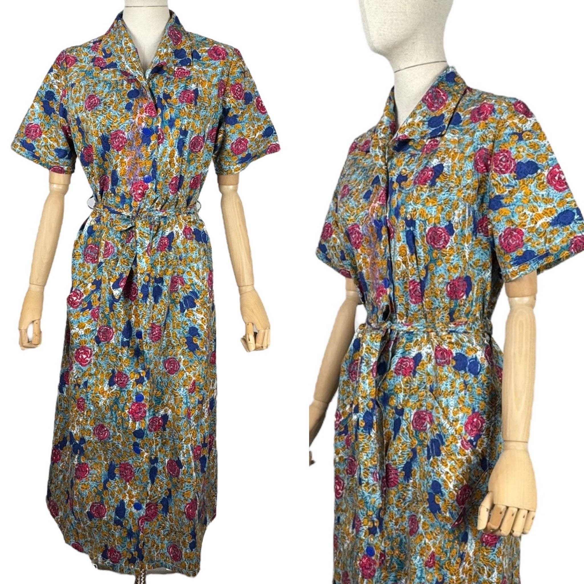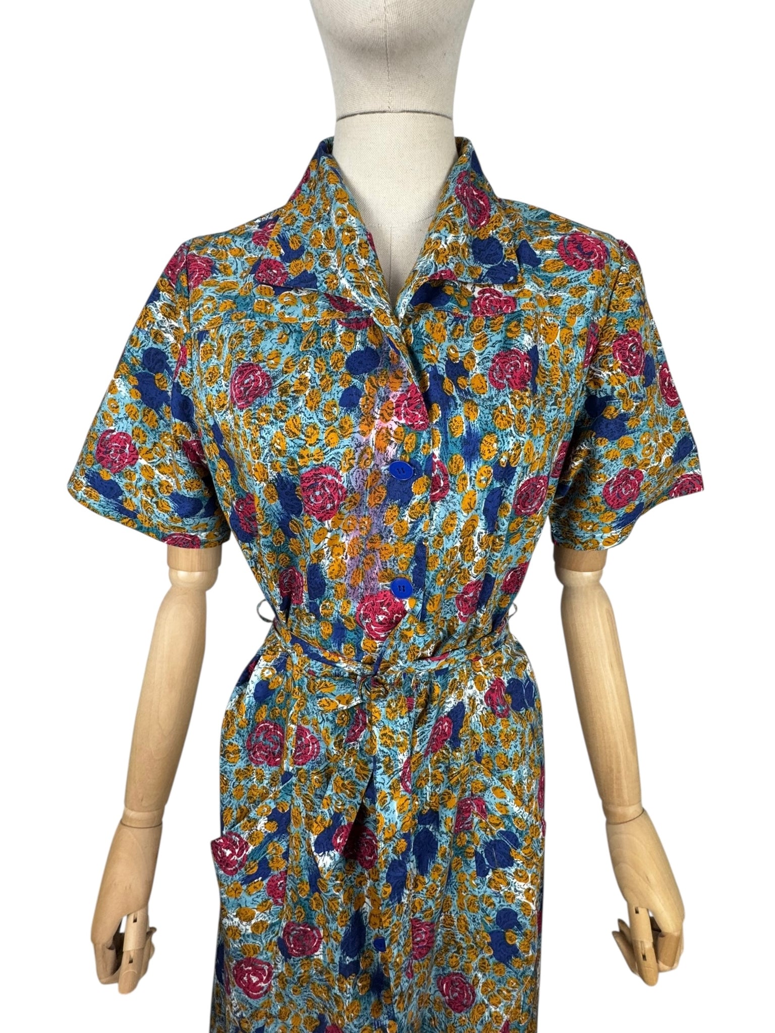 Made from crisp cotton it has a blue base with bold stylised floral worked in pink, blue, and mustard. A button through design it fastens with 9 blue buttons and still retains the original belt and also has triangle shaped patch pockets!