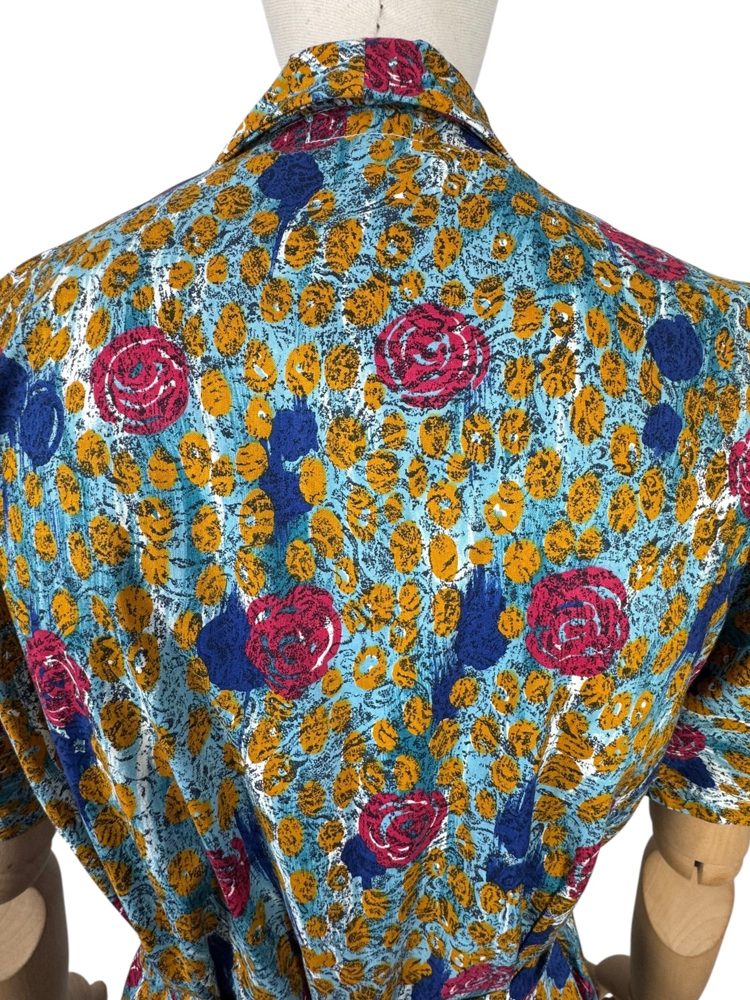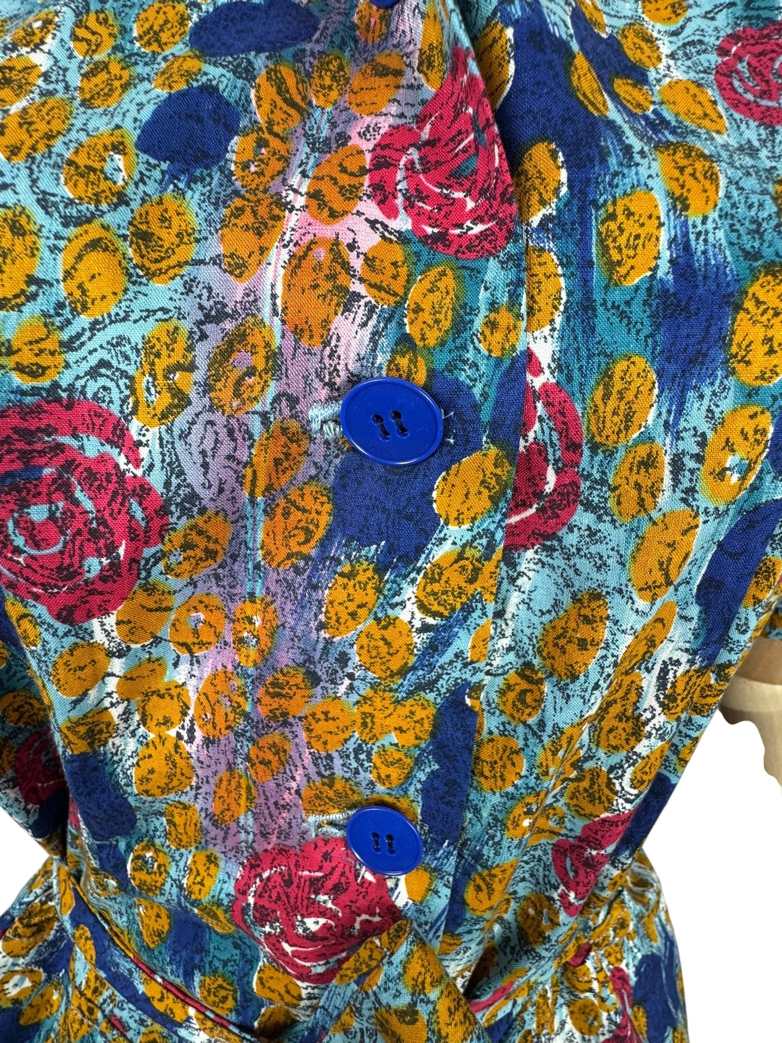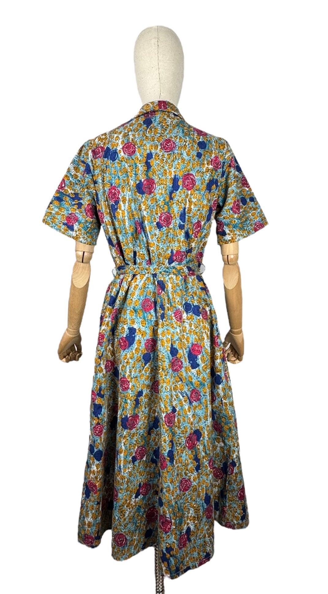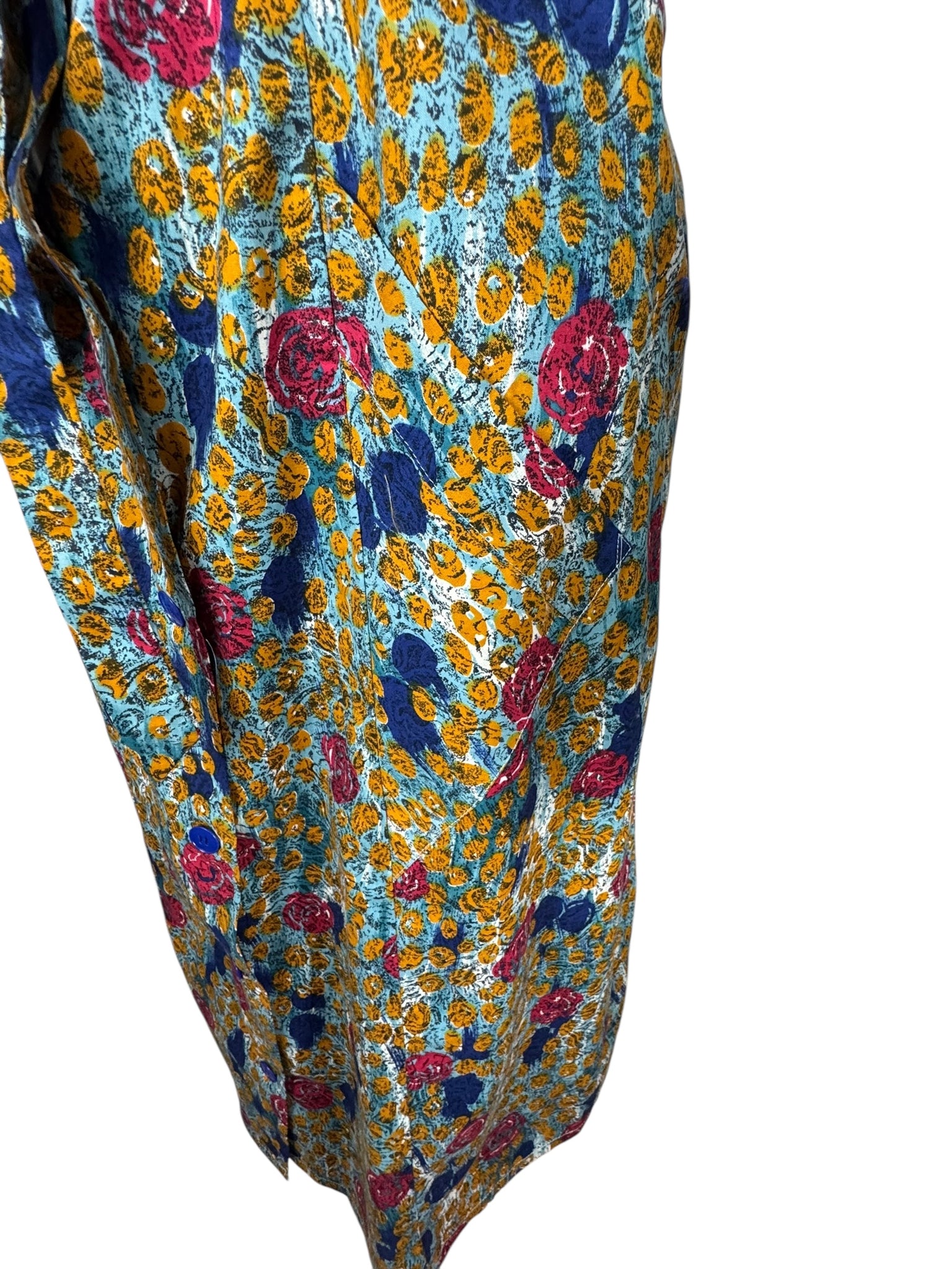 Made from crisp cotton it has a blue base with bold stylised floral worked in pink, blue, and mustard. A button through design it fastens with 9 blue buttons and still retains the original belt and also has triangle shaped patch pockets!