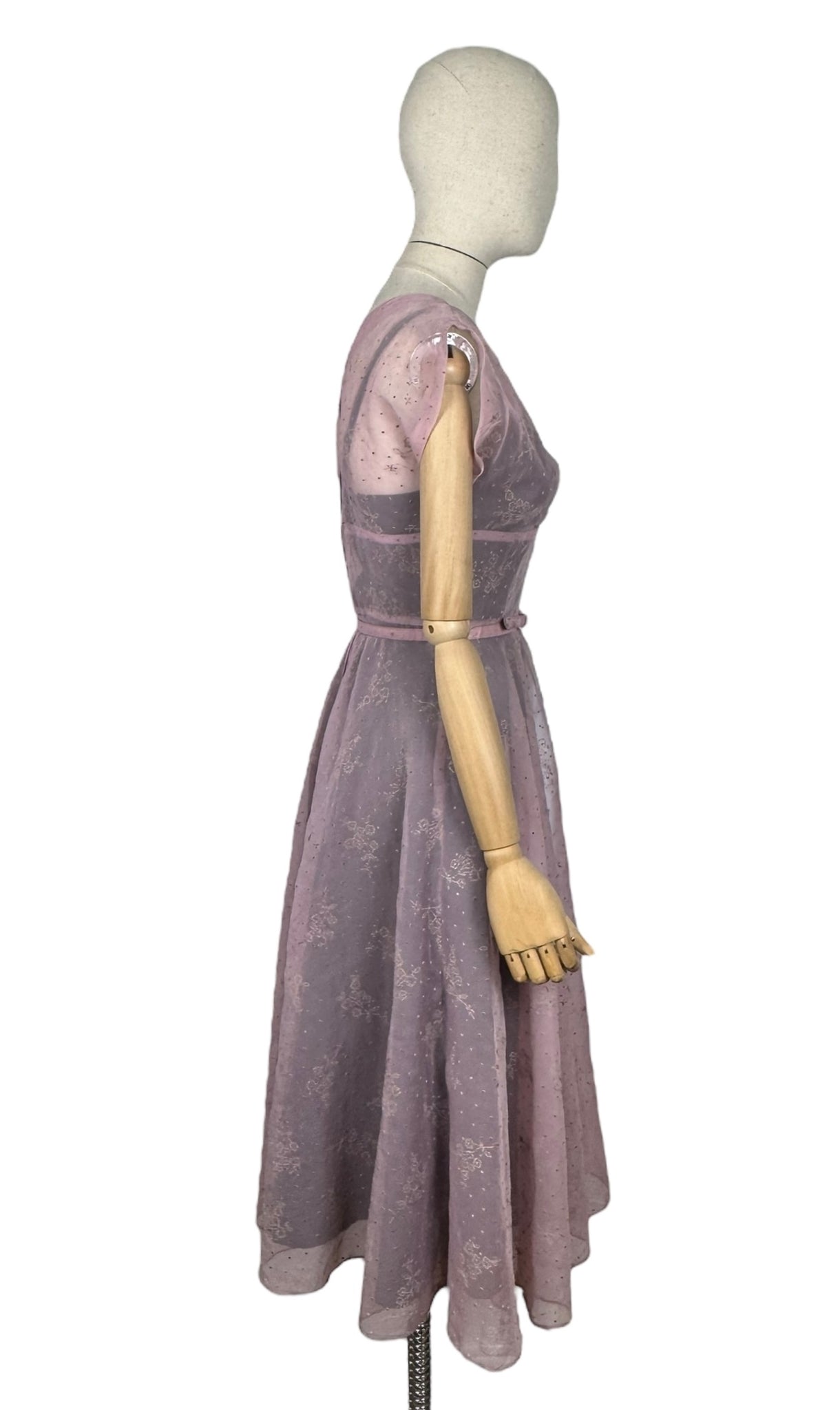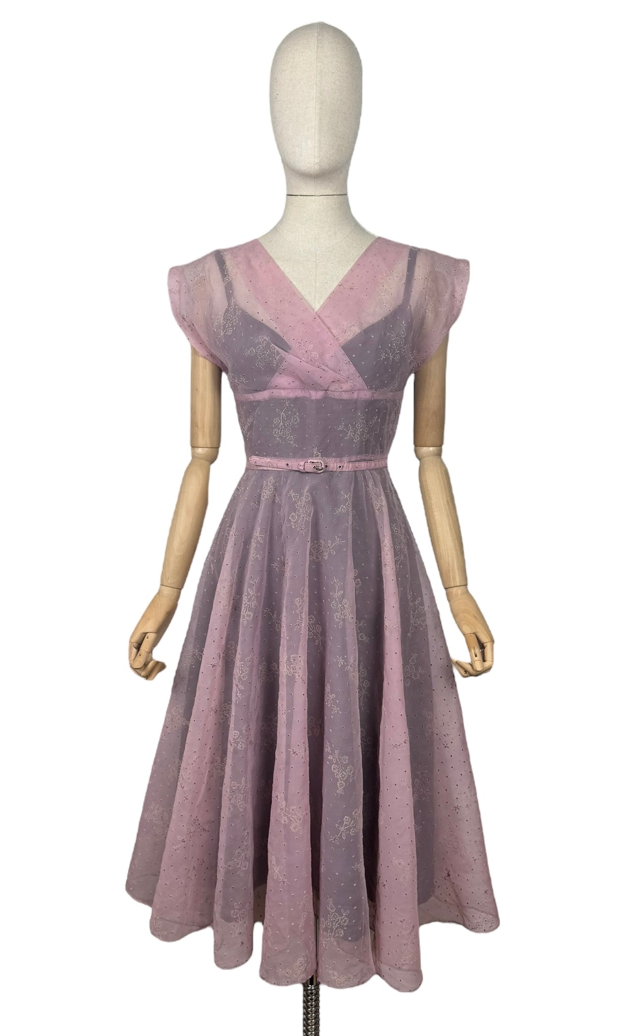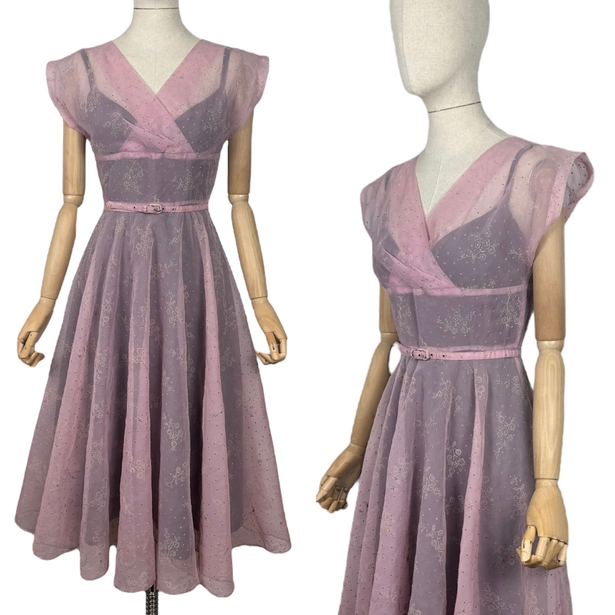 Made from sheer nylon it is a classic piece from the era. Featuring a crossover bodice with a fitted waist it has a fabulously full skirt, which would look amazing worn with a petticoat. It fastens down the centre back with a long metal zip and still has the original belt.