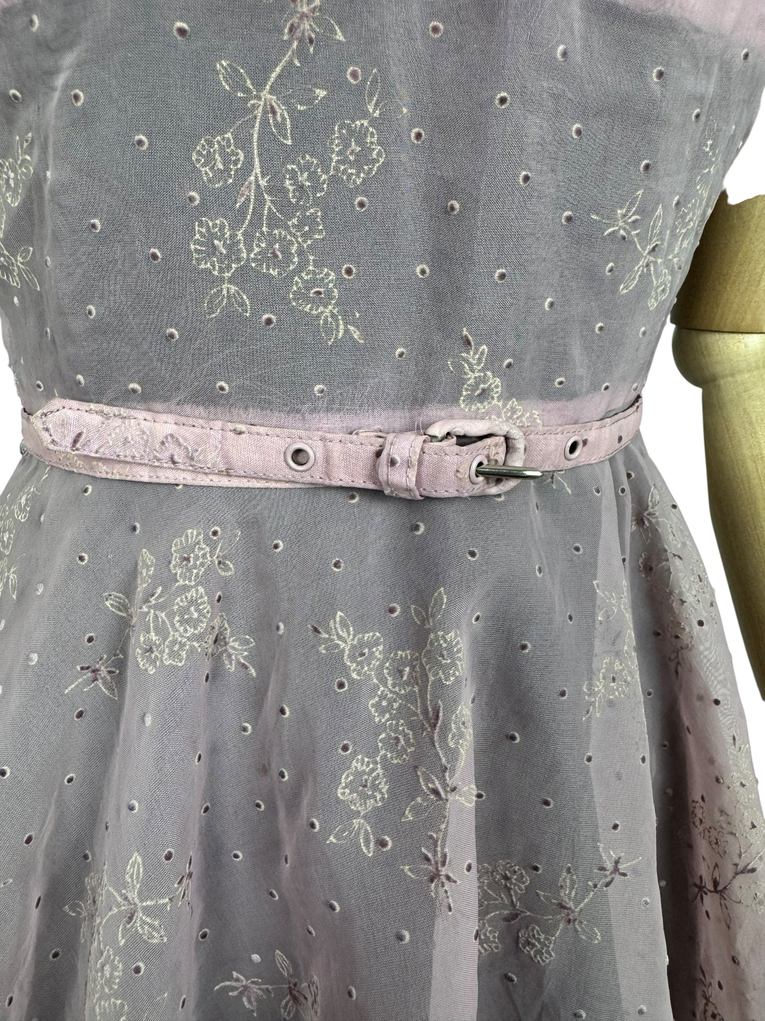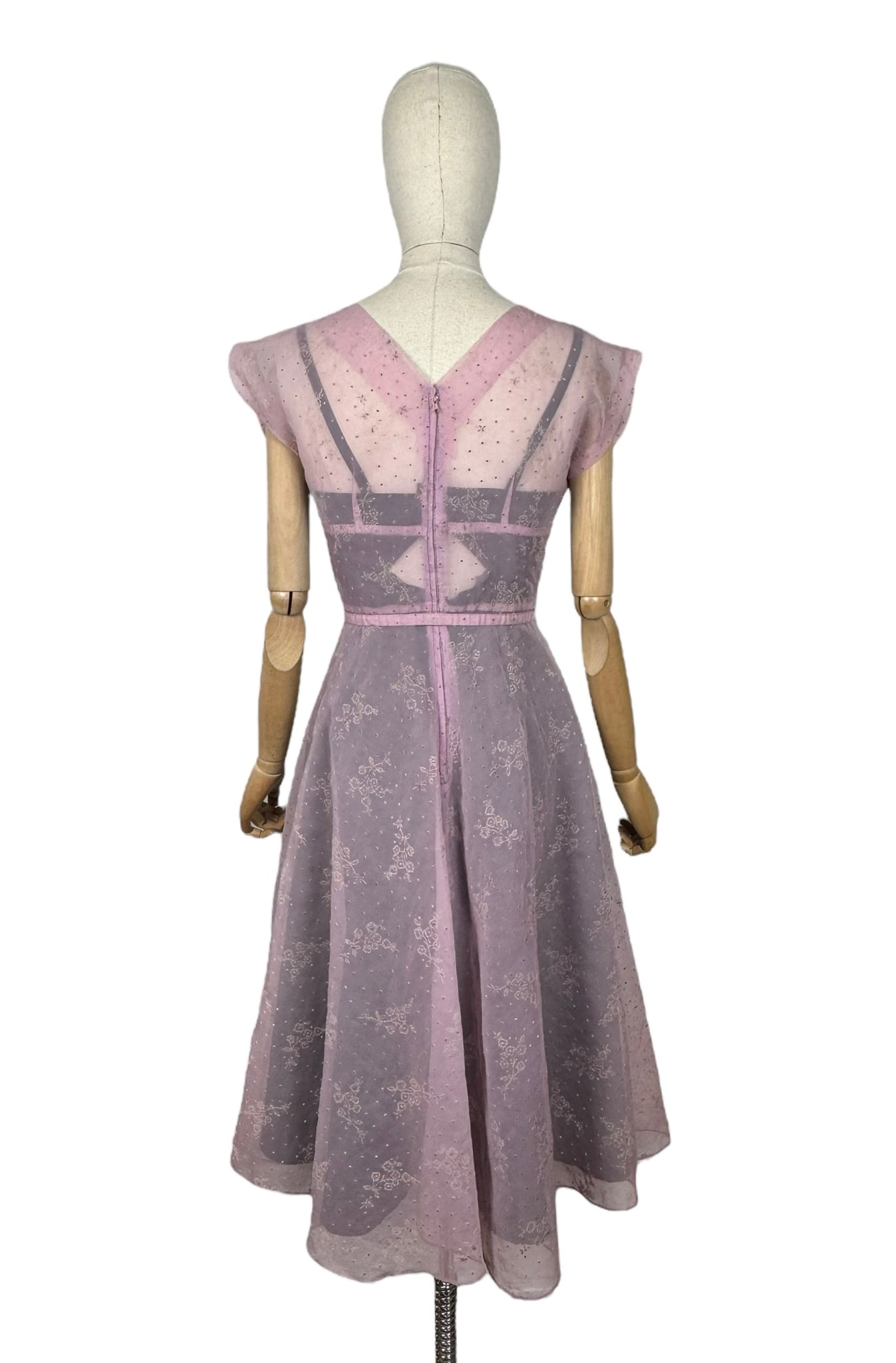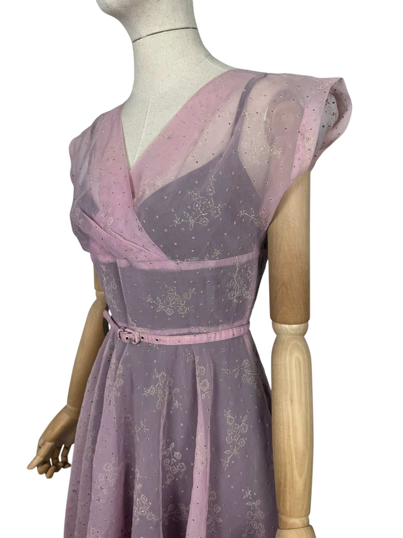 Made from sheer nylon it is a classic piece from the era. Featuring a crossover bodice with a fitted waist it has a fabulously full skirt, which would look amazing worn with a petticoat. It fastens down the centre back with a long metal zip and still has the original belt.
