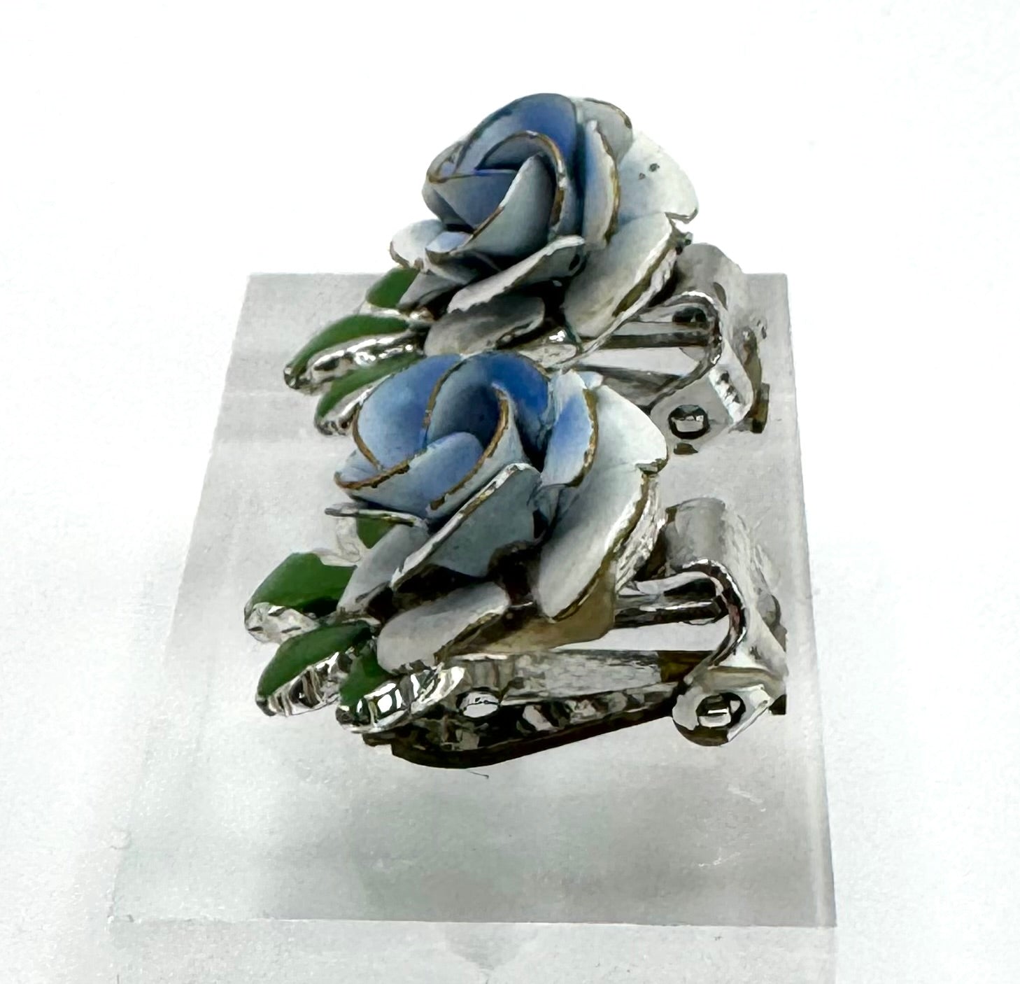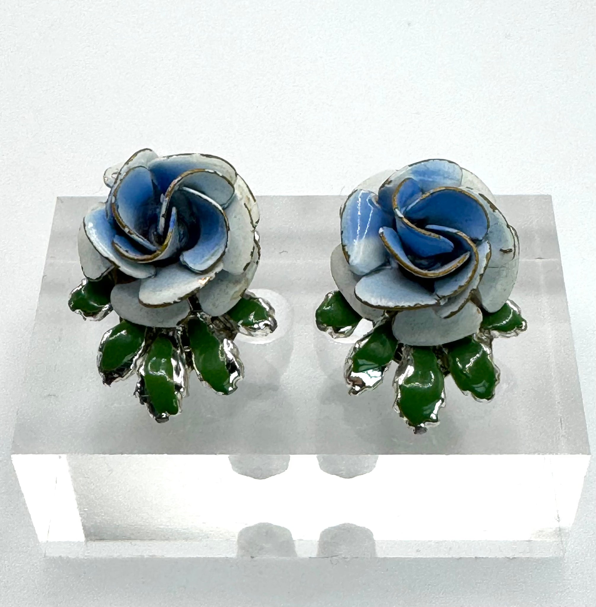 White metal clip on earrings of with two-tone blue enamel roses and green enamel leaves.
