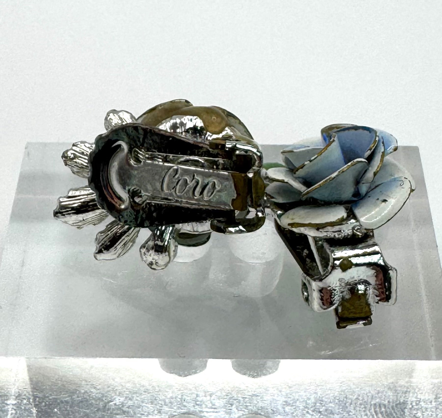 Original 1950's Mid Century Clip on Earrings by Coro - Blue and Green Enamel Roses