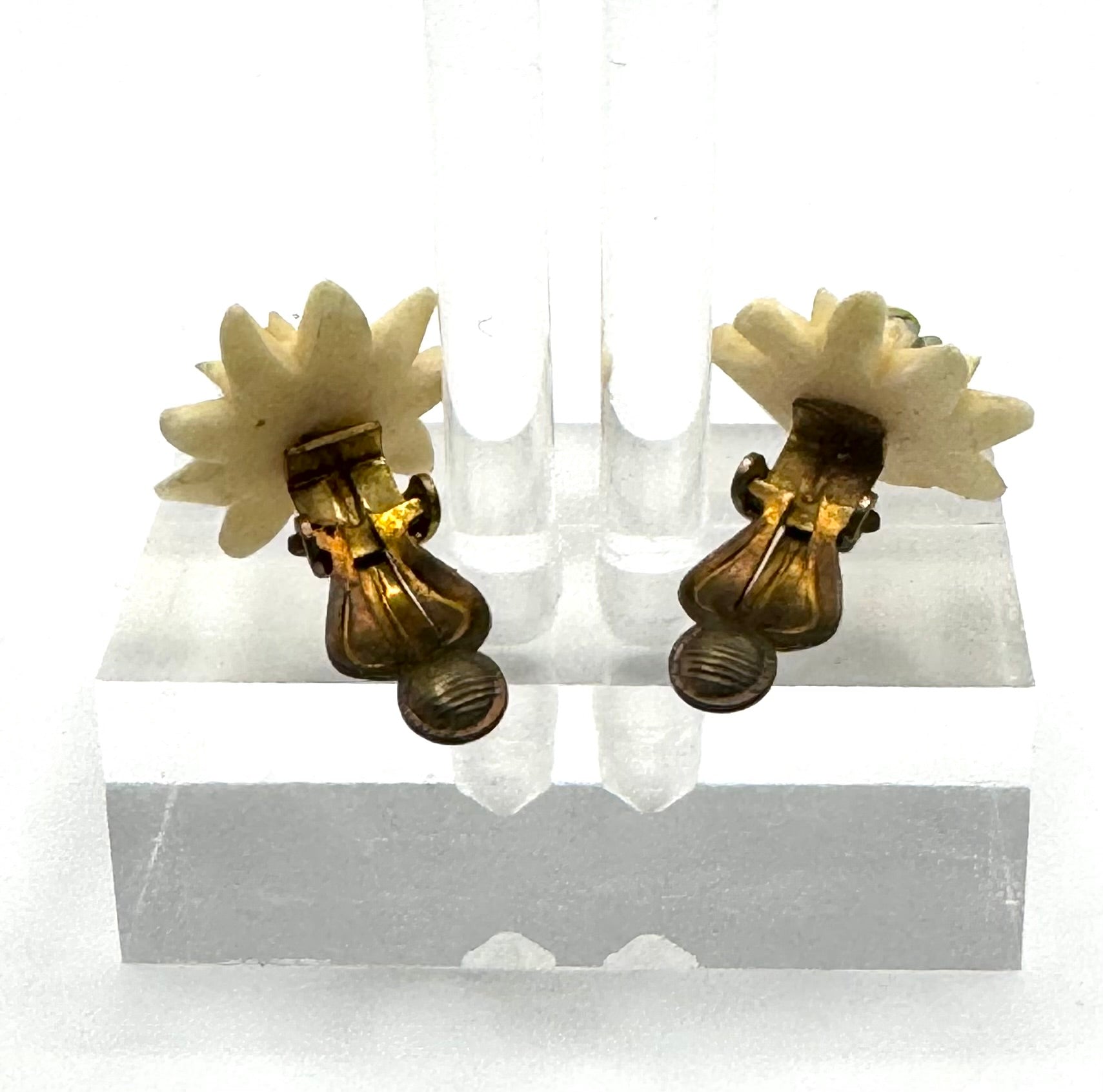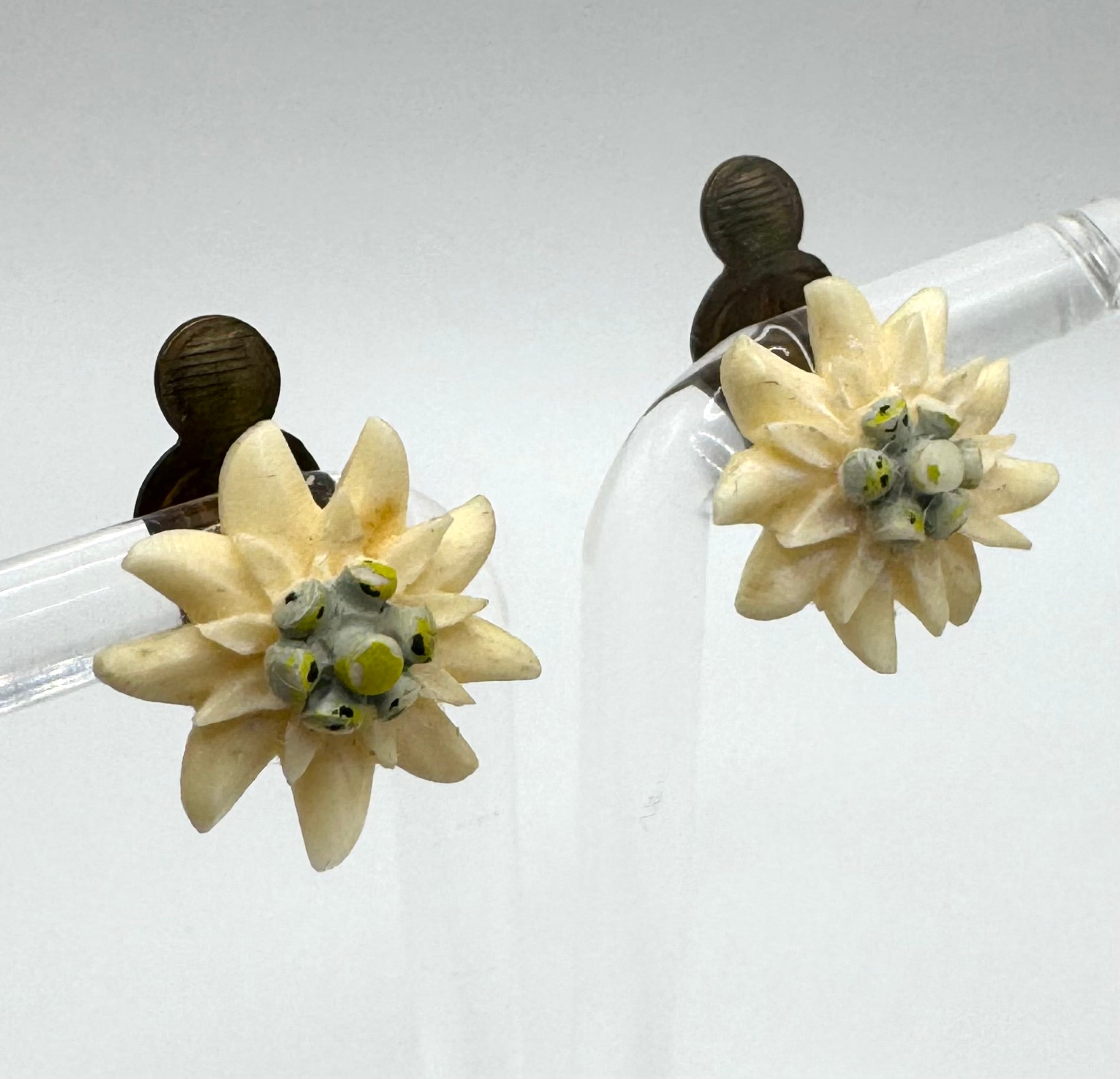 These earrings are finely carved edelweiss with grey painted middles on gold tone metal clips.