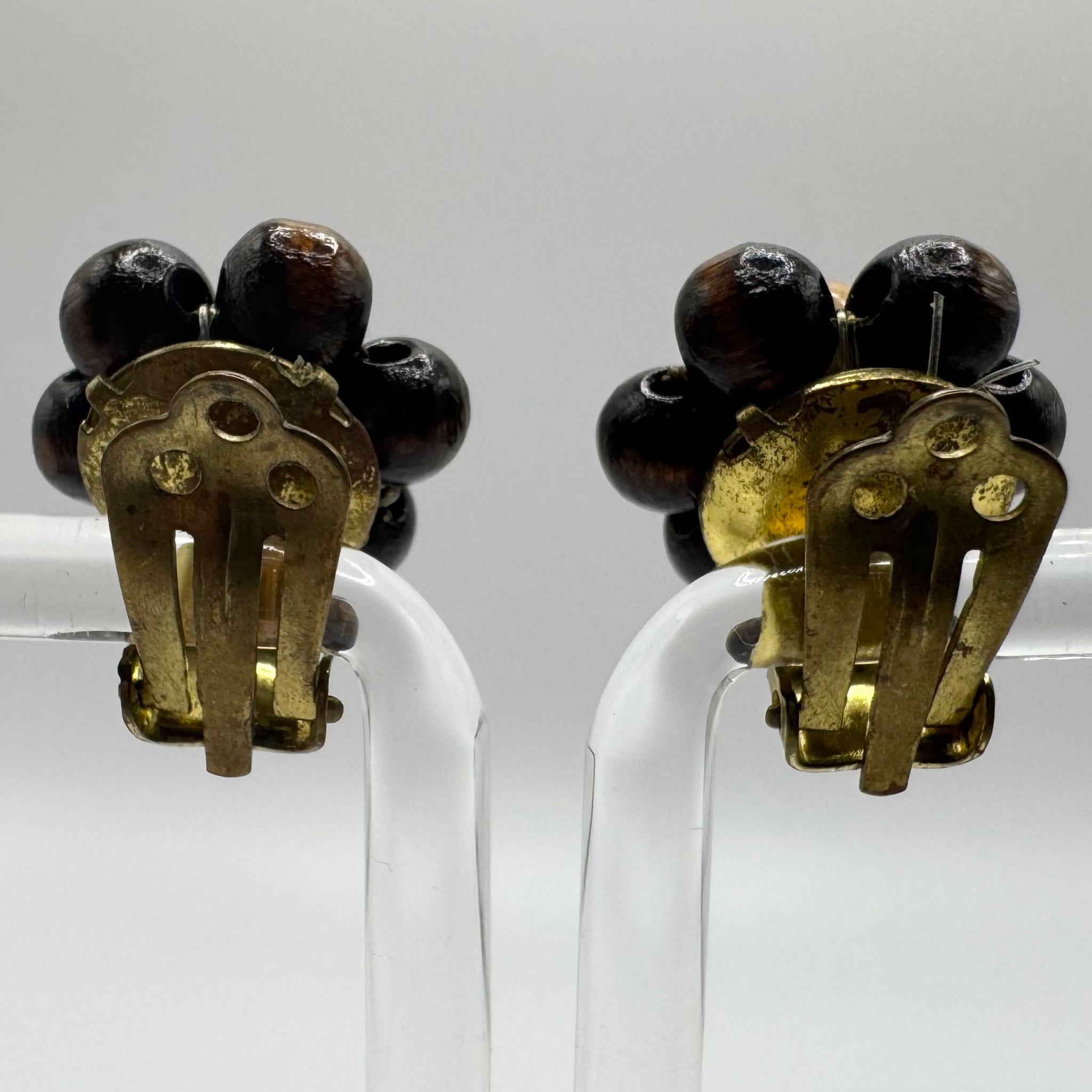Featuring varnished wooden beads, arranged into a flower shape, they fasten with gold-tone clips.