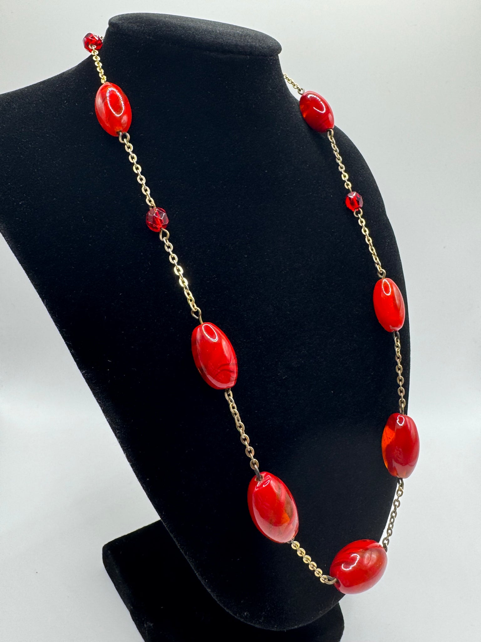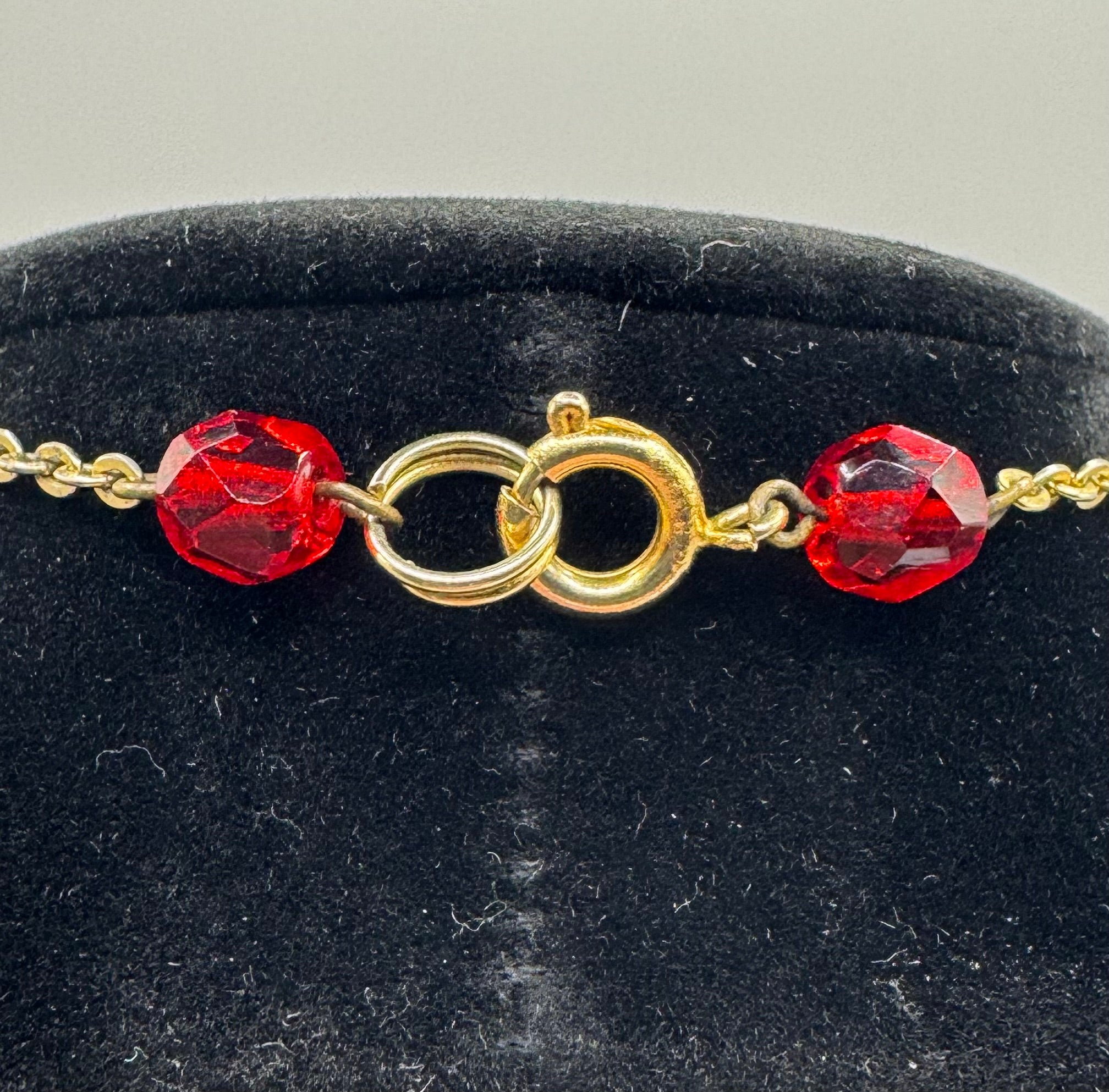 With a gold-tone chain it features 7 lozenge shaped red glass beads with 4 small faceted spacer beads.
