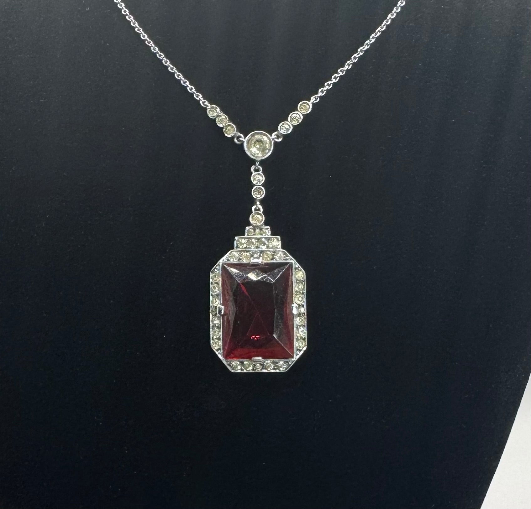 Featuring a red glass droplet, surrounded by teeny clear paste, it is set in white metal and comes on a thin white metal chain.