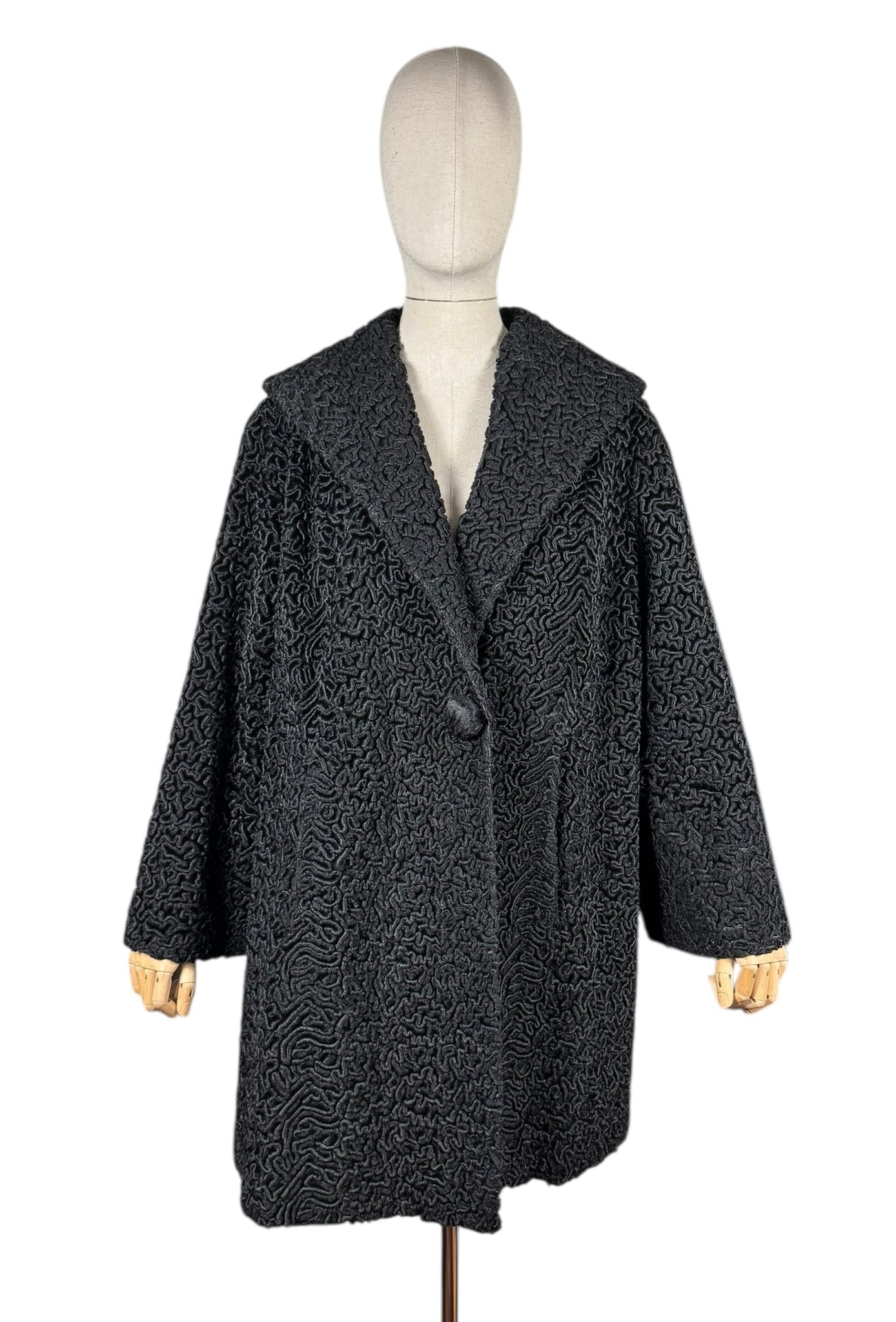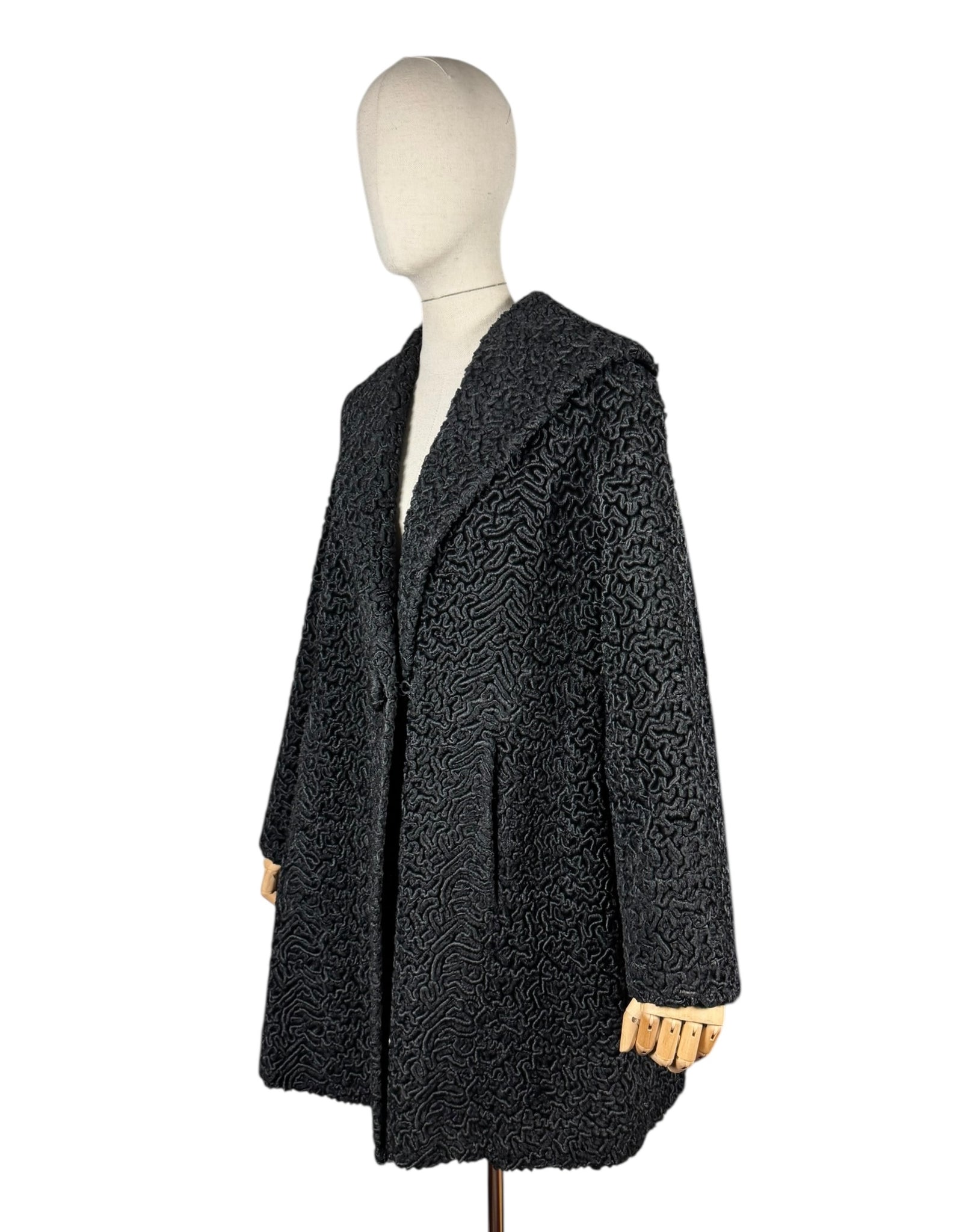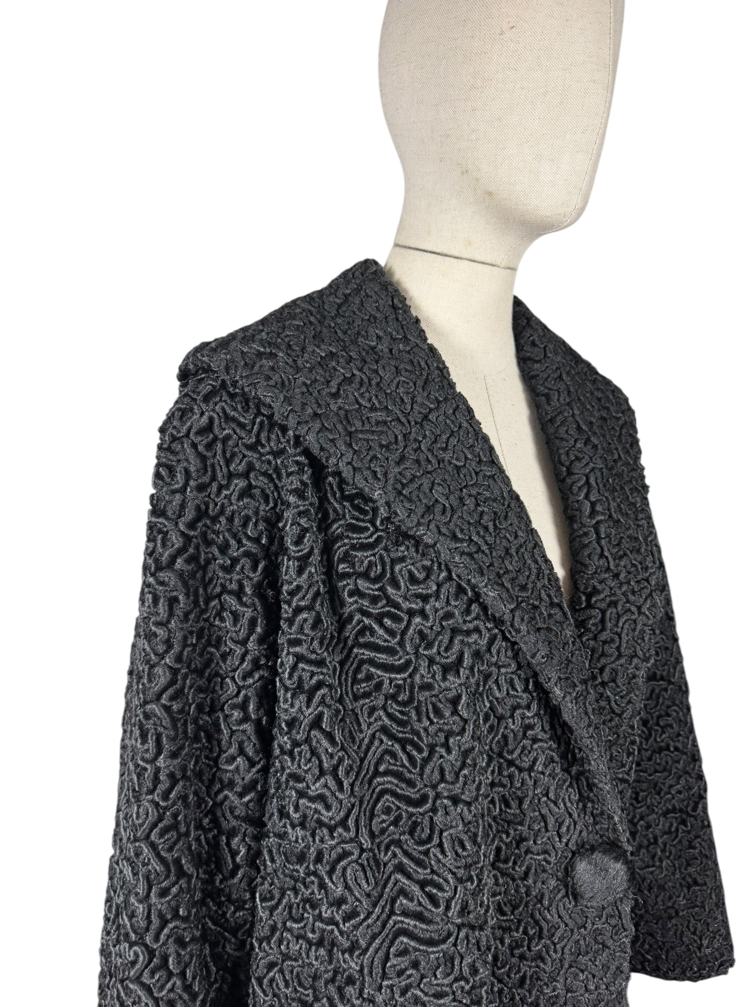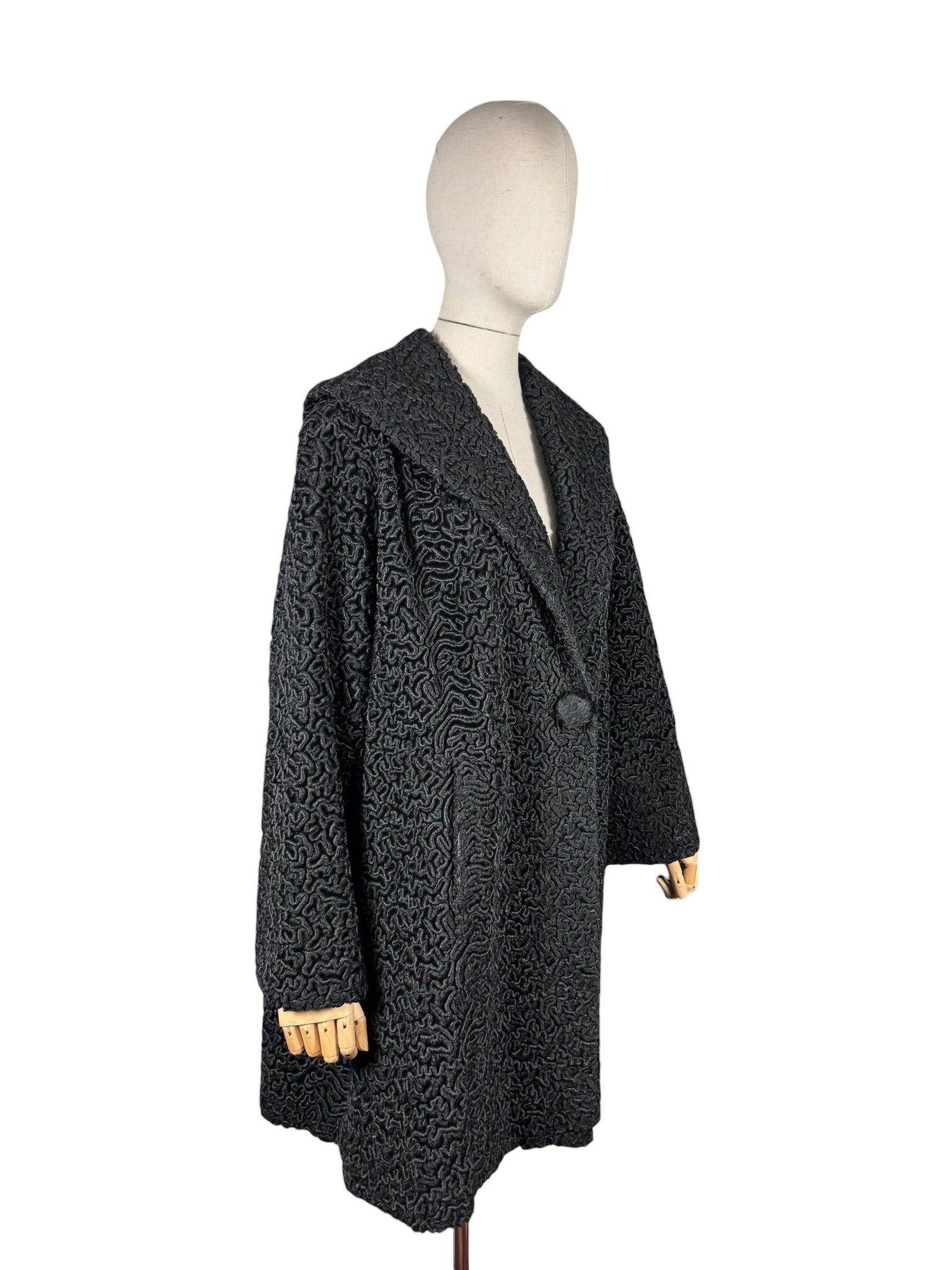 Made from inky black curly Astrakhan it is a thick, heavy coat meaning it's wonderfully warm for winter. It features a deep shawl collar, a hook fastening with a decorative button, is fully lined, has pockets and has a swing back giving great movement as you walk.