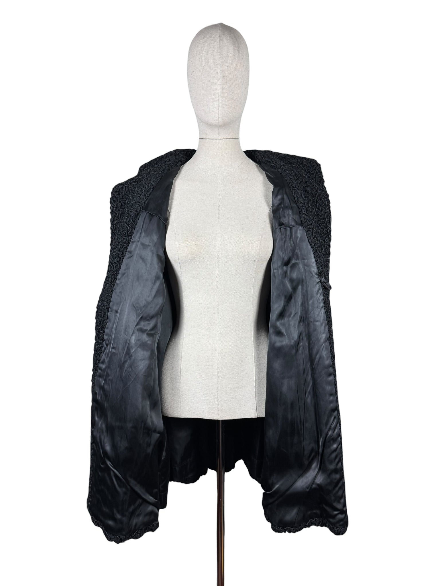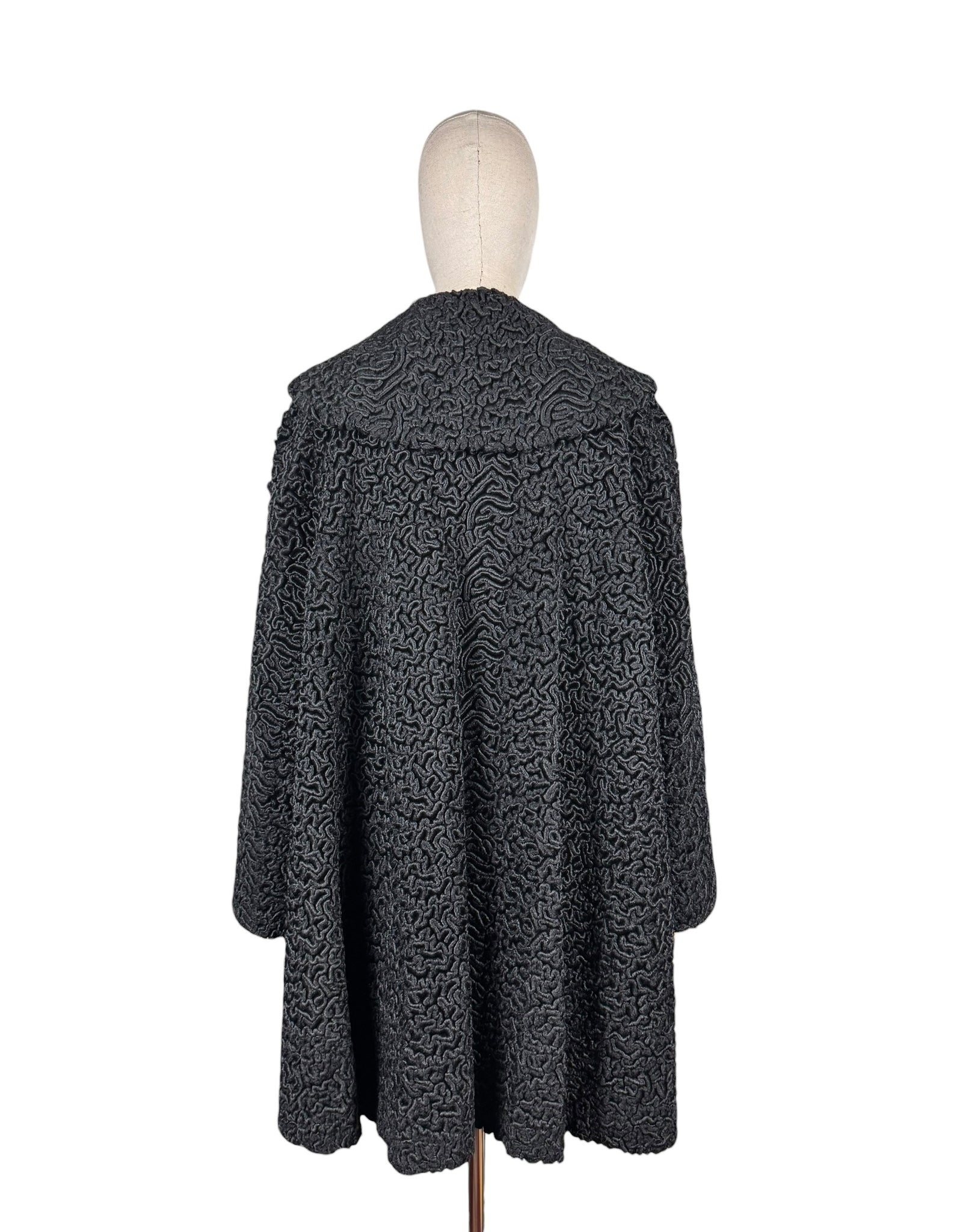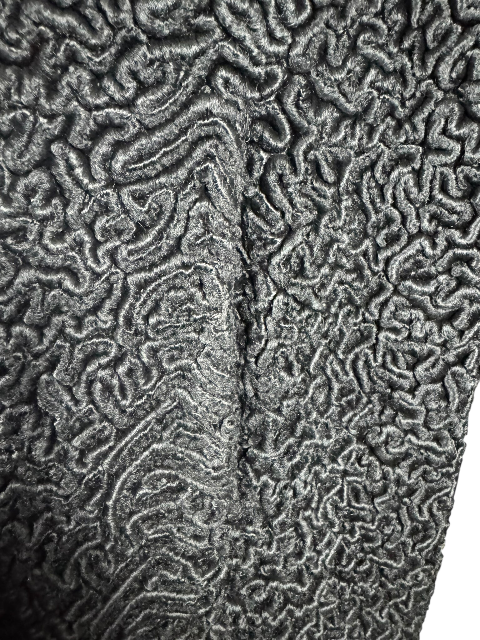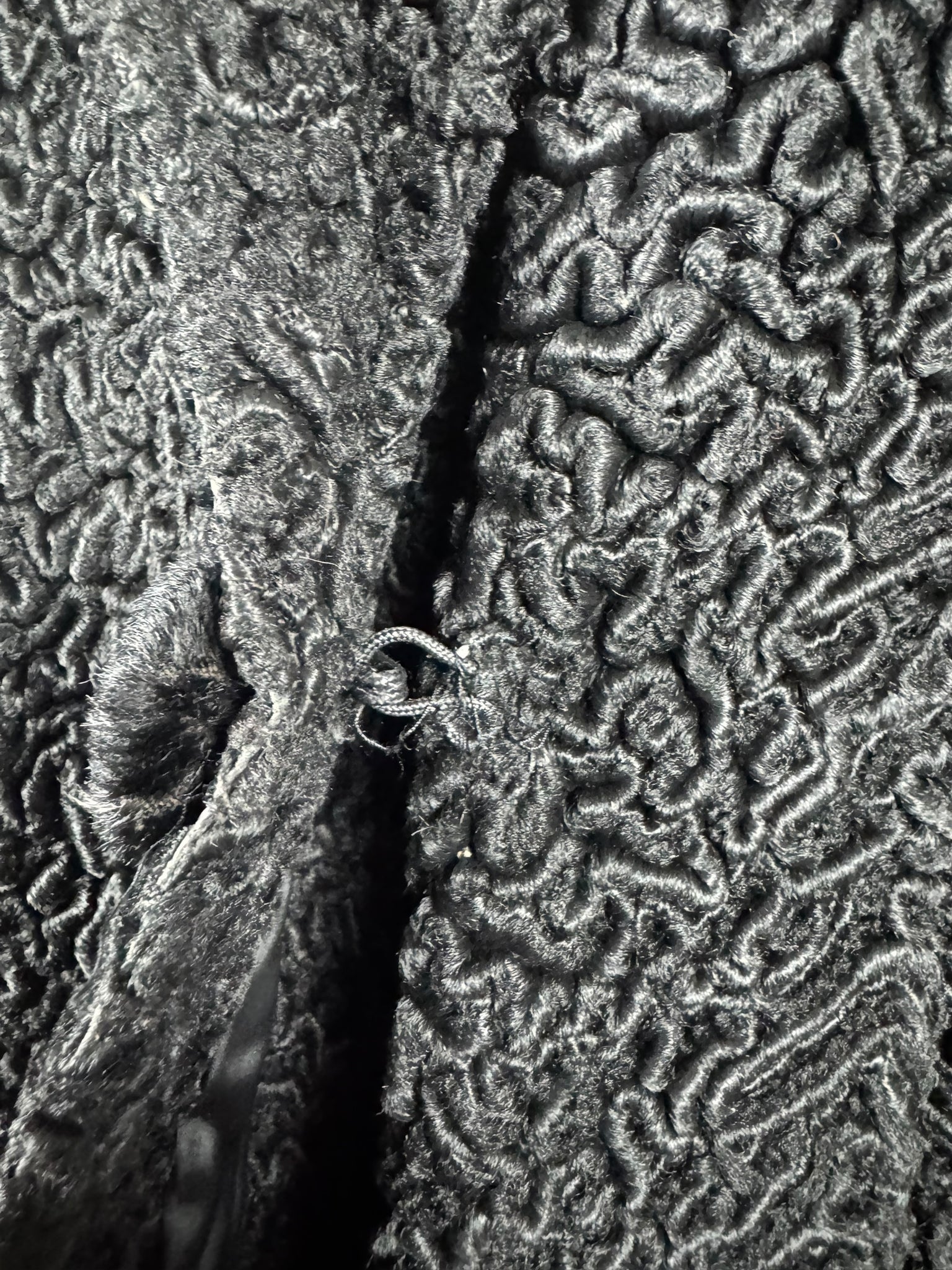 Made from inky black curly Astrakhan it is a thick, heavy coat meaning it's wonderfully warm for winter. It features a deep shawl collar, a hook fastening with a decorative button, is fully lined, has pockets and has a swing back giving great movement as you walk.