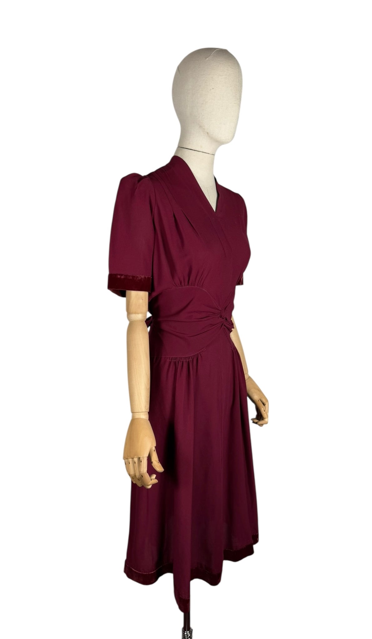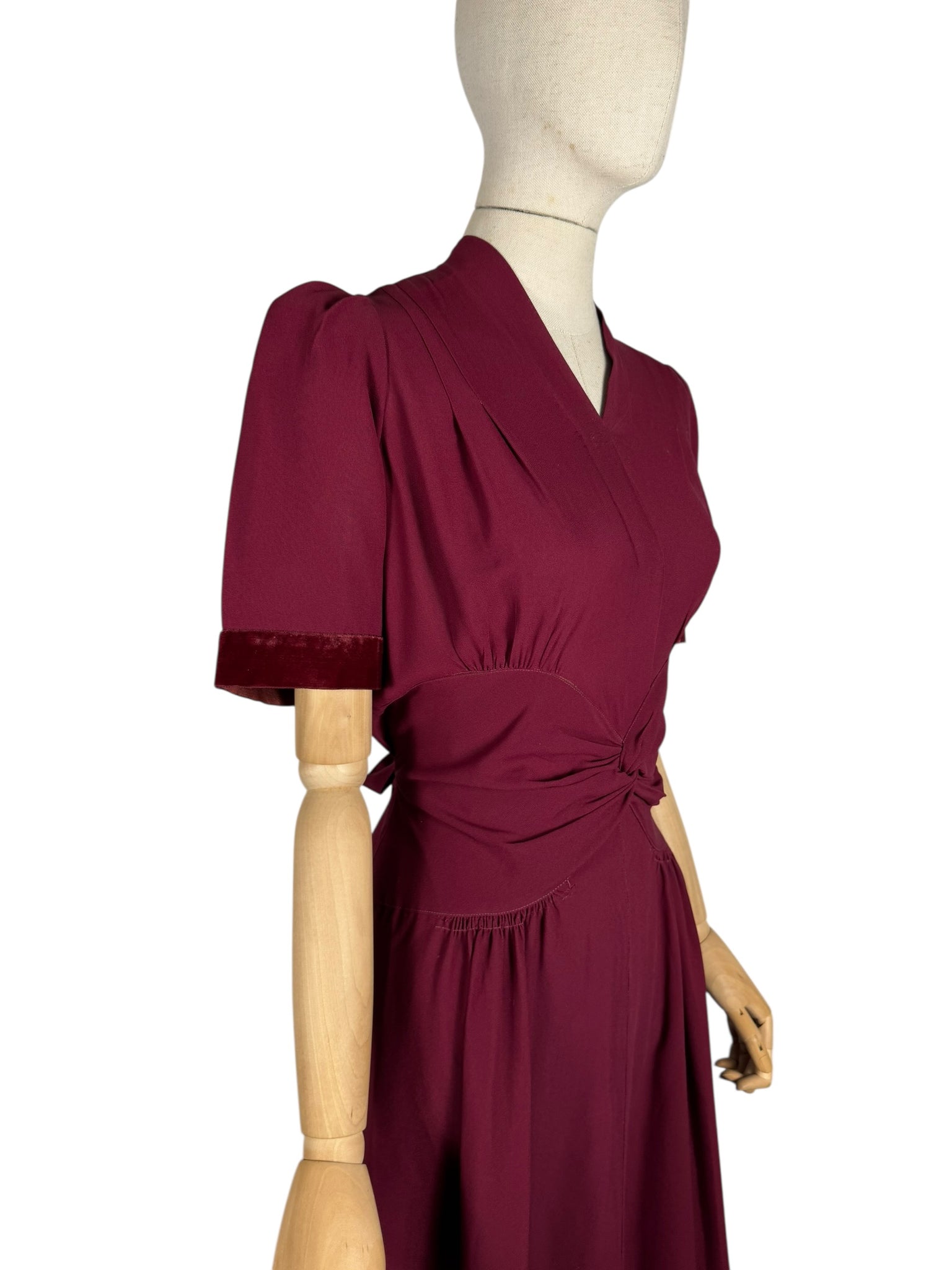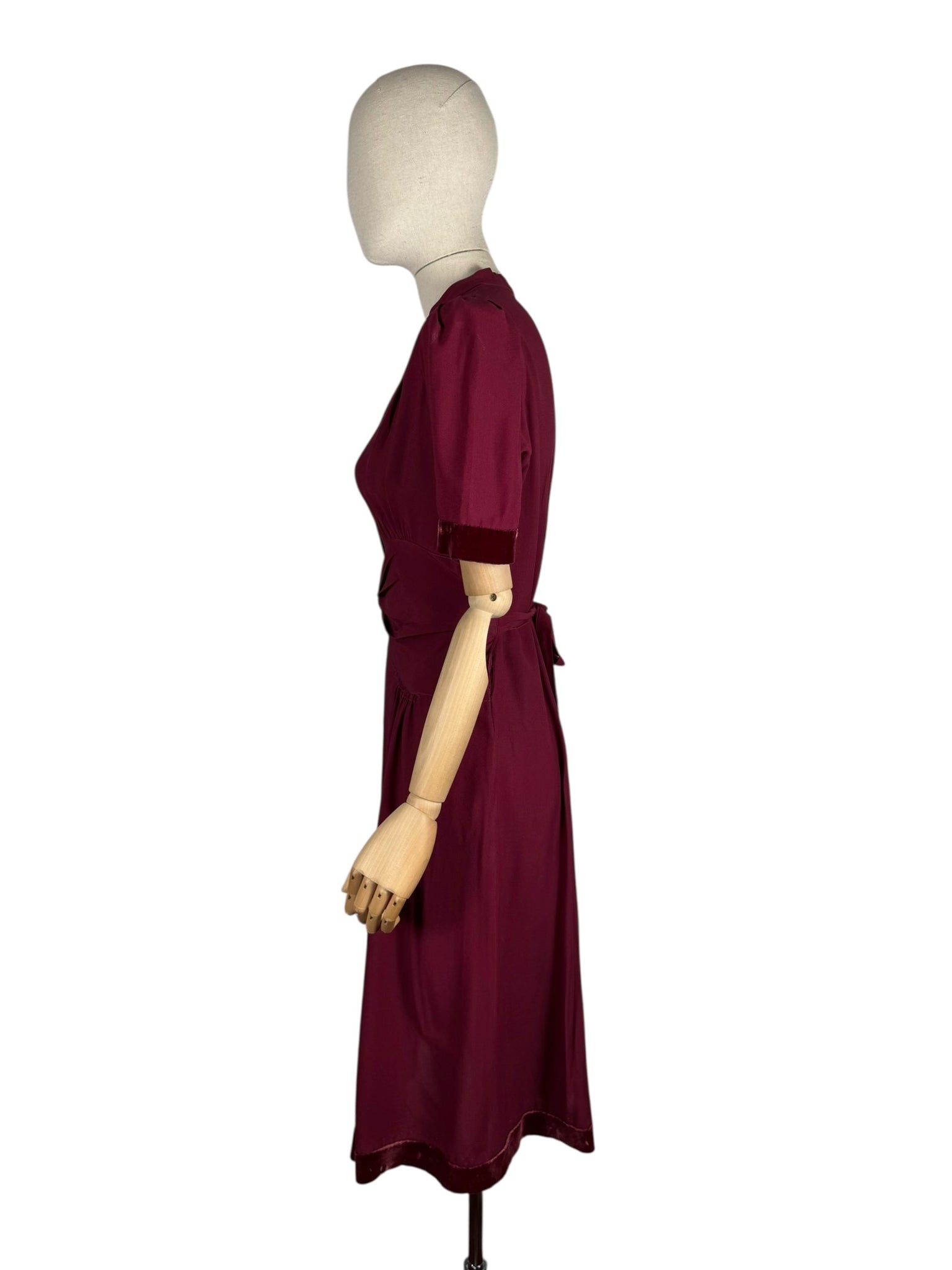 This classic belted day dress was made in the 1940's and is in a deep shade of burgundy crepe.