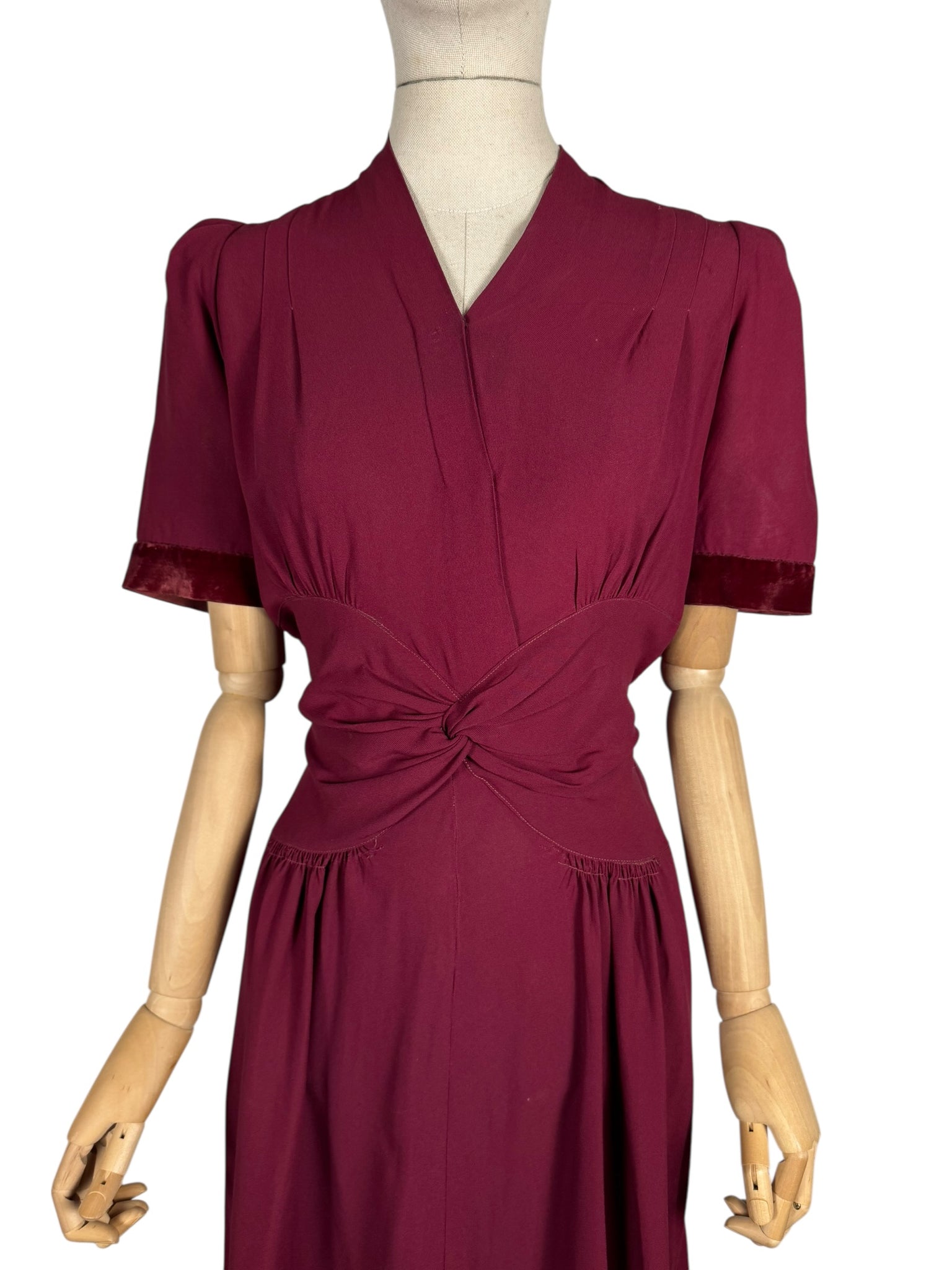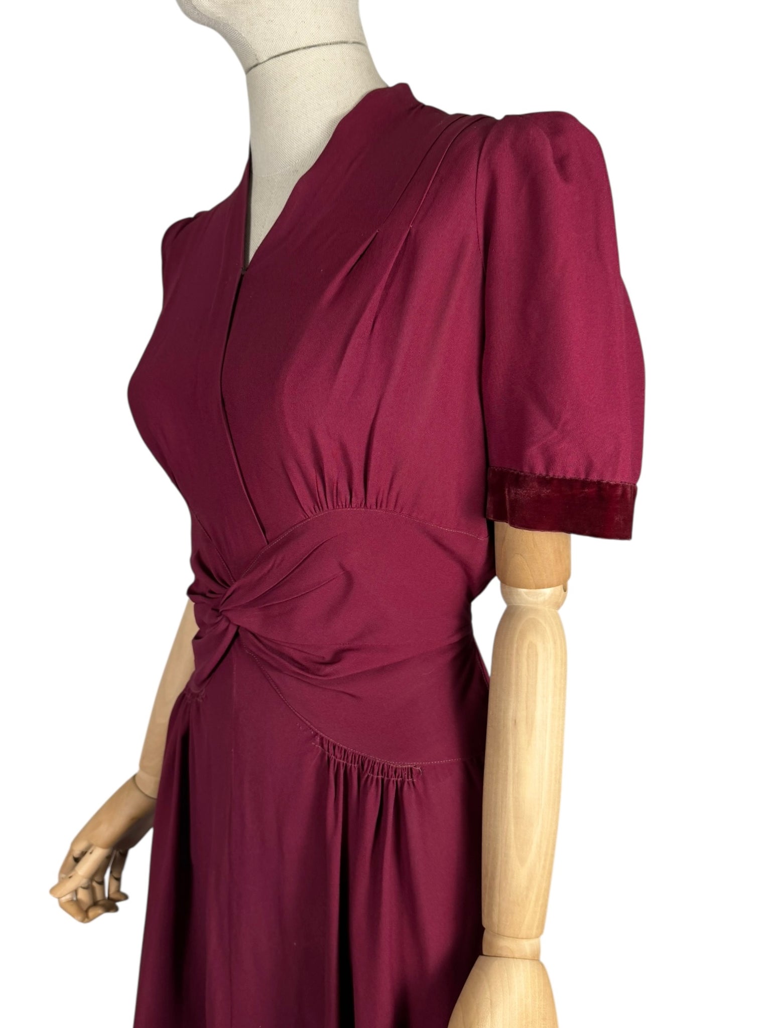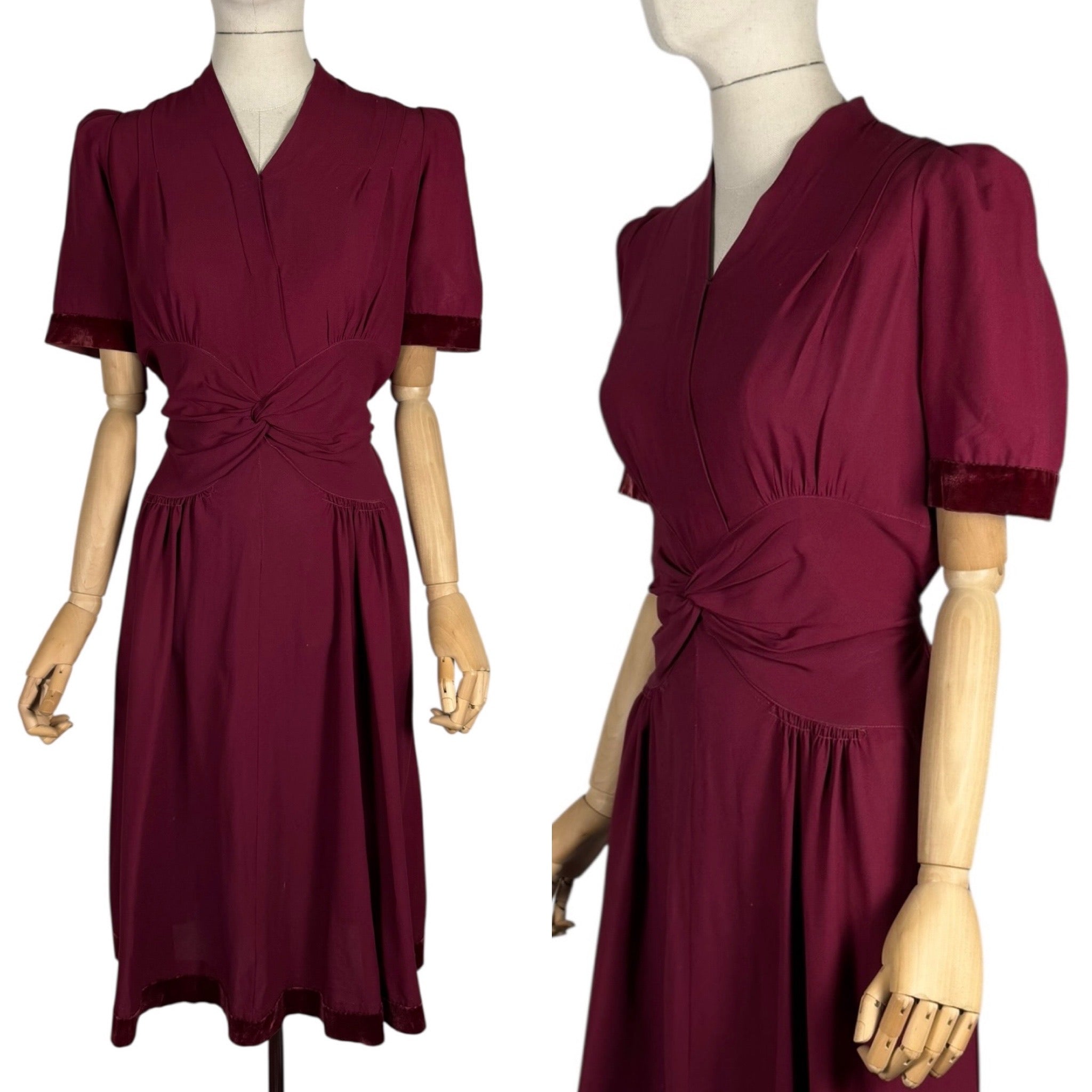 This classic belted day dress was made in the 1940's and is in a deep shade of burgundy crepe.