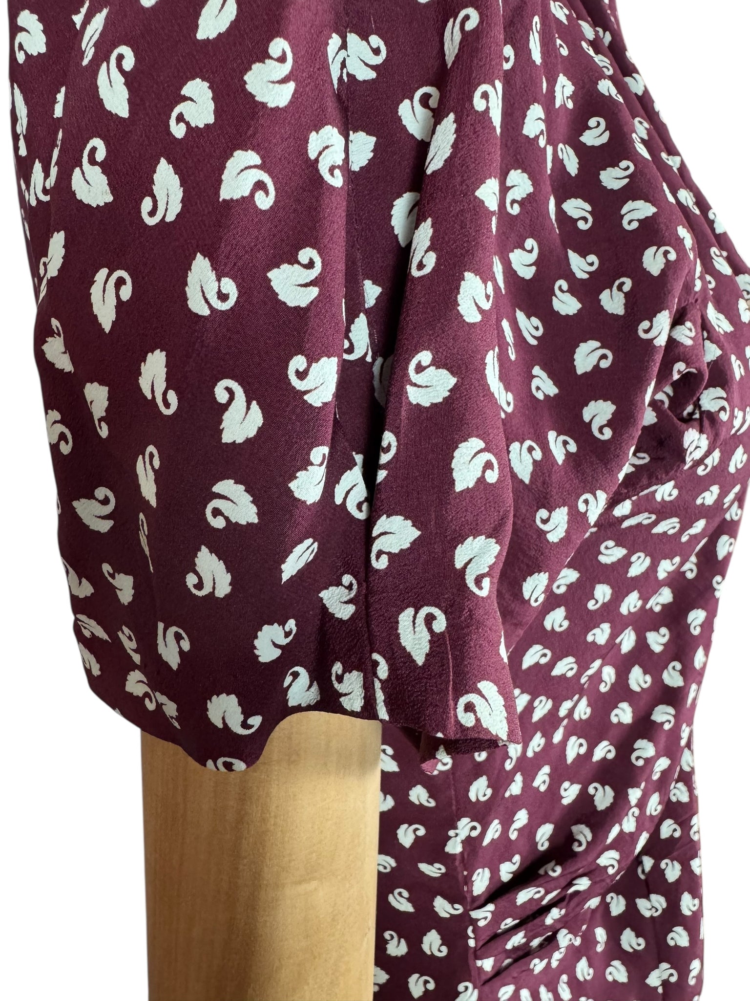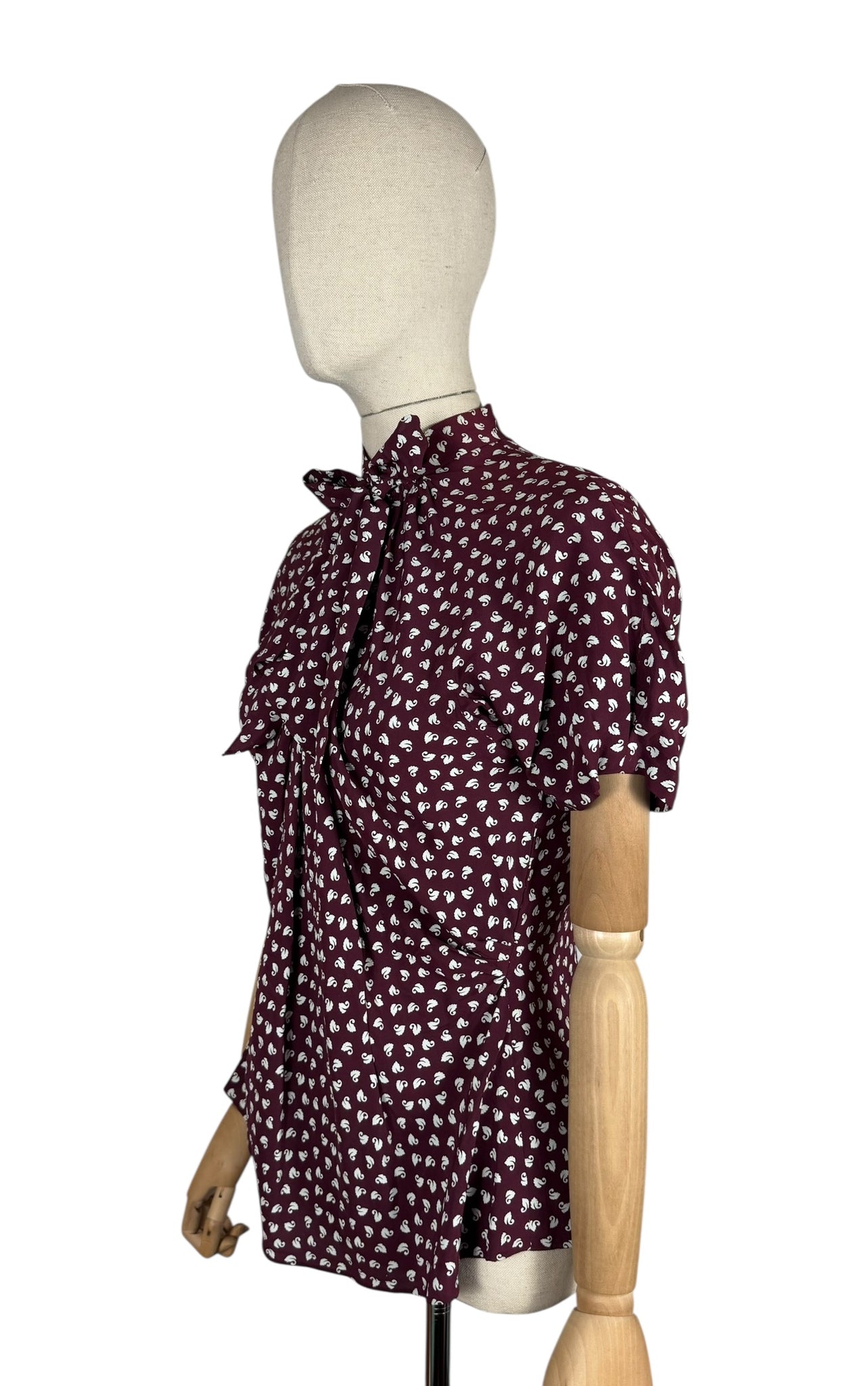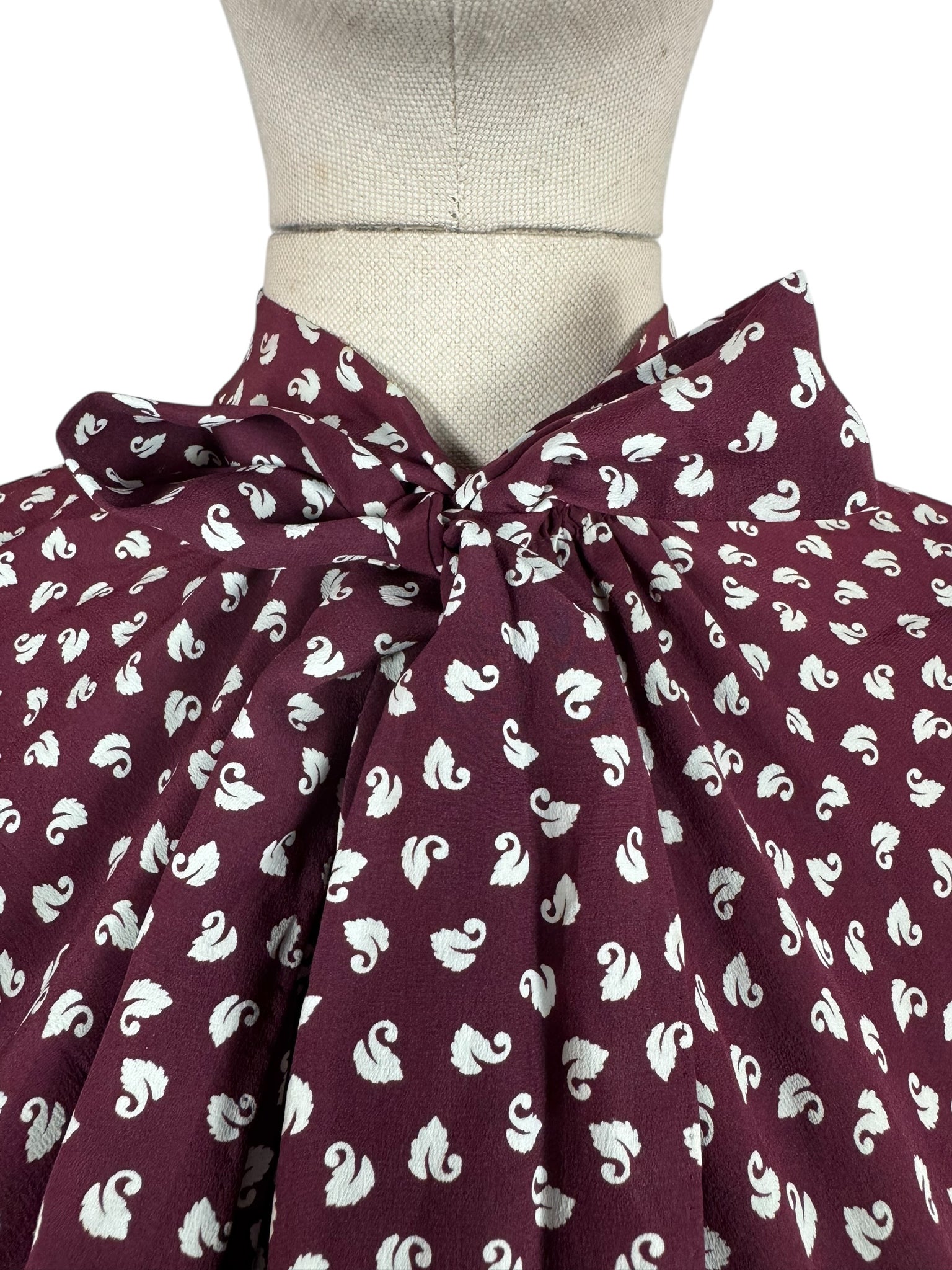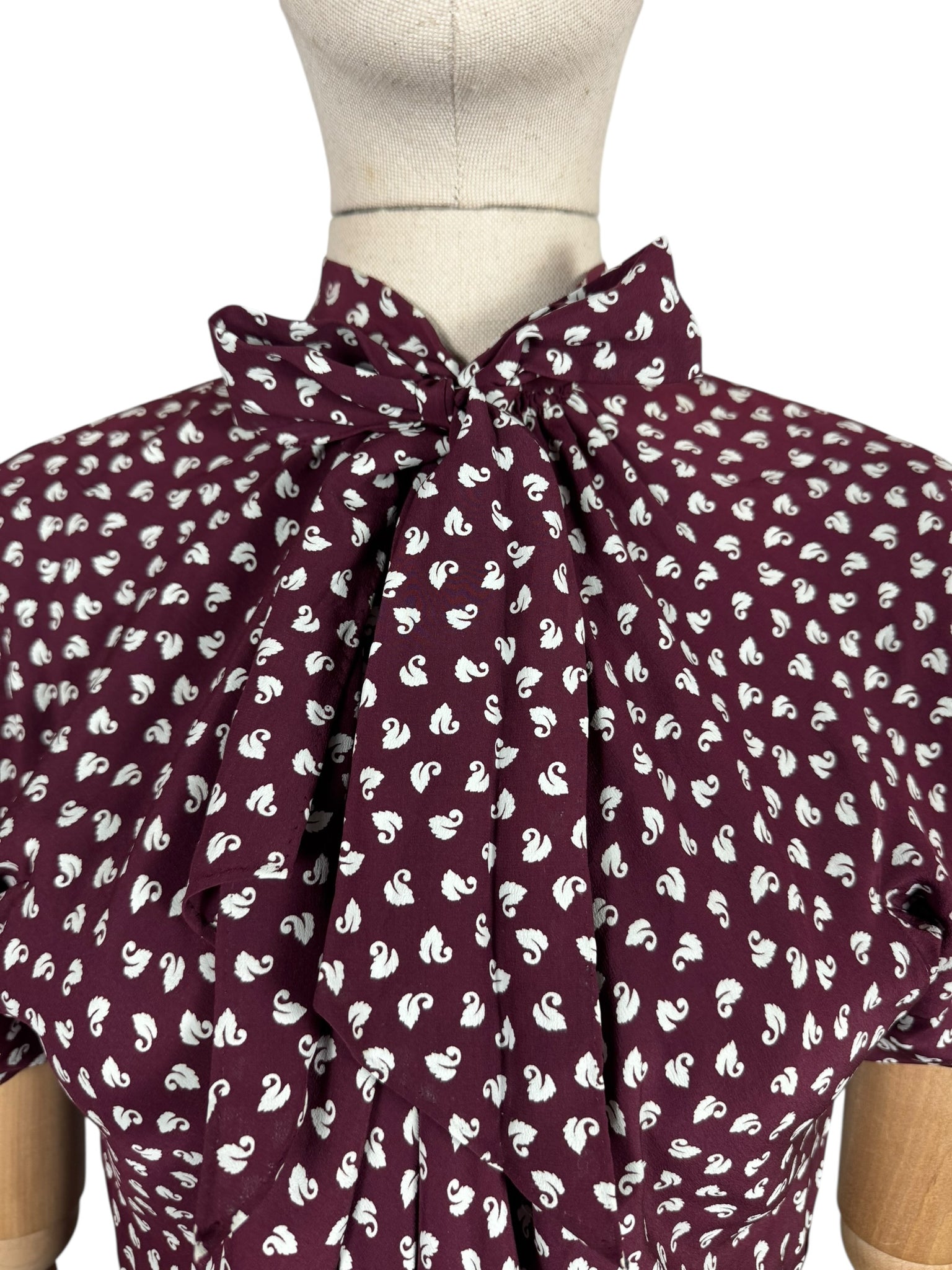 Made from wonderfully fine pure silk it has a dark burgundy base with a swan novelty print worked in white.