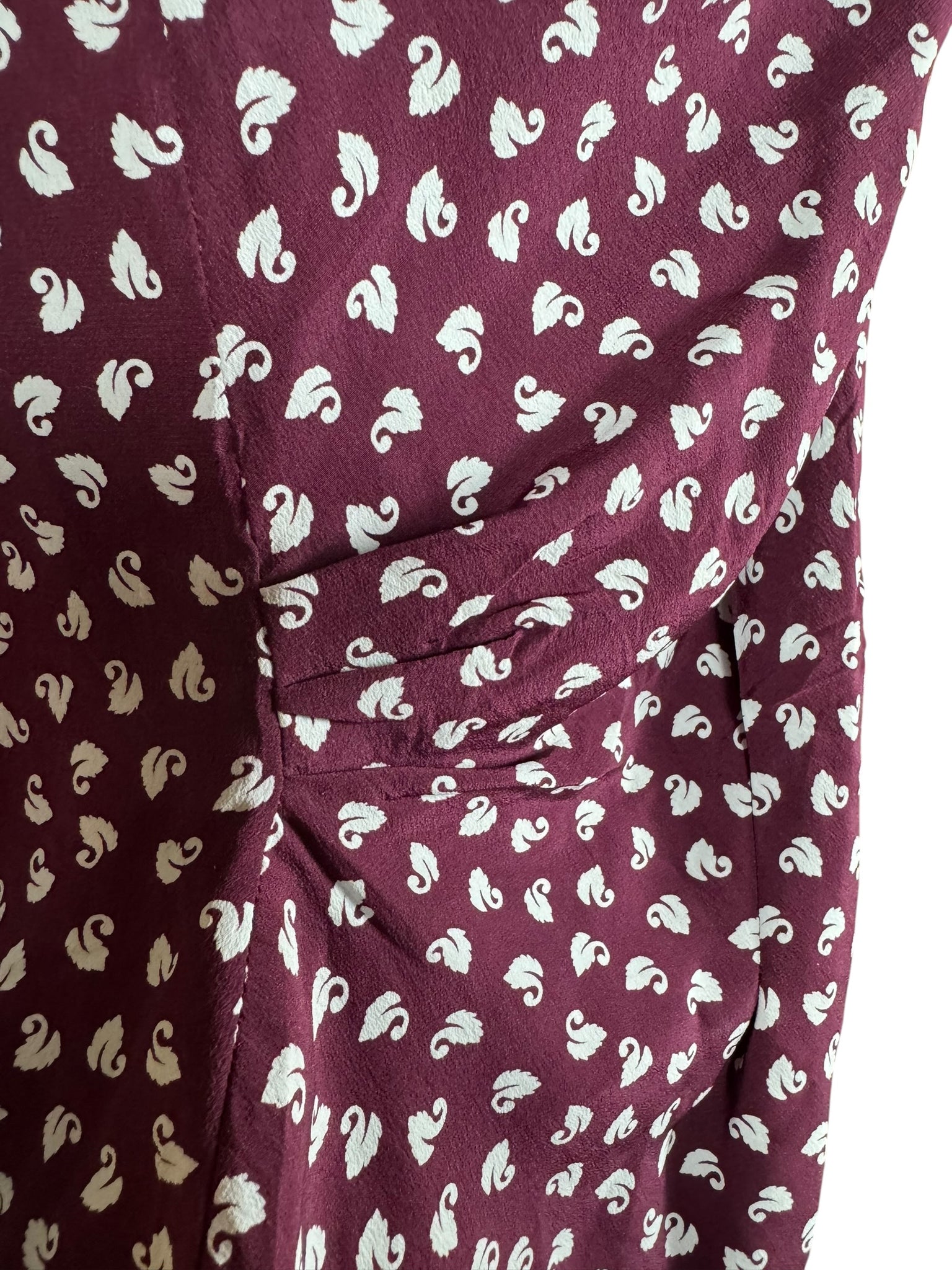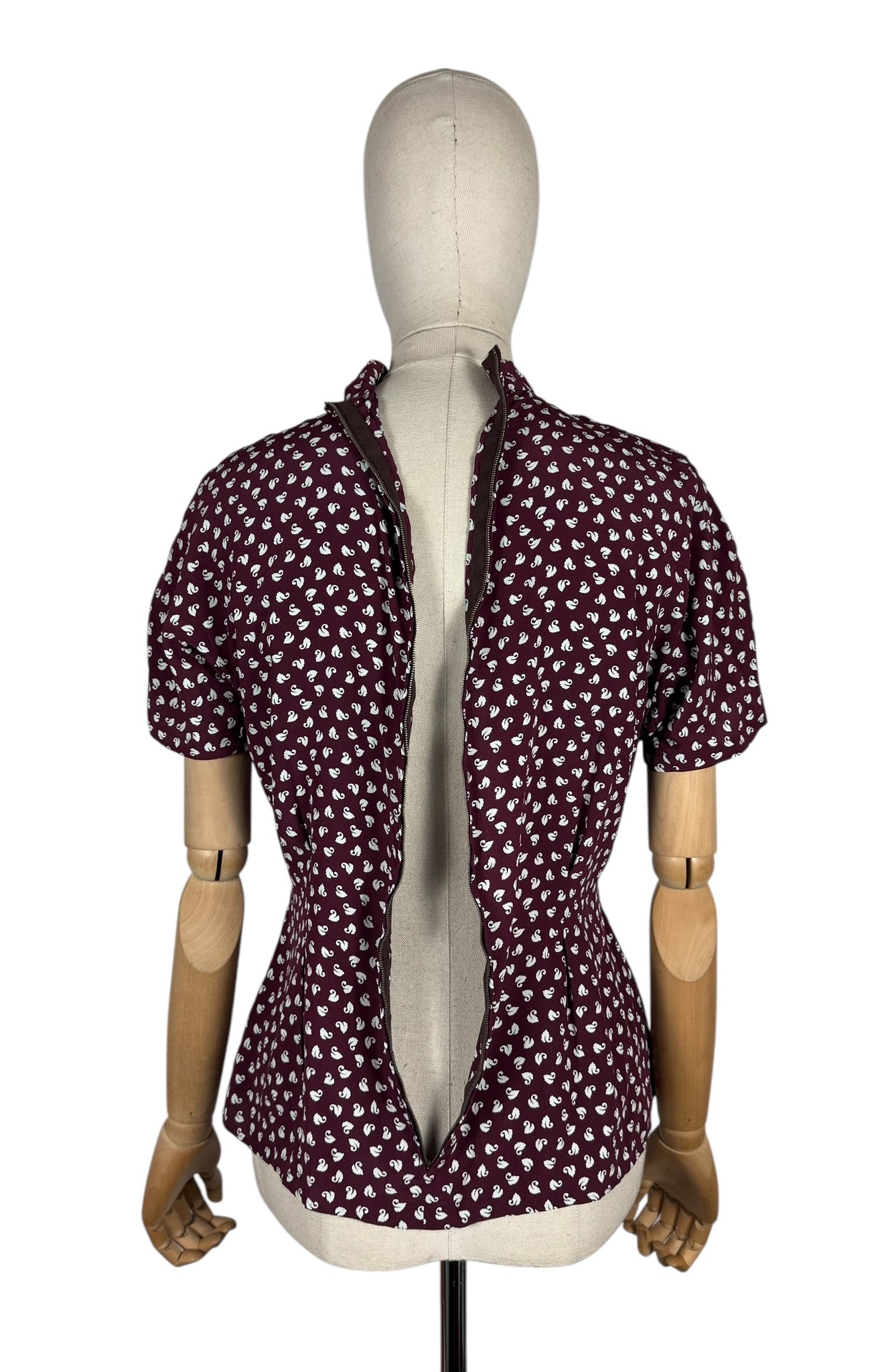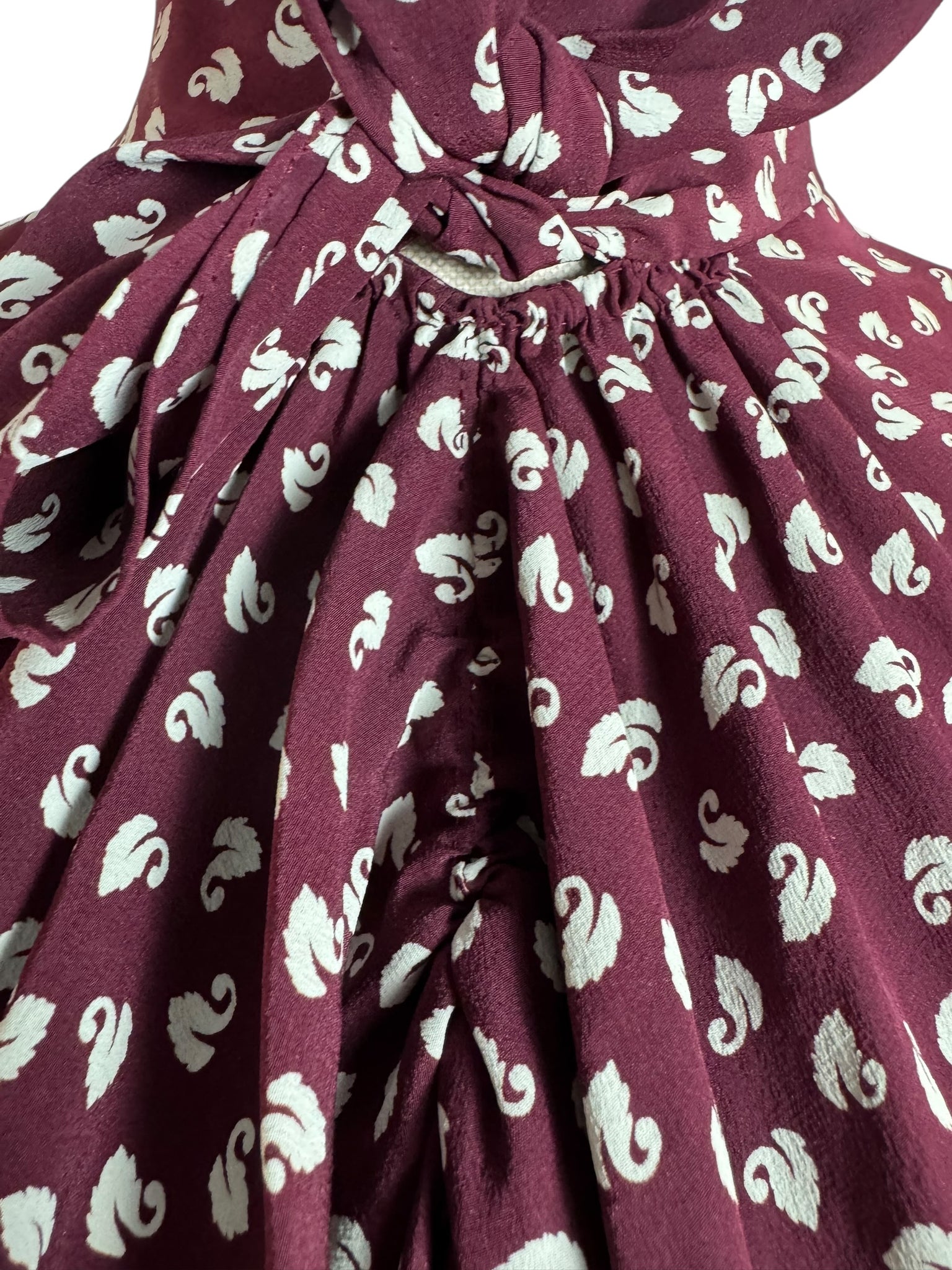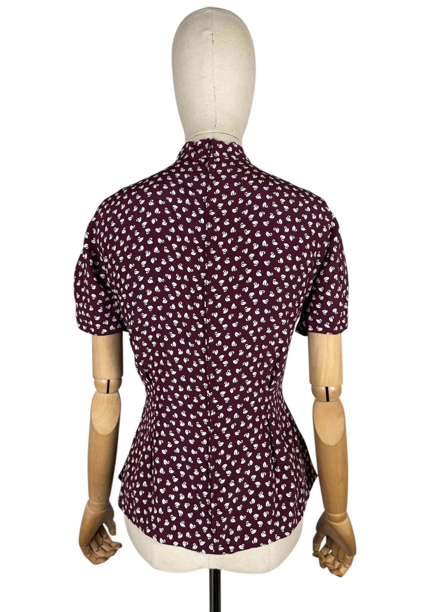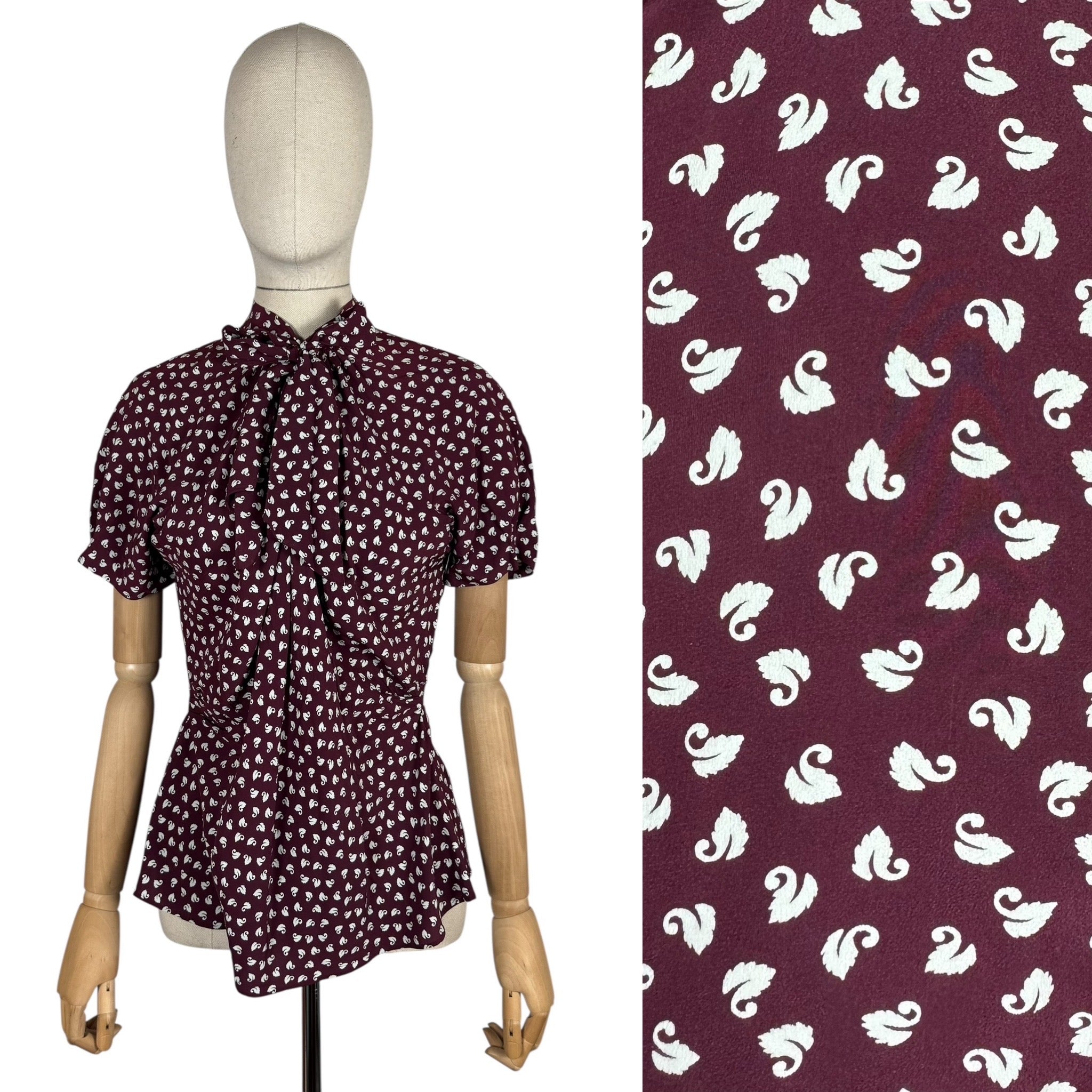Made from wonderfully fine pure silk it has a dark burgundy base with a swan novelty print worked in white.