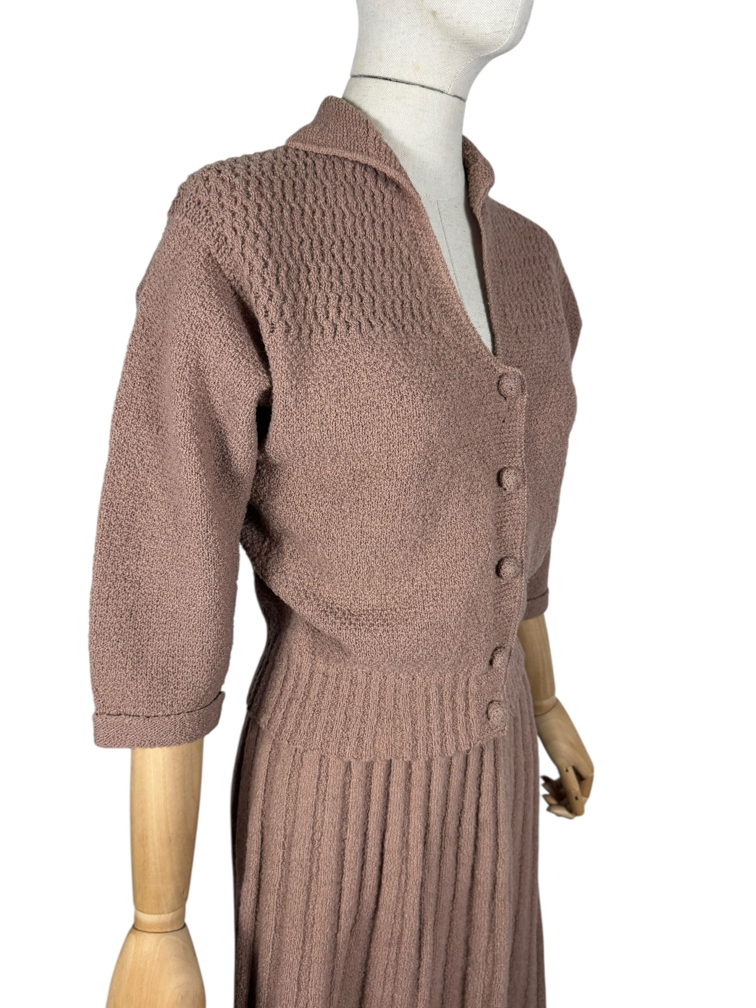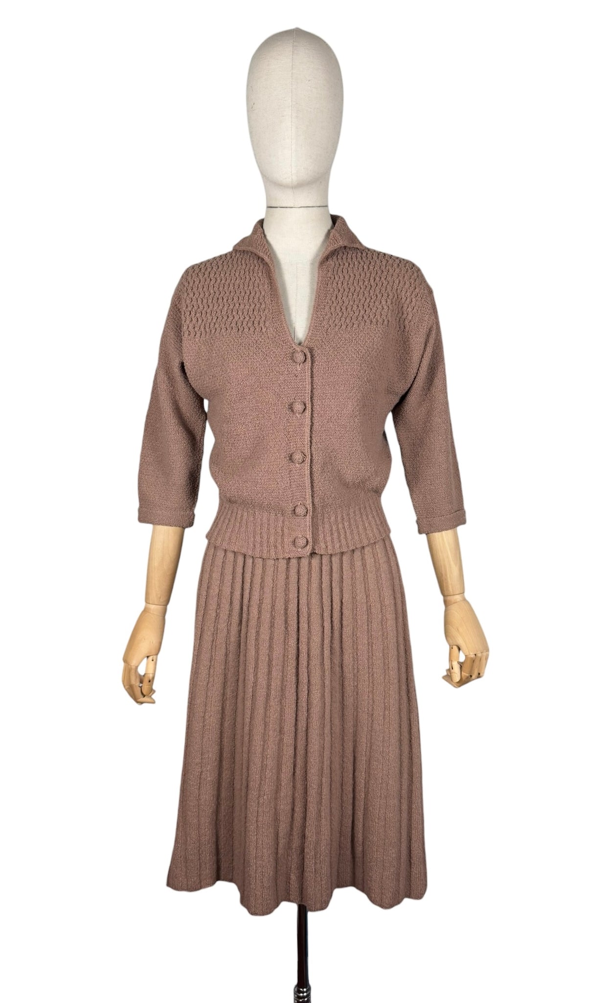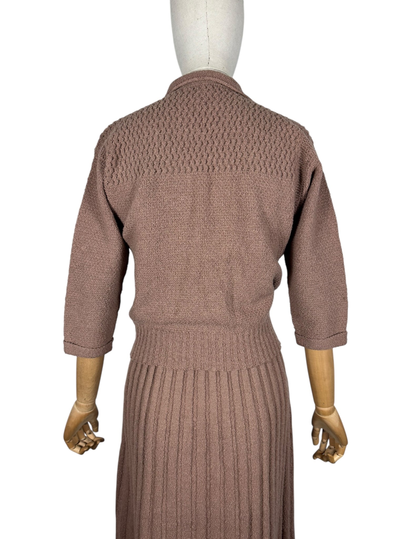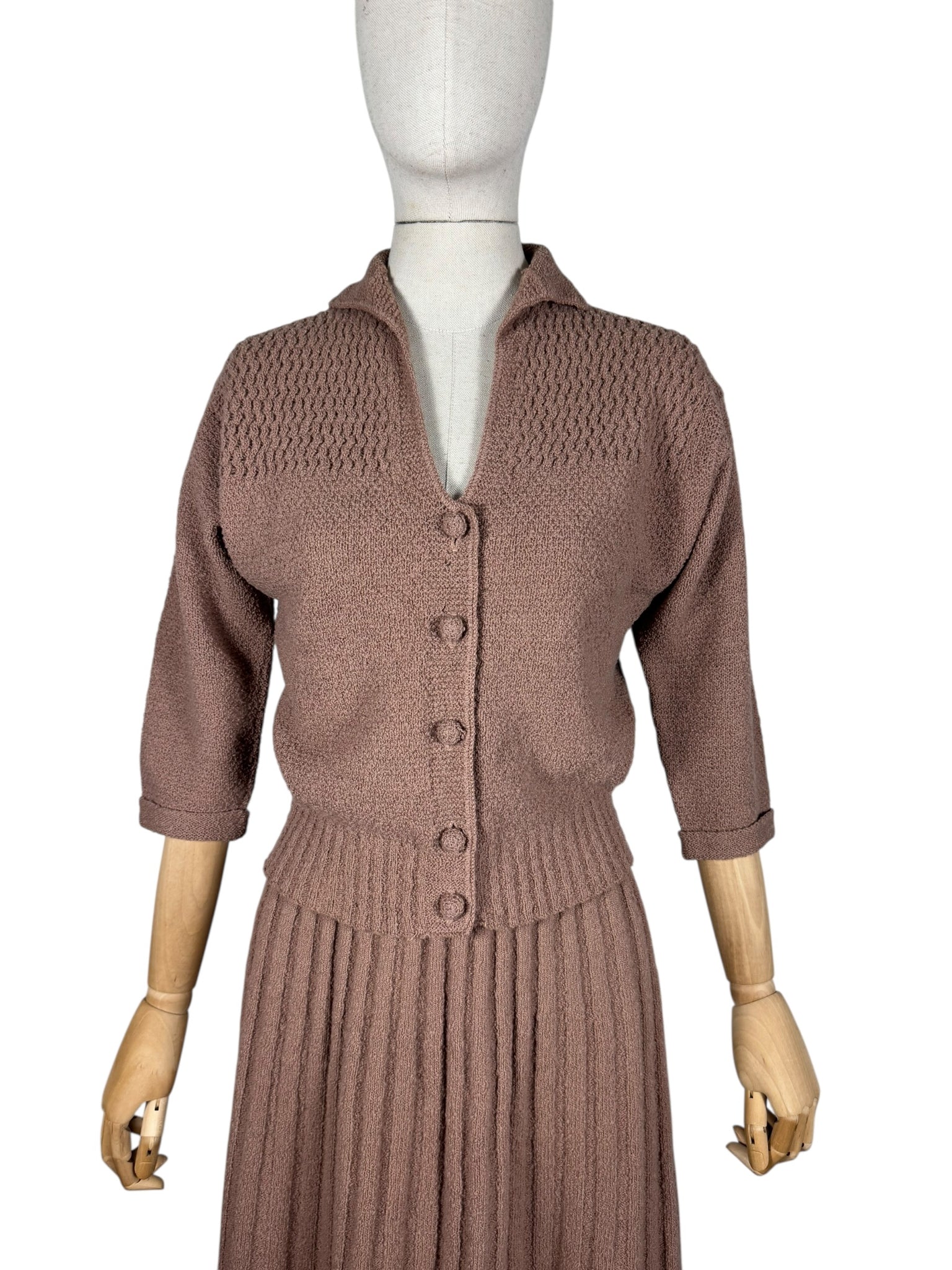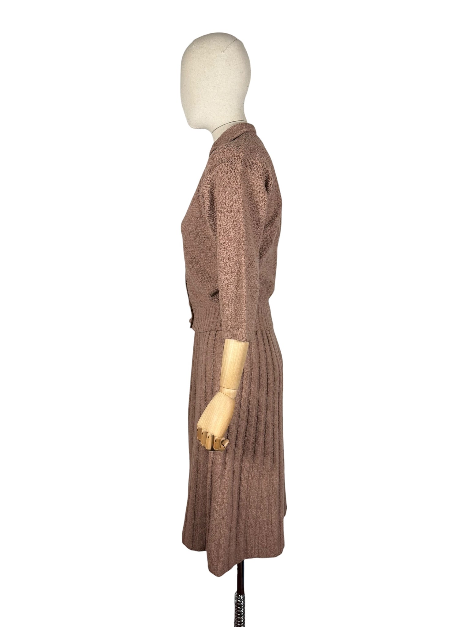 Made from pure wool in a warm brown, the set comprises of a ribbed skirt, which is a little flared at the hem. The cardigan has a deep v-neck, fastens with 5 covered buttons, has three-quarter length sleeves with neat turn back cuffs and has intricate openwork detail on the yoke.
