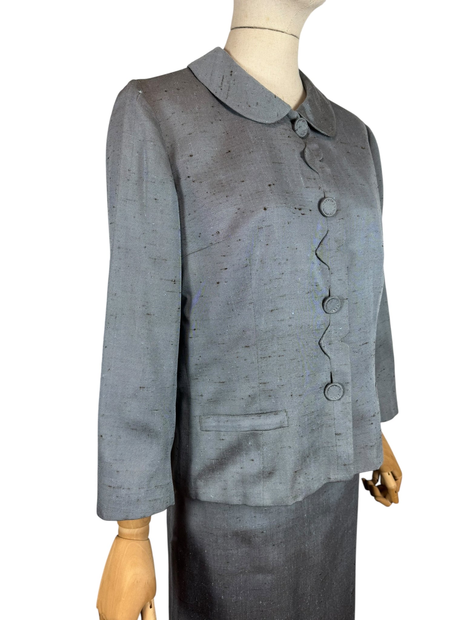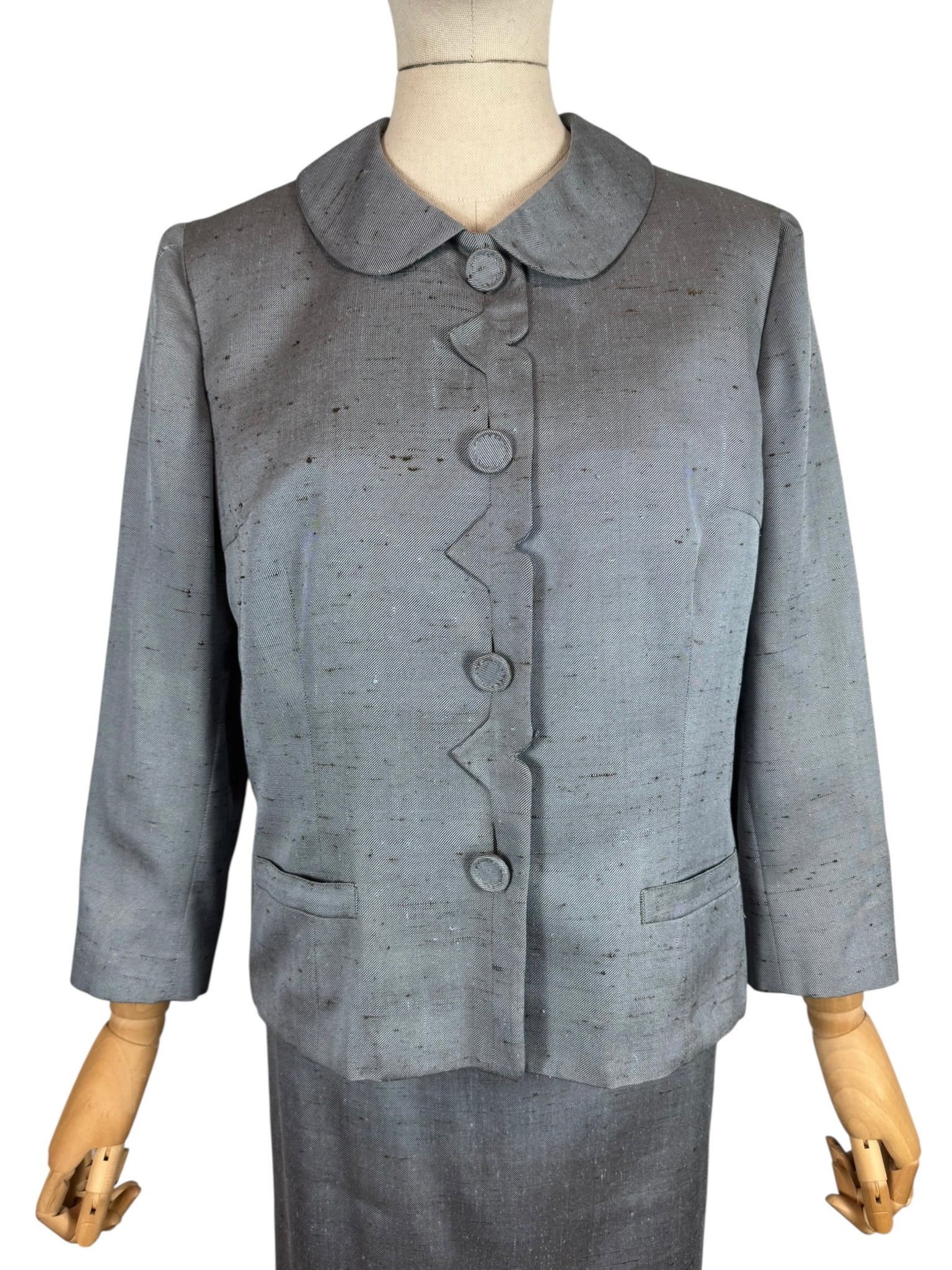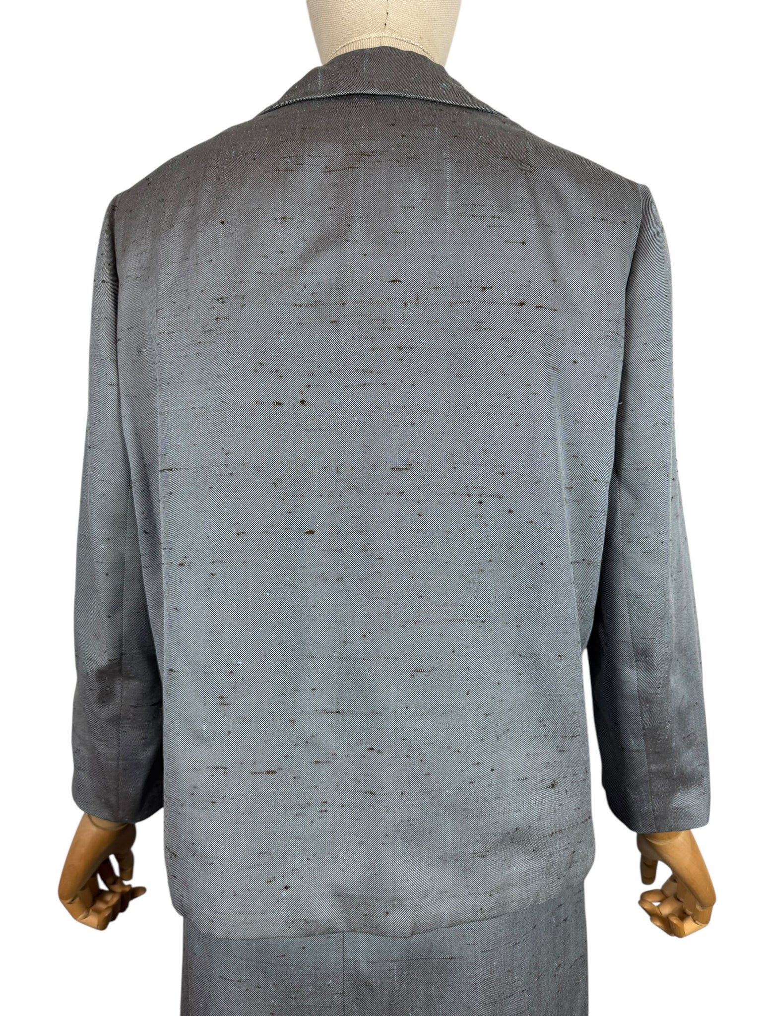 Made from medium weight wool in light grey with a darker grey stripe, it features an oversized jacket which fastens with covered buttons and has tab detail down the front placket. The skirt is smooth fitting, fastens with hooks and a nylon zipper and has a single back pleat. Both skirt and jacket are lined.