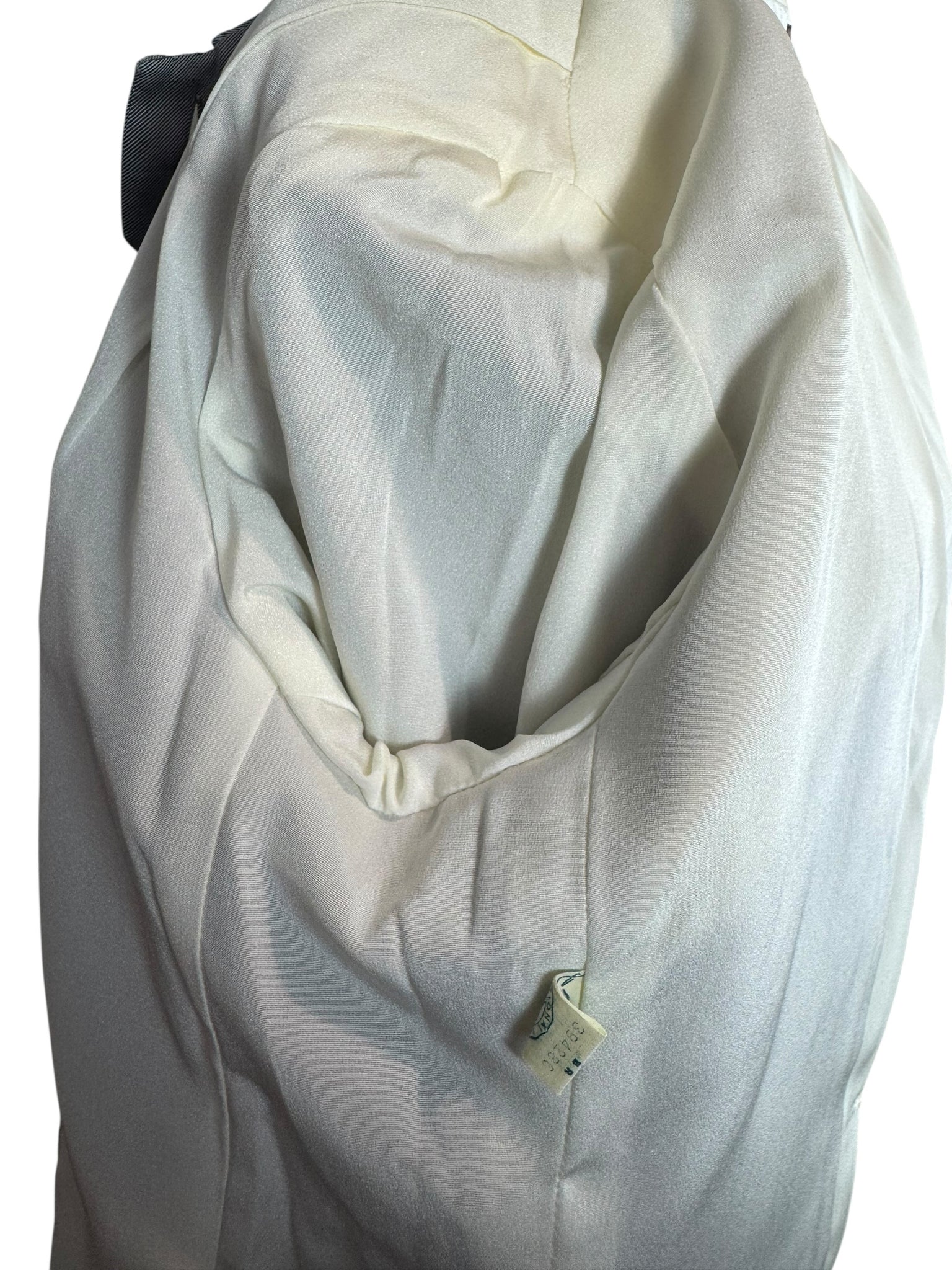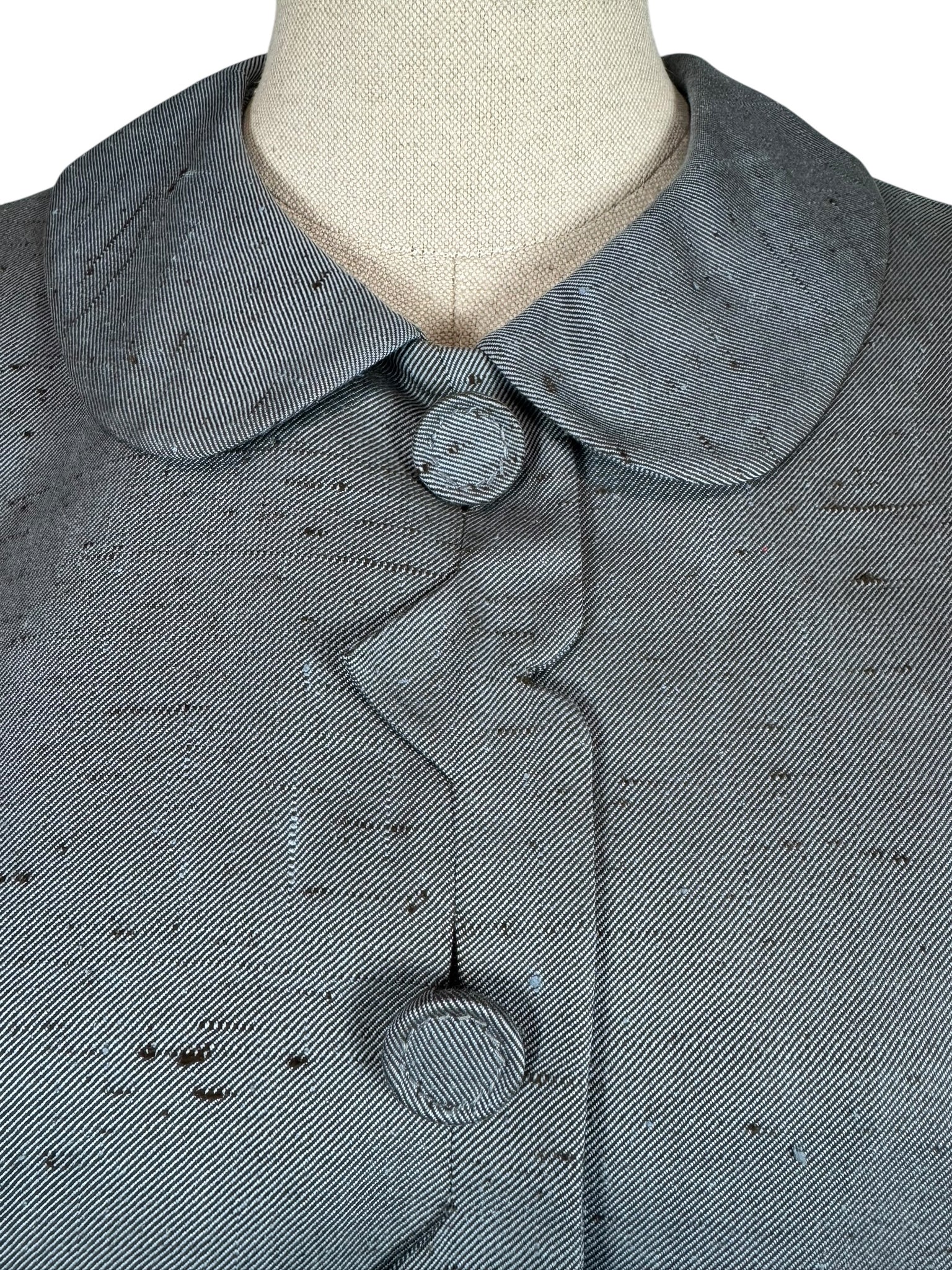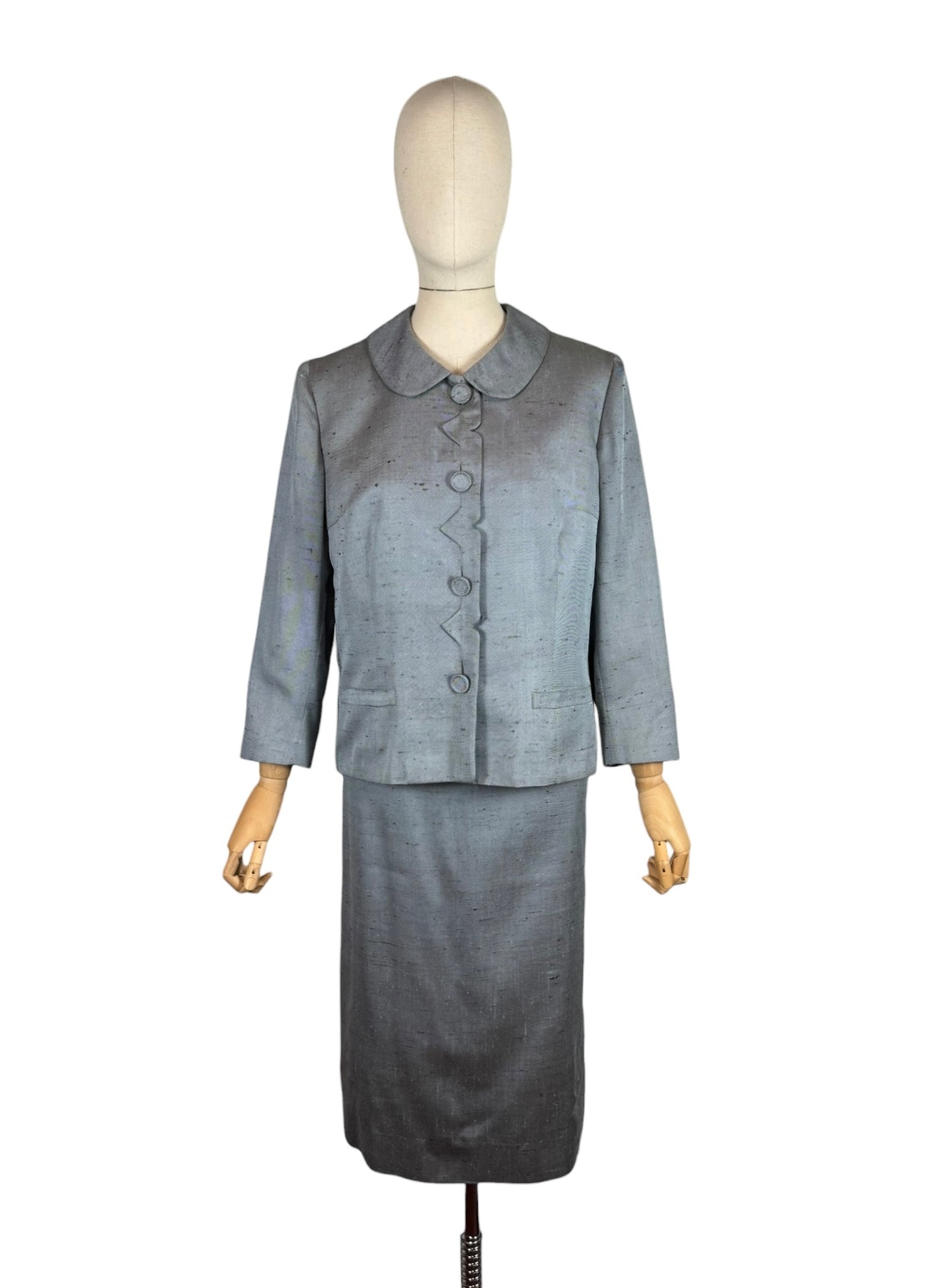 Made from medium weight wool in light grey with a darker grey stripe, it features an oversized jacket which fastens with covered buttons and has tab detail down the front placket. The skirt is smooth fitting, fastens with hooks and a nylon zipper and has a single back pleat. Both skirt and jacket are lined.