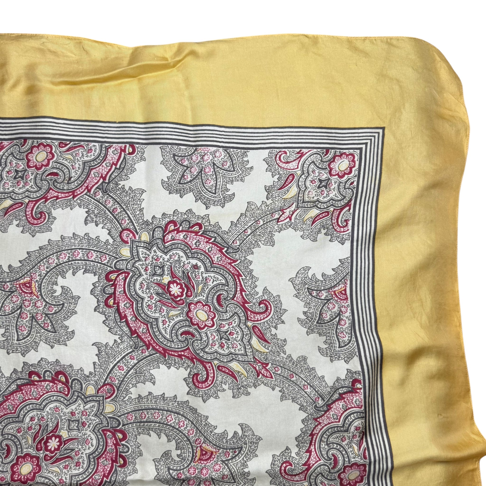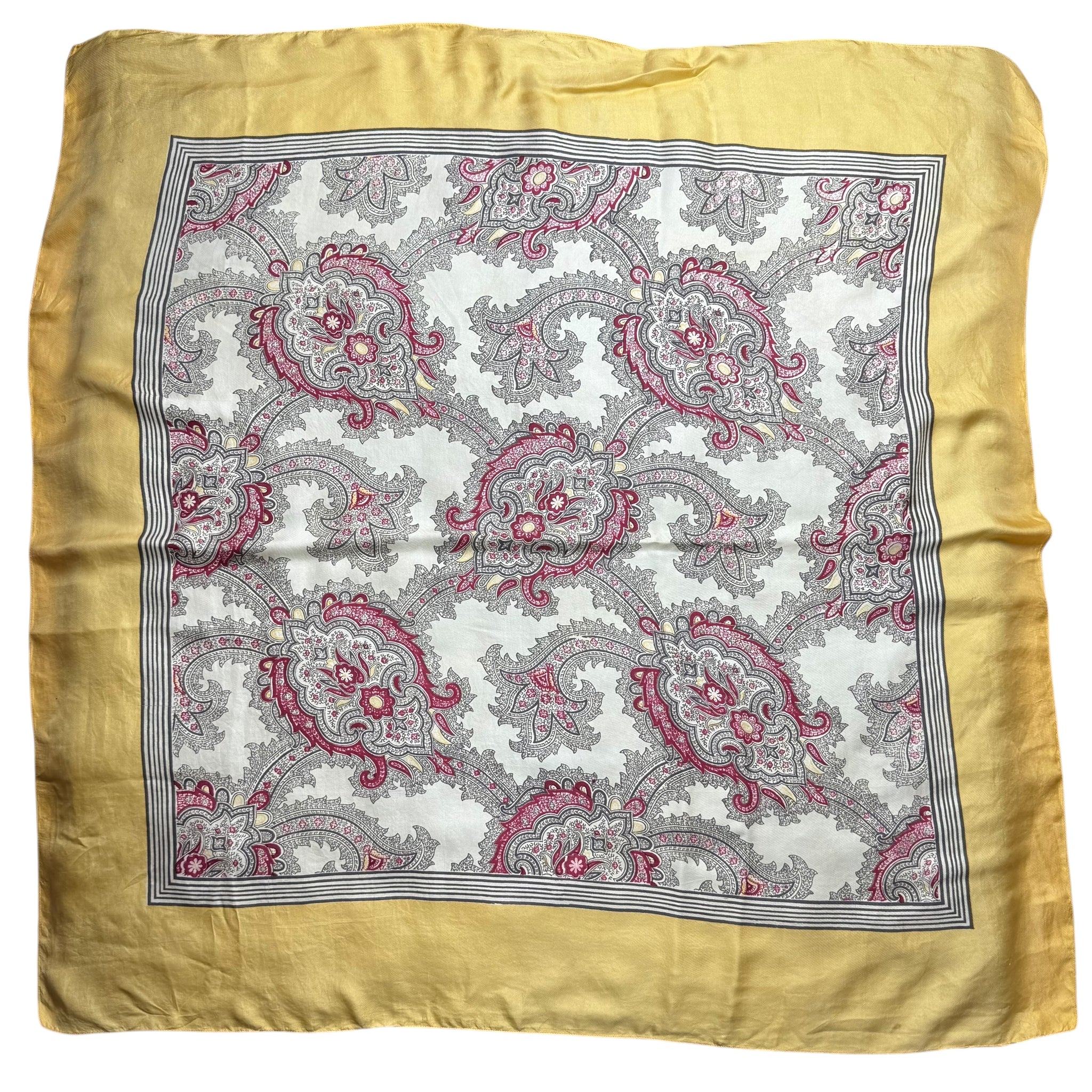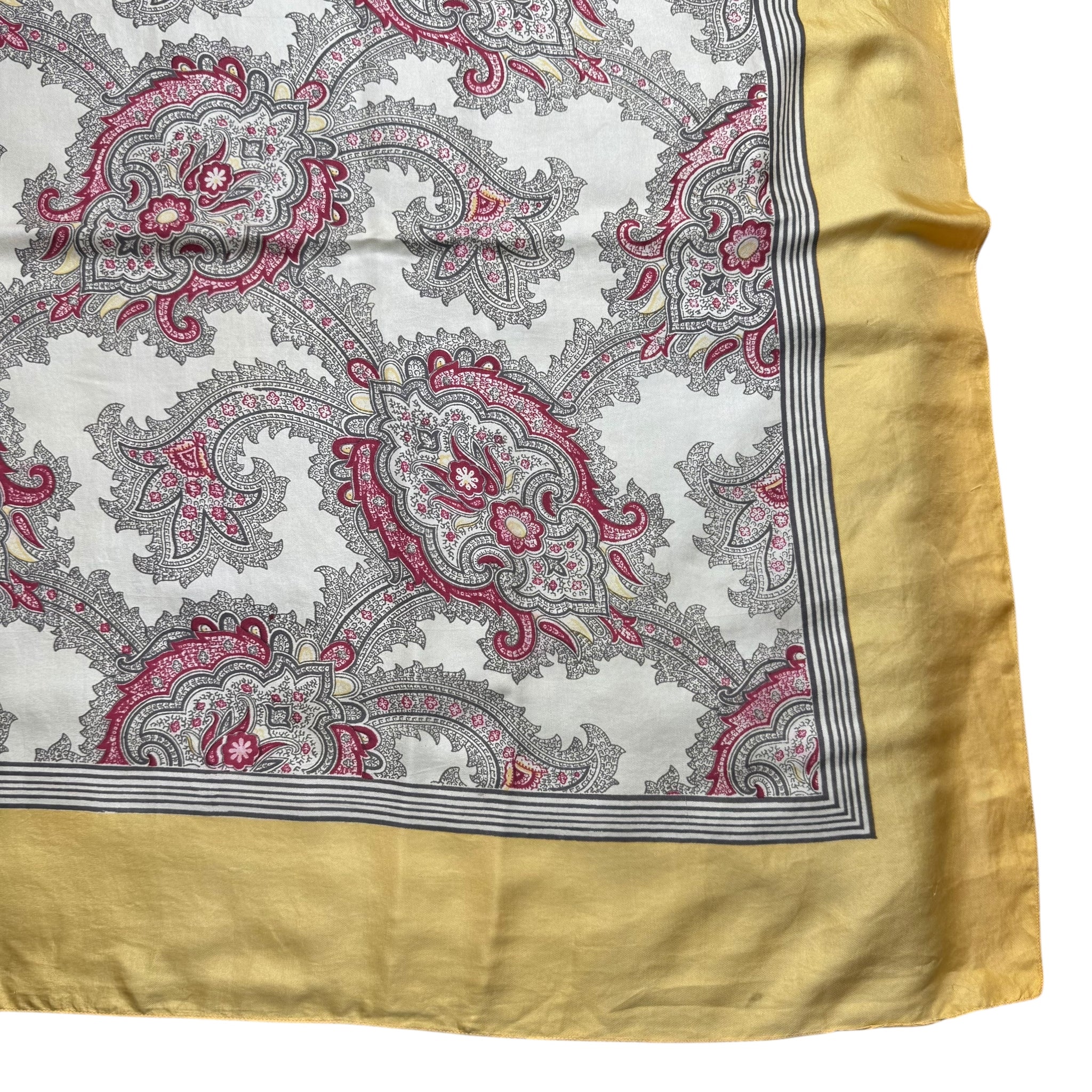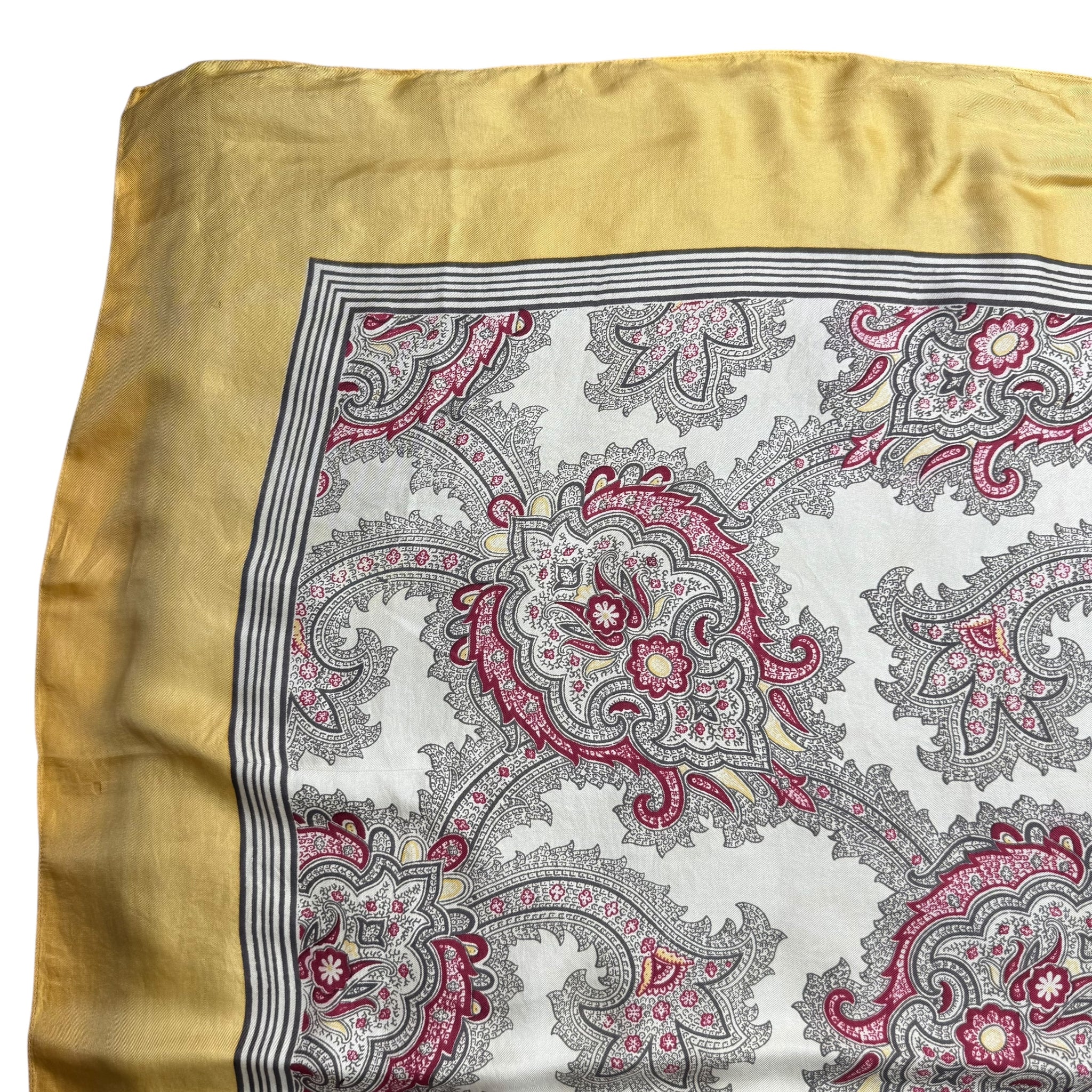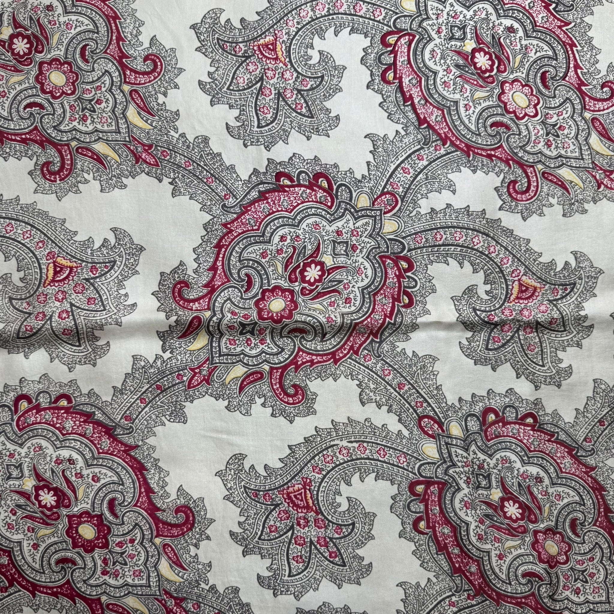 Made from fabulously fine pure silk it has a beige ground, with an intricate grey and red paisley print surrounded by a dull mustard border.