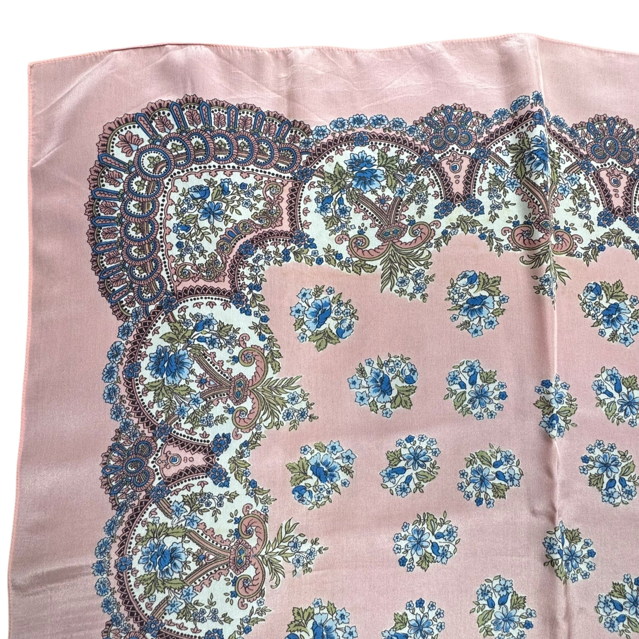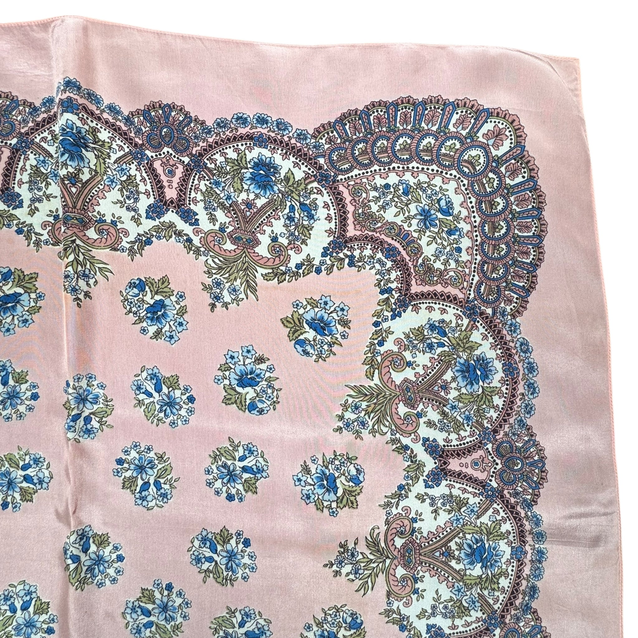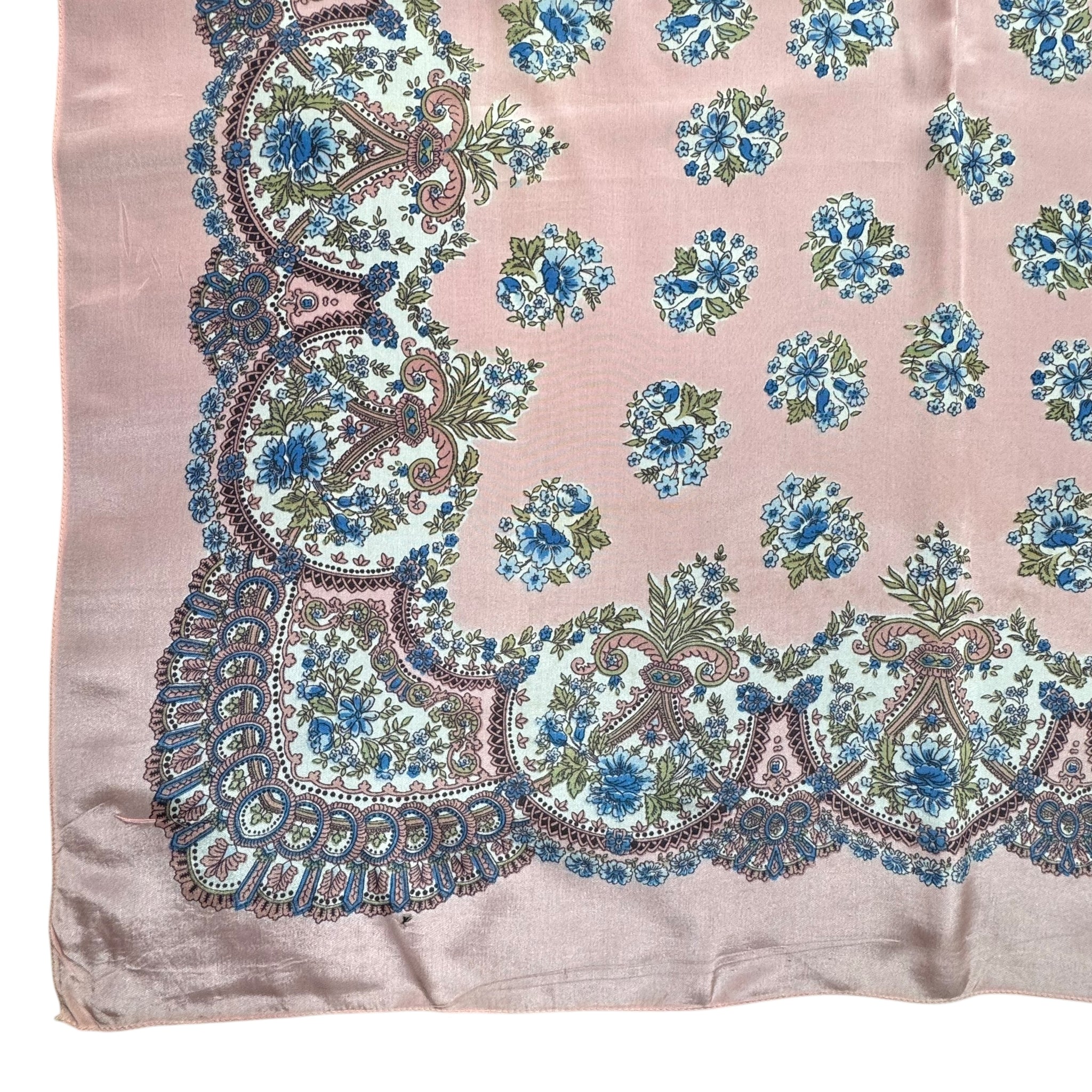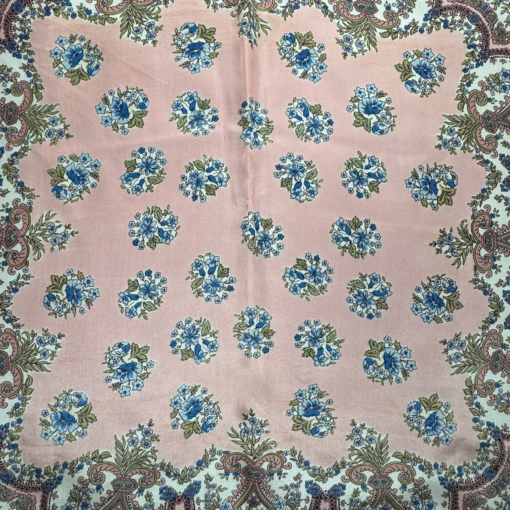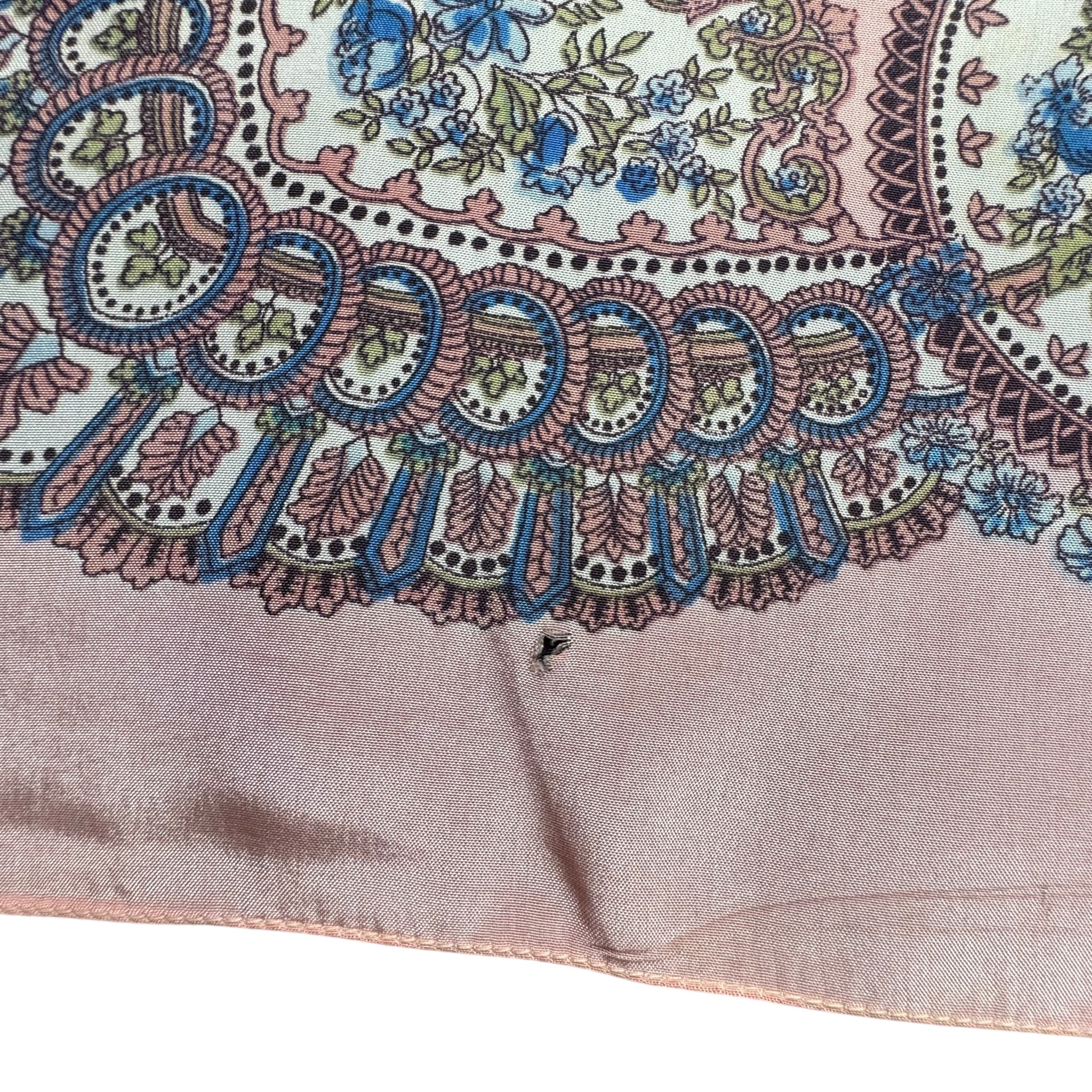 Made from silk crepe it has a pale salmon pink base with an intricate floral design in blue, green, white and black.