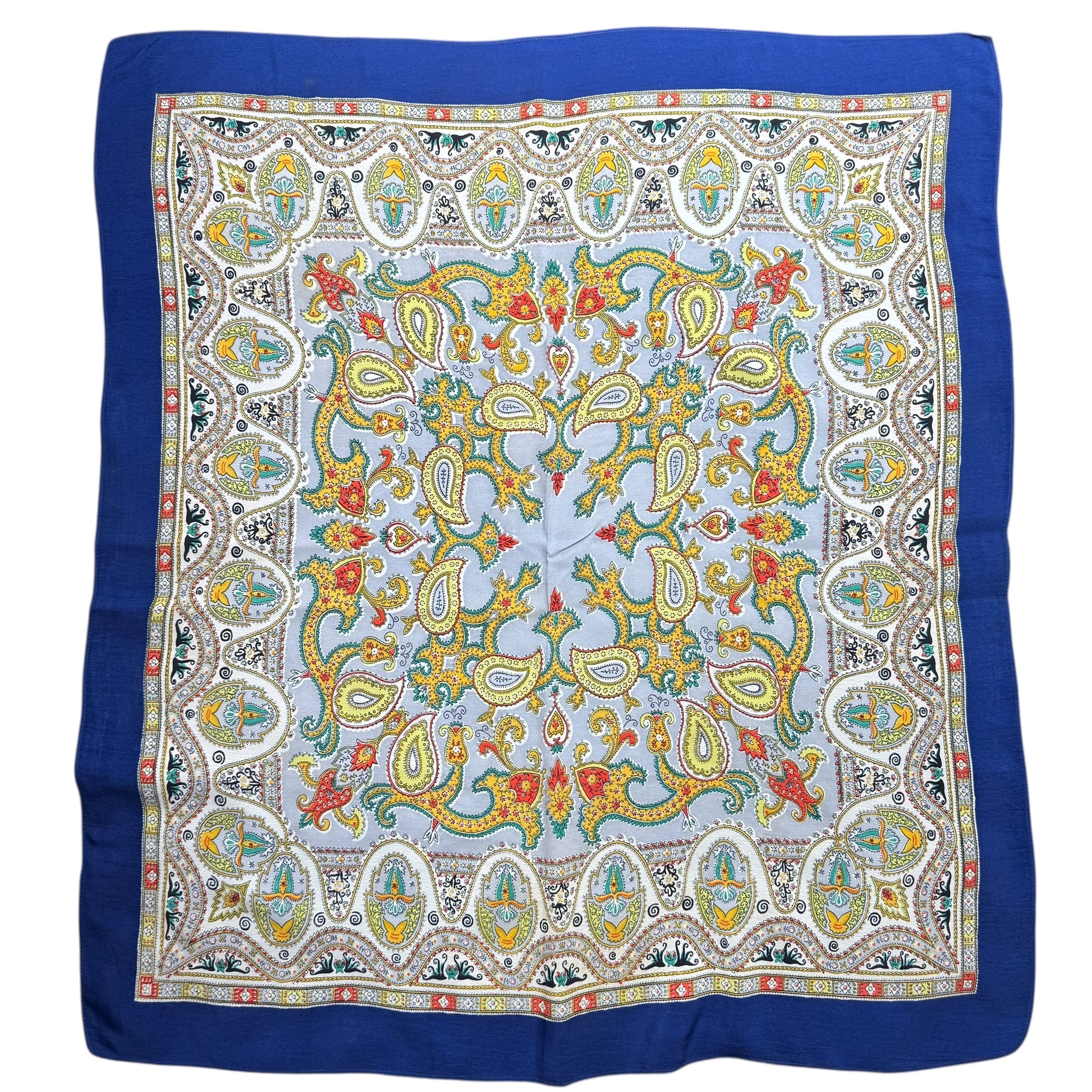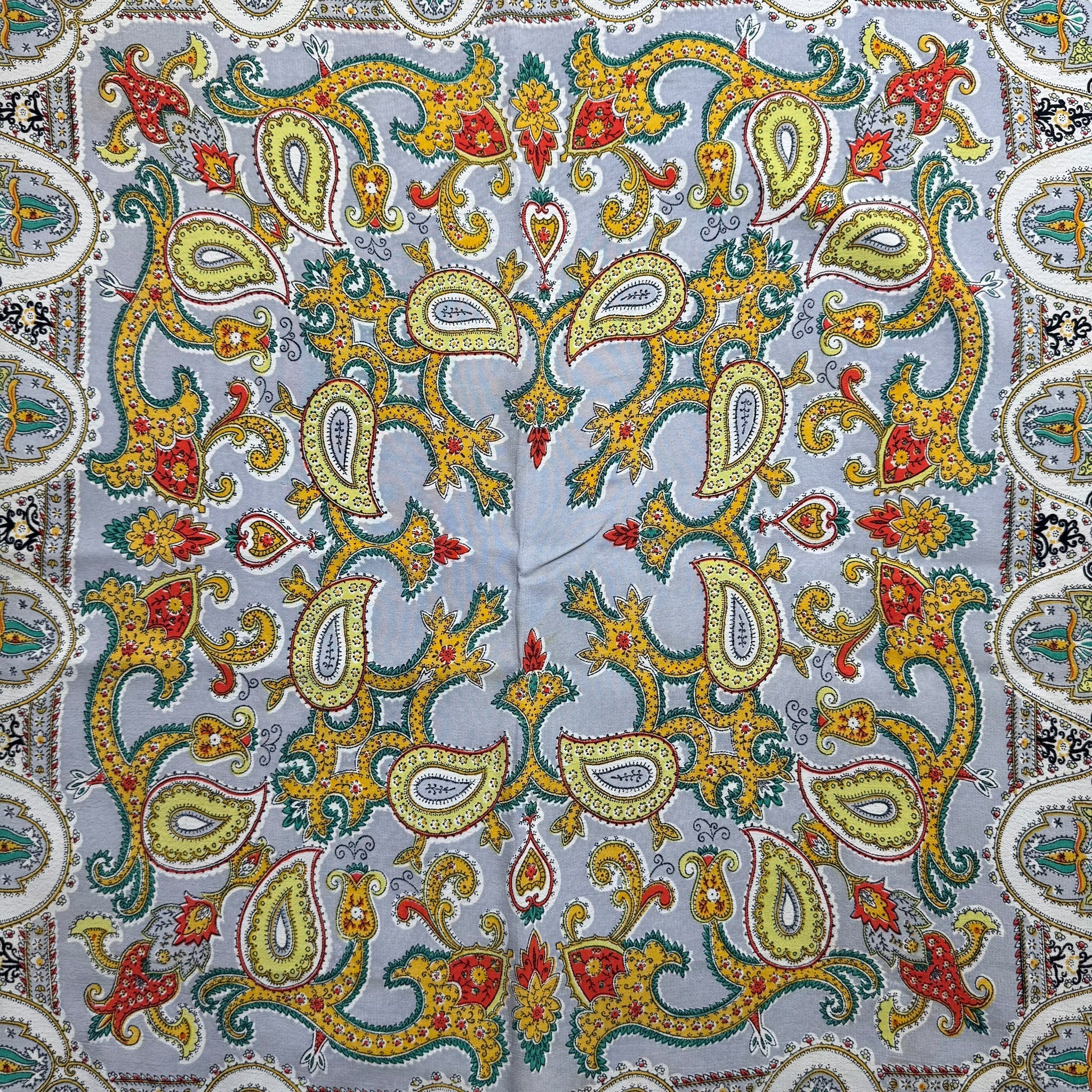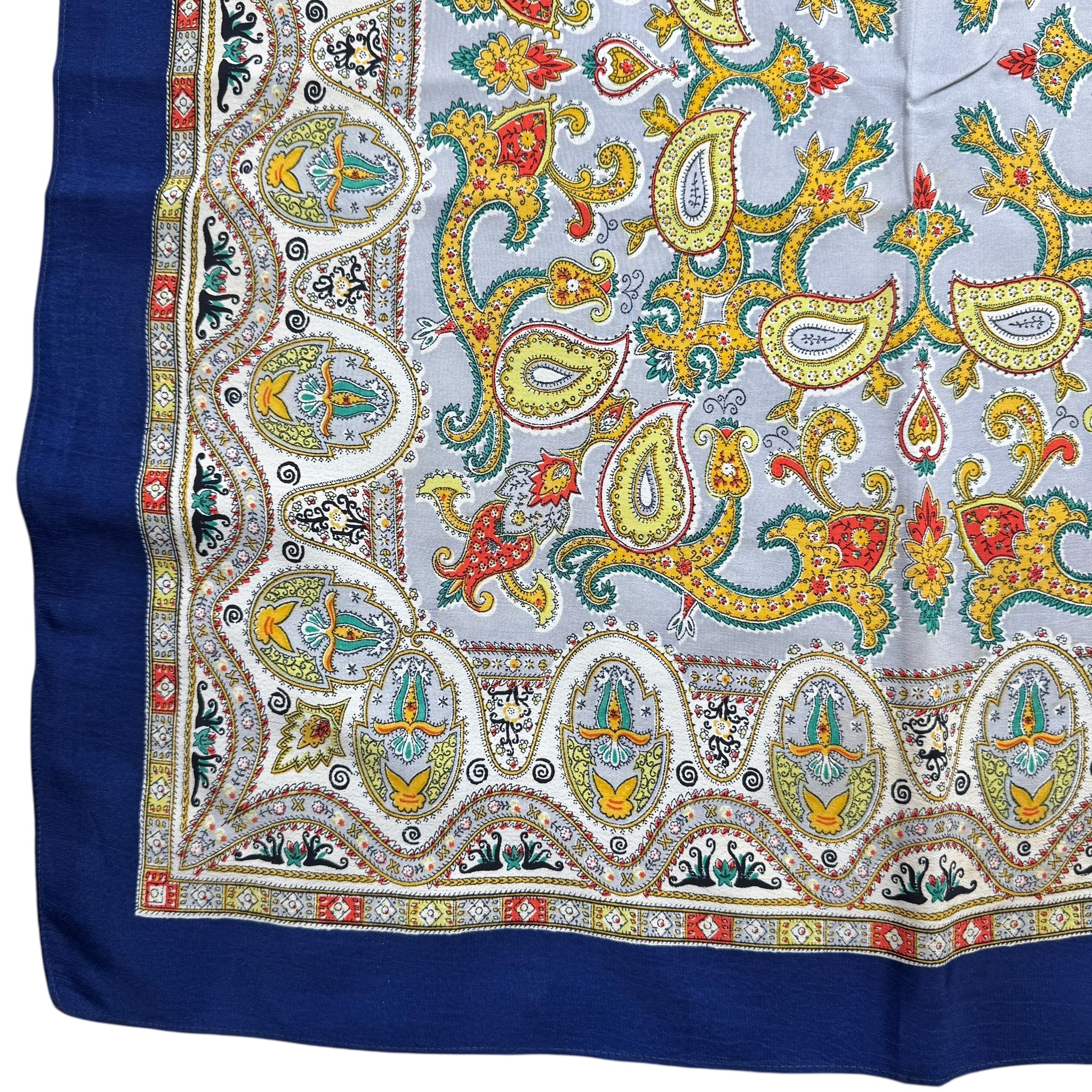 Made from soft crepe it has a pale grey base with a wide navy border. The print is an intricate paisley in vibrant shades of orange, yellow, teal and black.