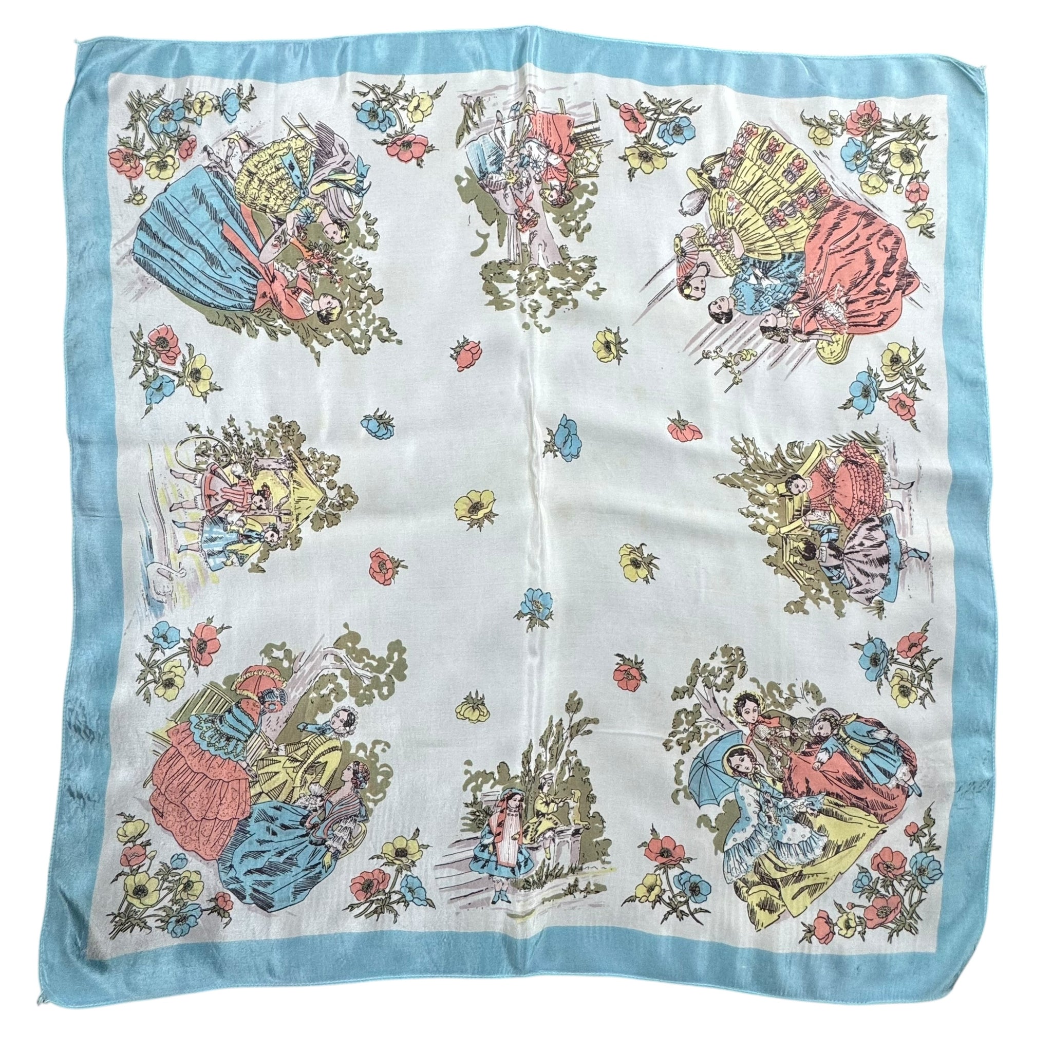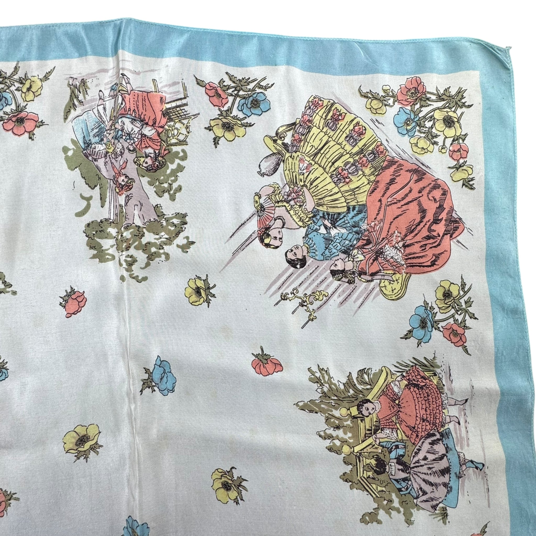 Made from silk crepe, it has an off-white middle with a narrow pale blue border. A stunningly intricate design featuring Victorian scenes and vibrant anemones it is a gorgeous piece.