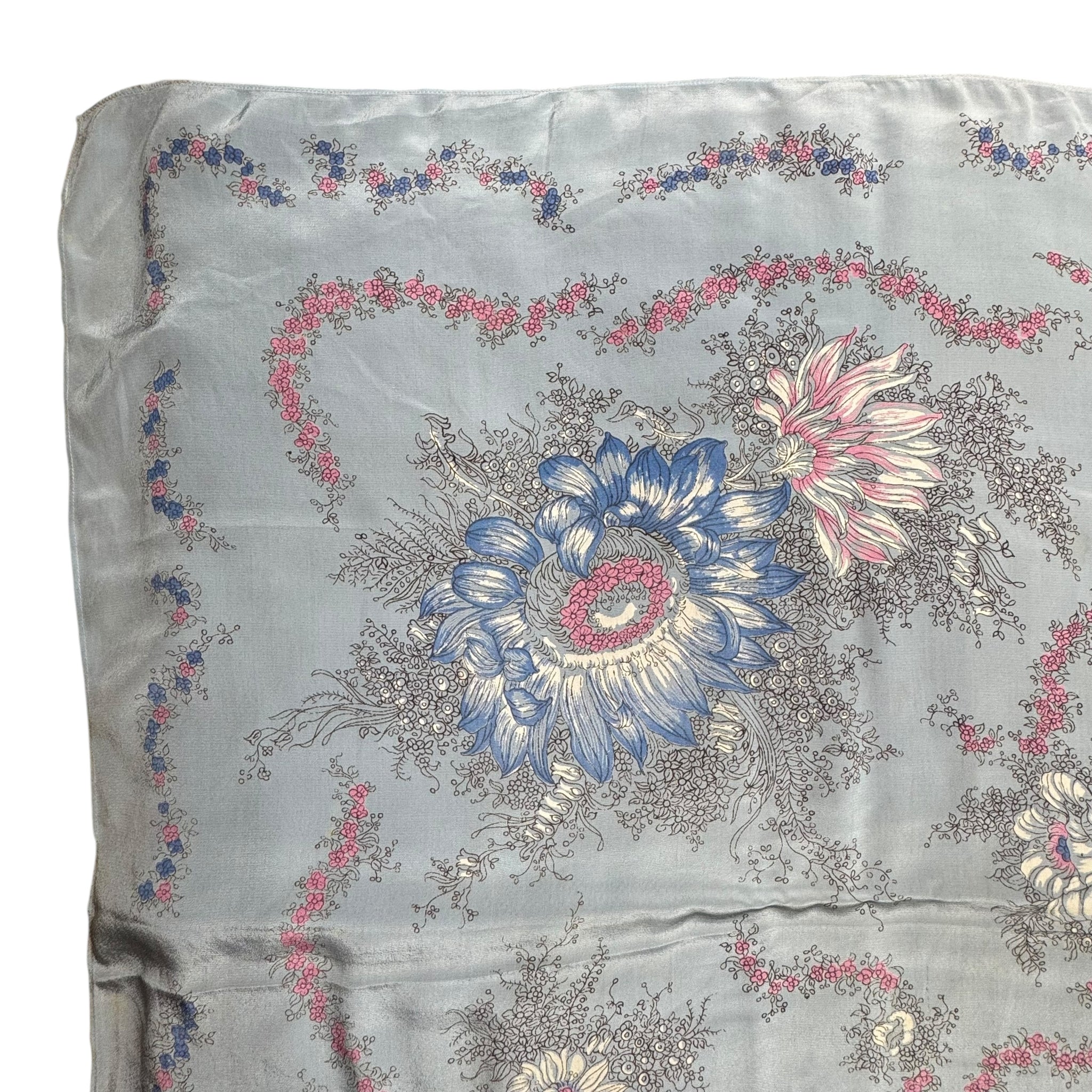 Original 1940's or 1950's Silk Crepe Scarf in Pale Blue with White and Pink Floral - Great Headscarf